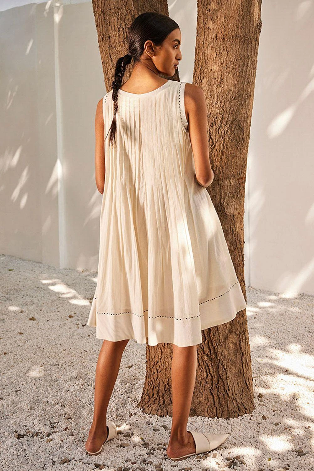 Step into sophistication this our ecru mulmul cotton dress. Intricate pin tucks and hand-embroidered running stitches make it a true work of art.