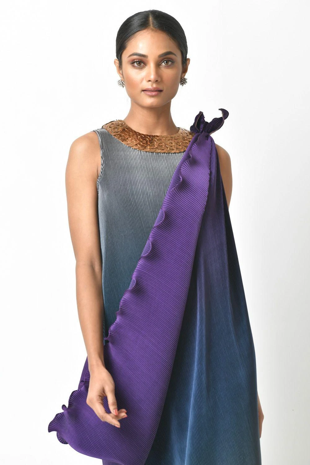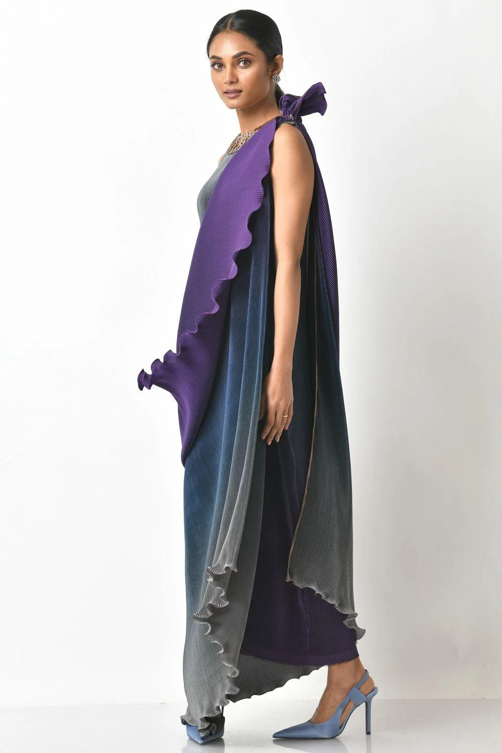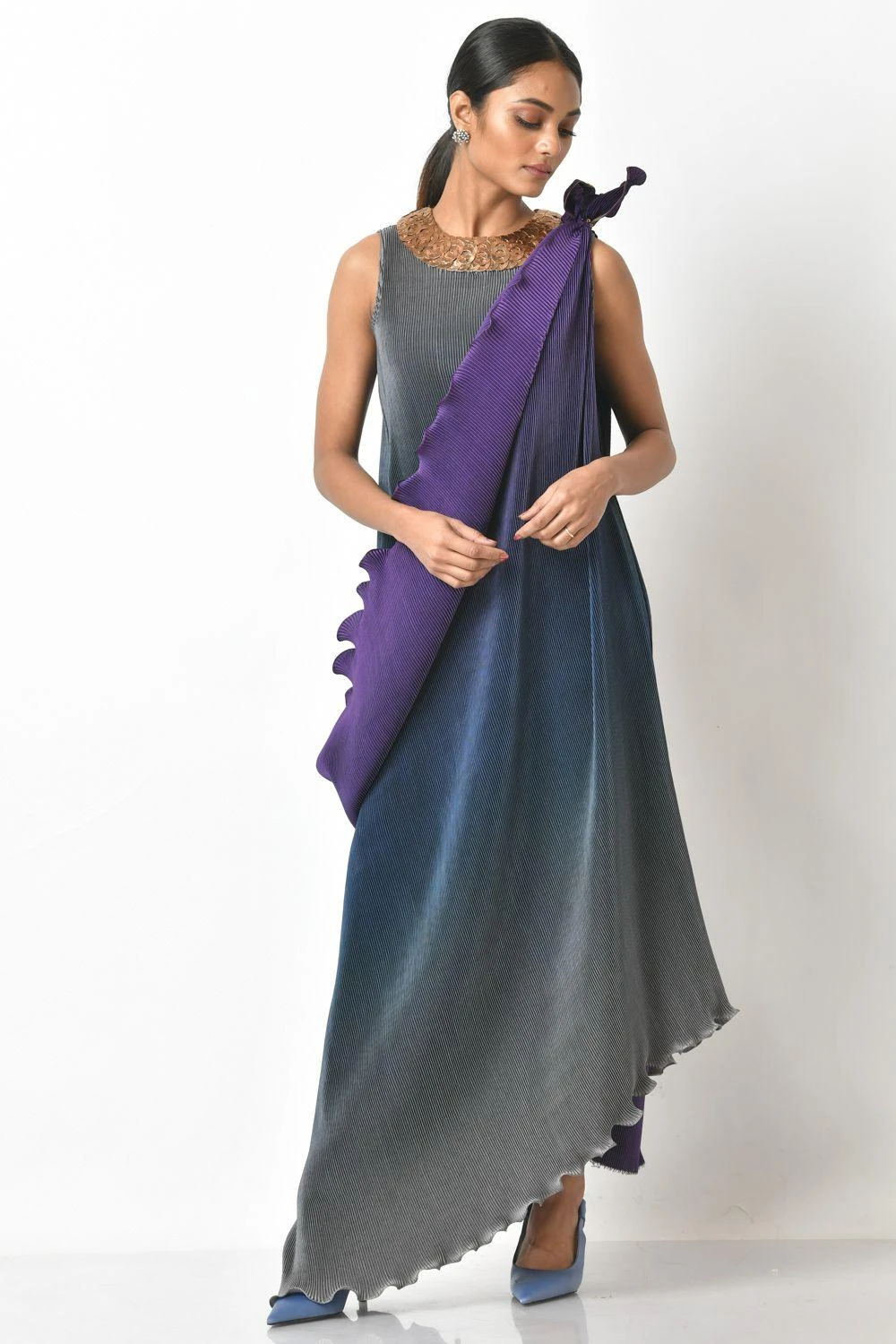 Switch your mainstream occasion wear for this one of a kind grey & purple ombre pleated long dress. It is cut in polyester mix and features embroidery details and one shoulder drape. Style it with a pair of statement earrings.