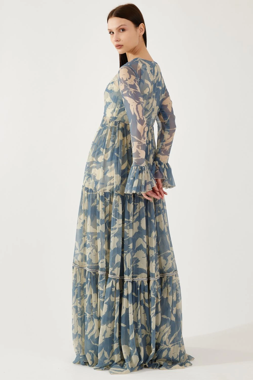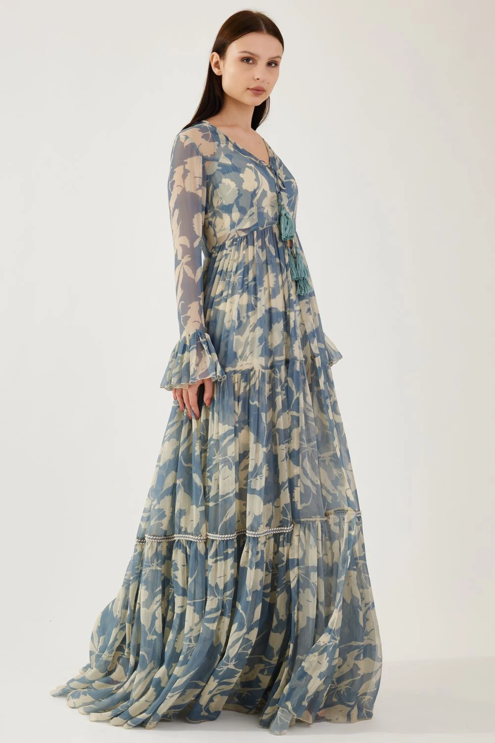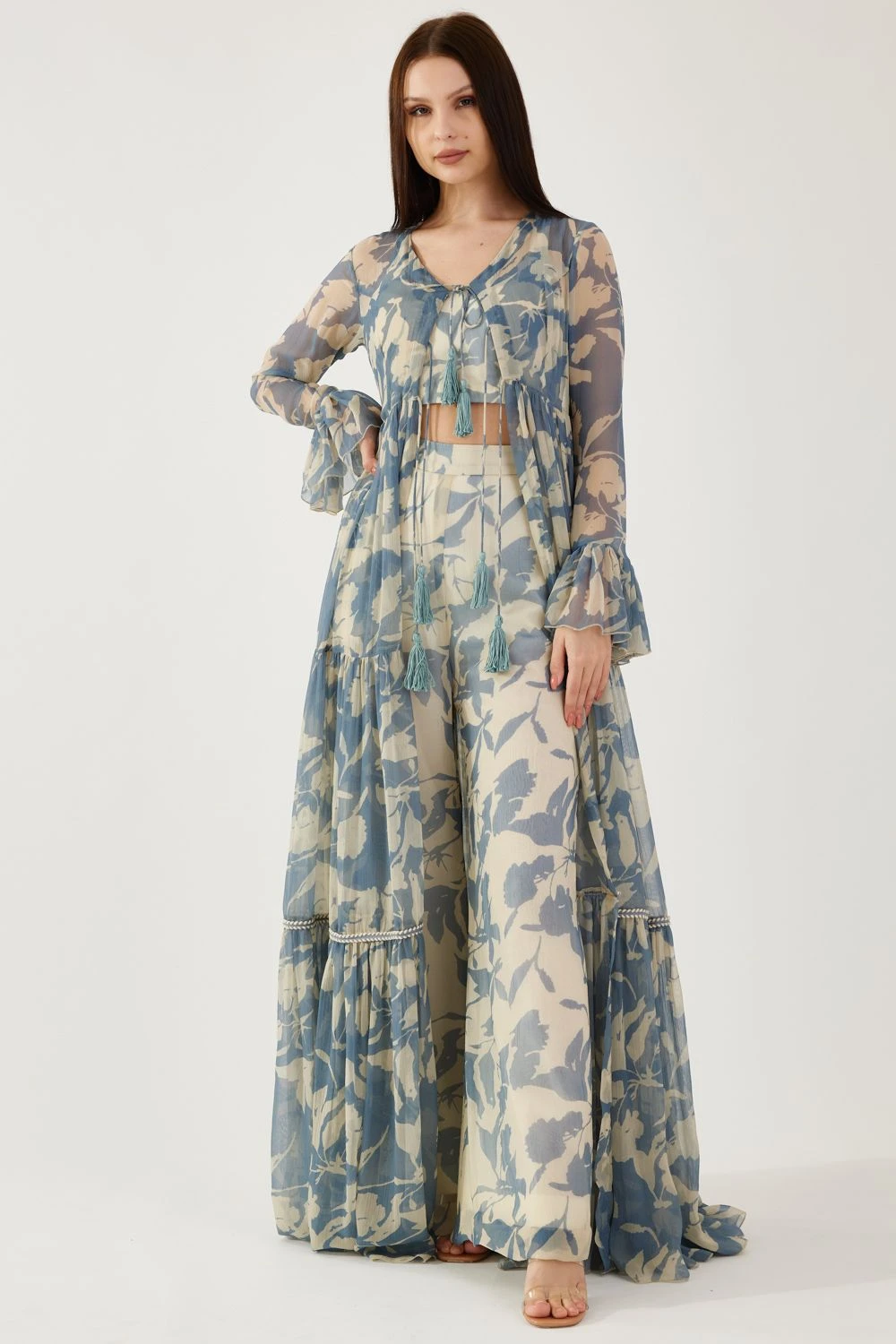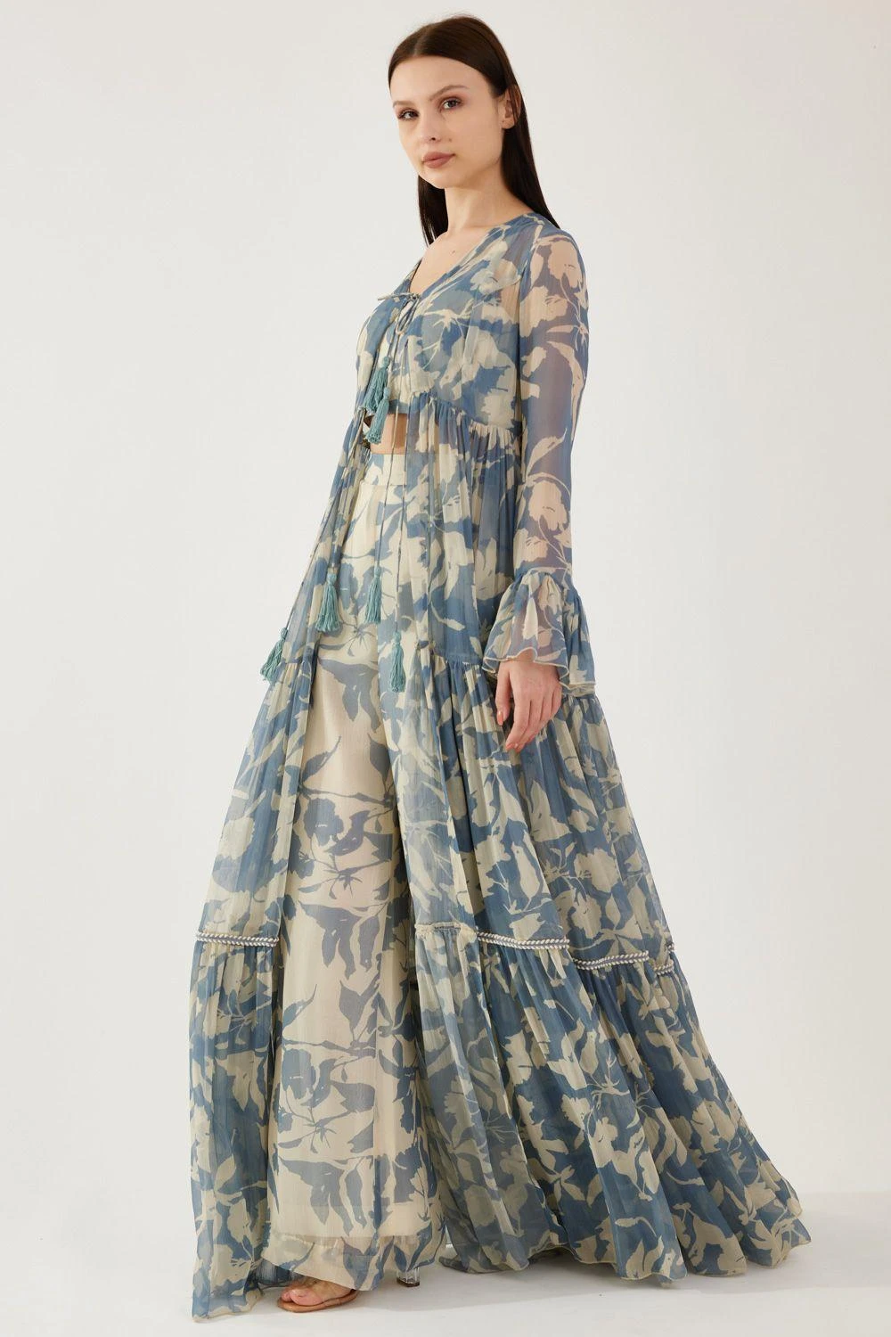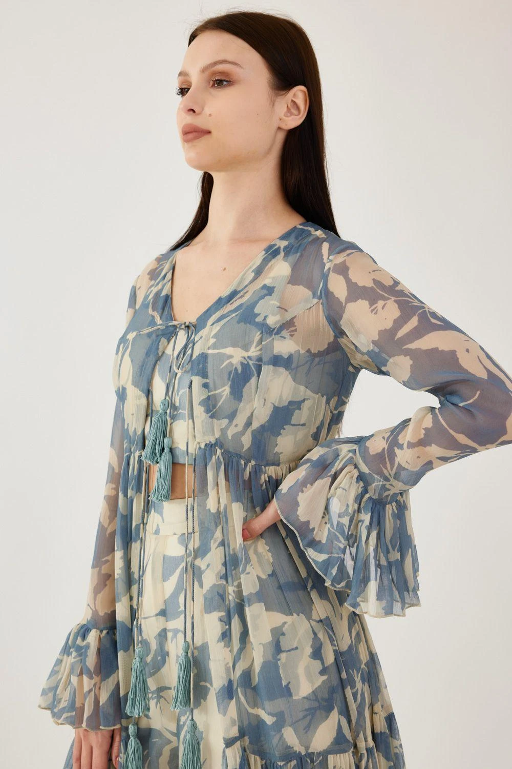 Step into a realm of ethereal beauty with this Cream and Blue Floral Bustier. Delicately adorned with captivating floral motifs, this enchanting piece embraces femininity and grace.