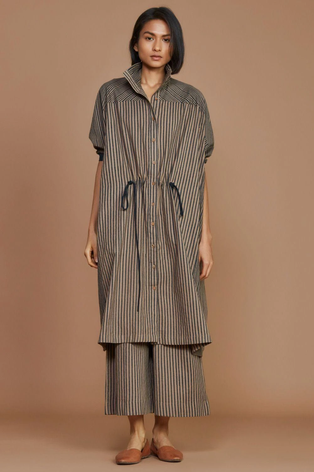 Amp up your summer closet with easy-breezy pieces like this striped kaftan set in handwoven cotton. The kaftan has a relaxed fit with drawstrings at the waist, giving a beautiful cinch and the pants are kept simple with a wide flare.