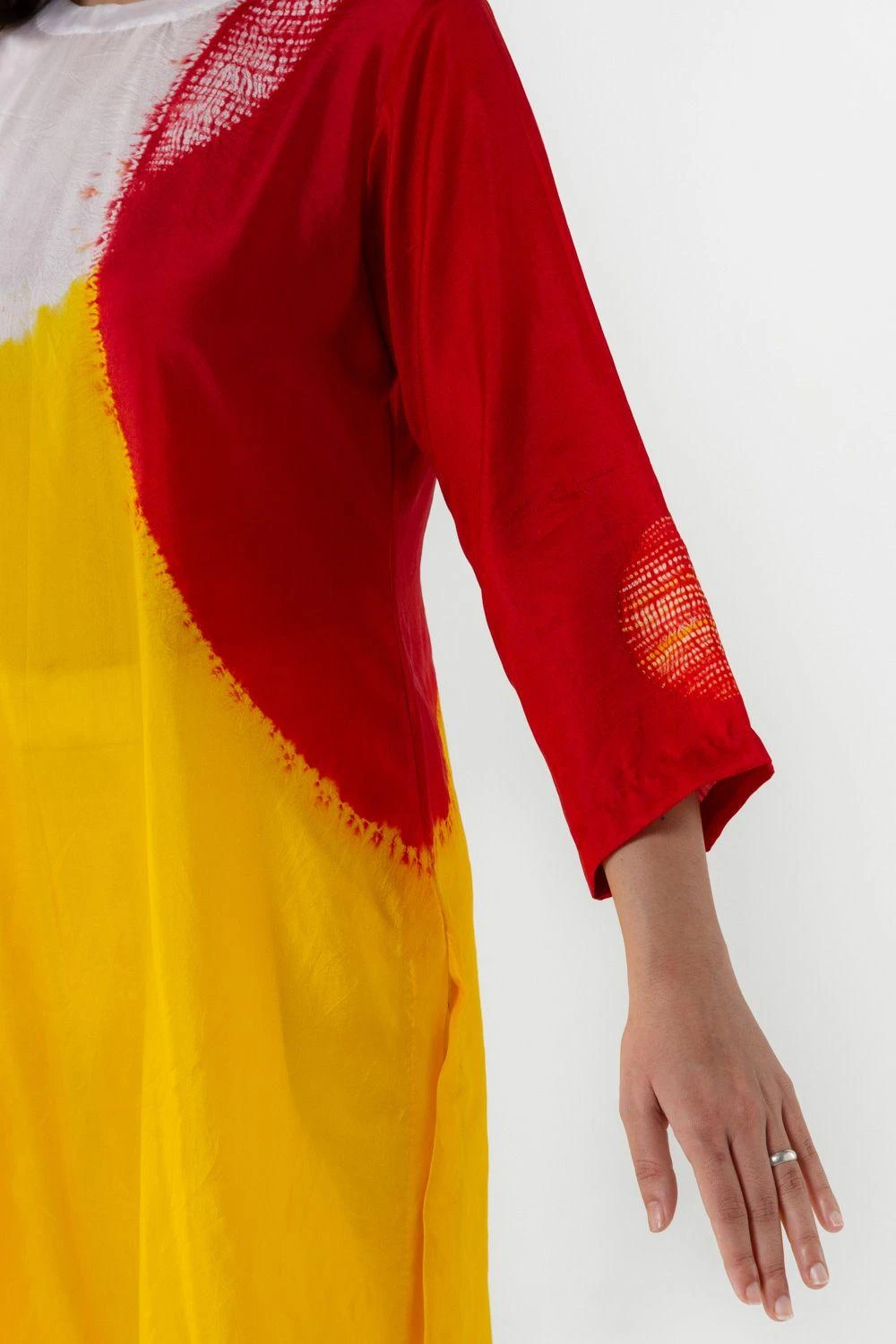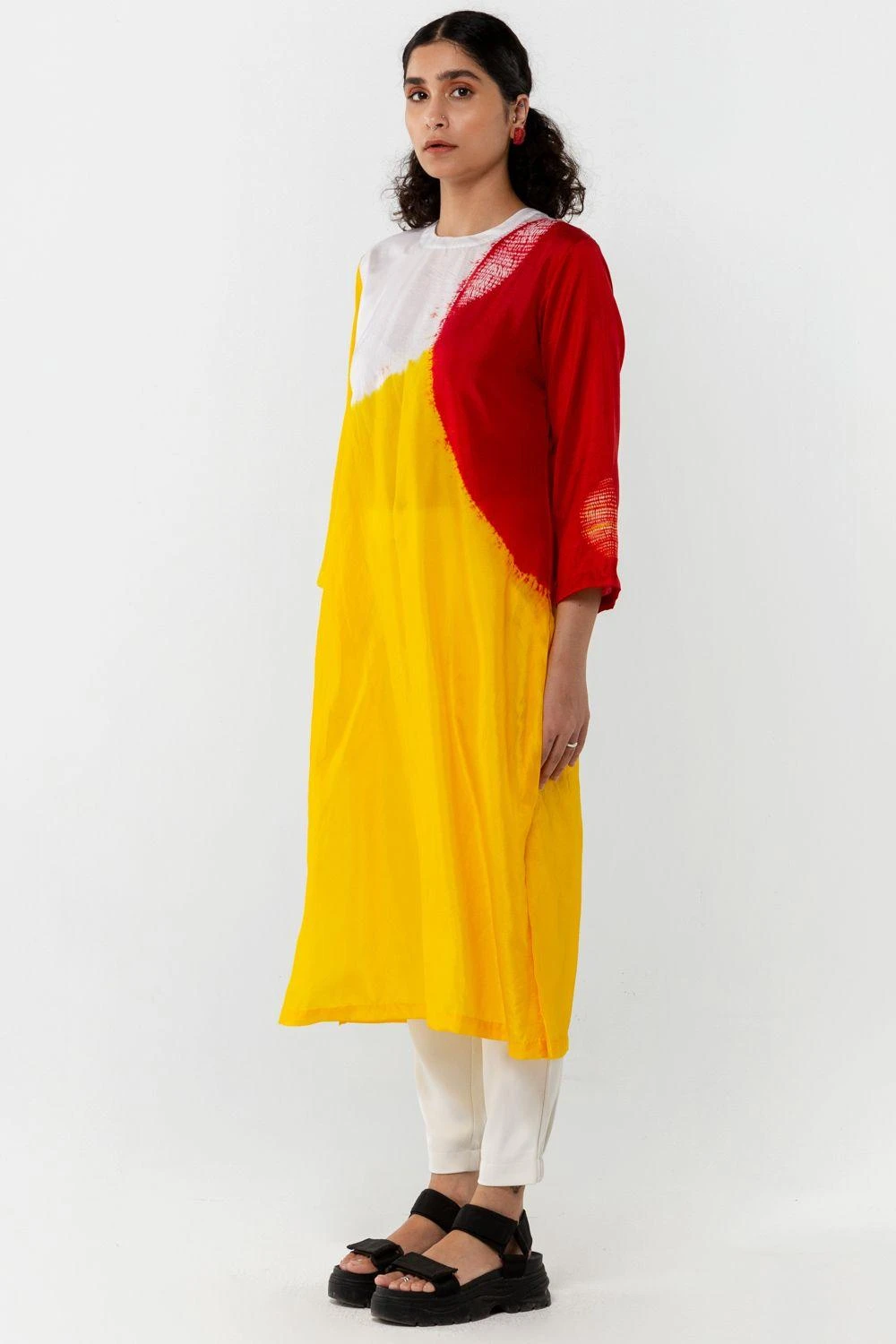 This yellow easy-fit kurta is set in a minimalistic tone while maintaining a strong impact. It is cut in hand woven silk and enhanced with an abstract colour-blocked pattern hand-dyed in chrome & red.