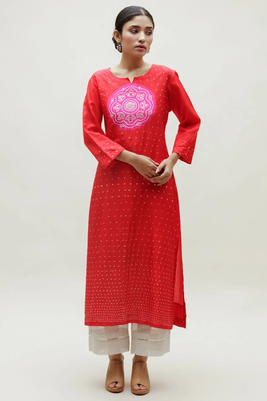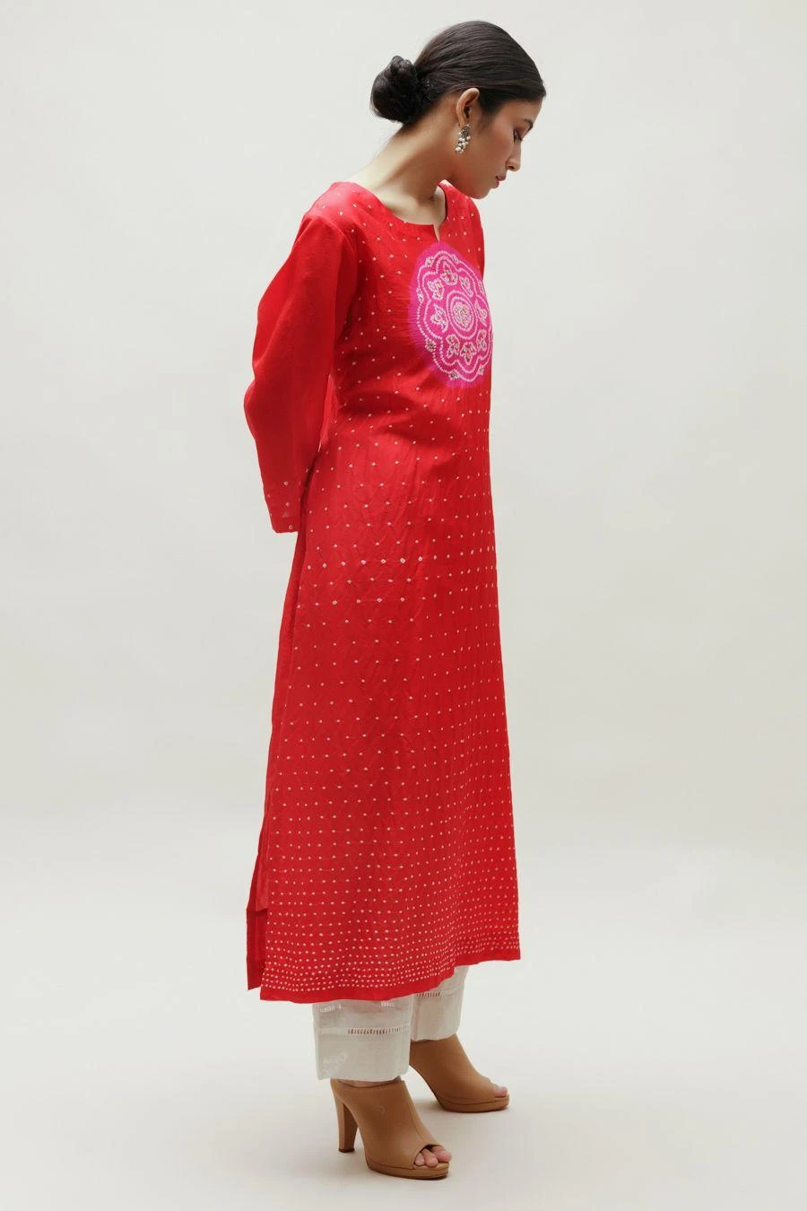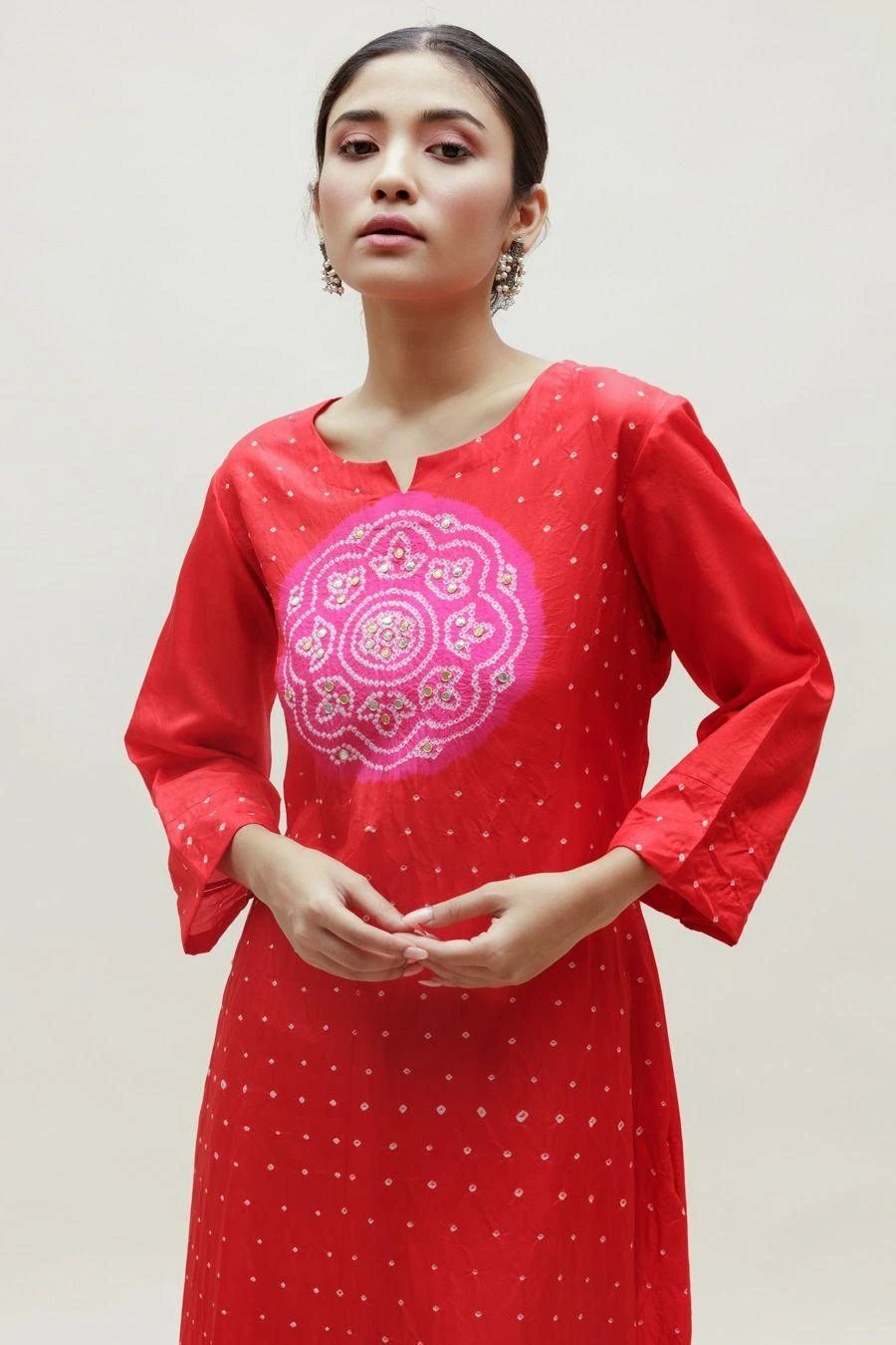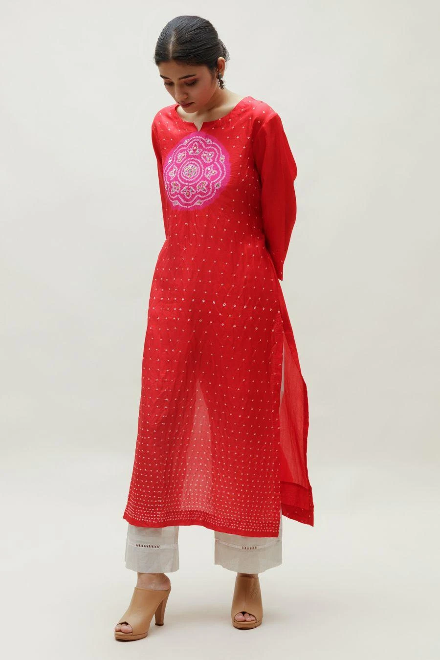 Naina Jain’s collection reimagines the age-old craft of bandhani. The perfect amalgamation of style & comfort, this Bandhani on pure silk kurta features a rani circle yoke on a red base highlighted with hand gota patti work.