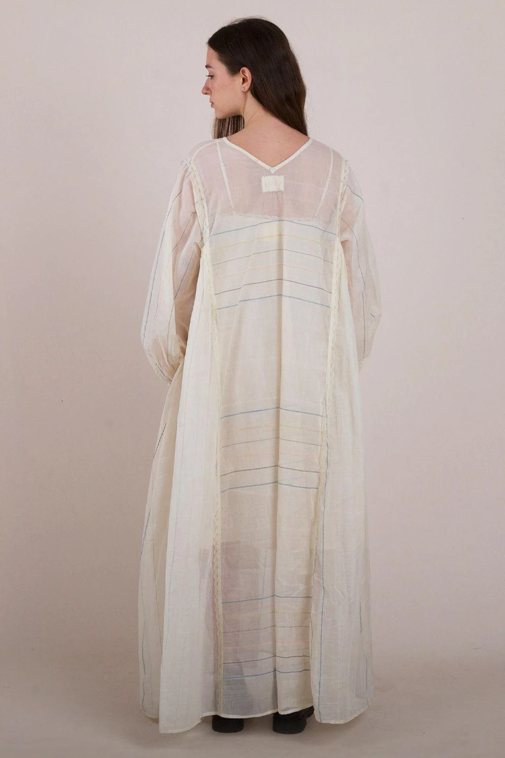 Step into the realm of sheer elegance with this semi-sheer dress. Adorned with gathered sides & bishop sleeves, it exudes a graceful charm. The intricate lace detailing adds a touch of refinement, while the side pockets offer convenience.
