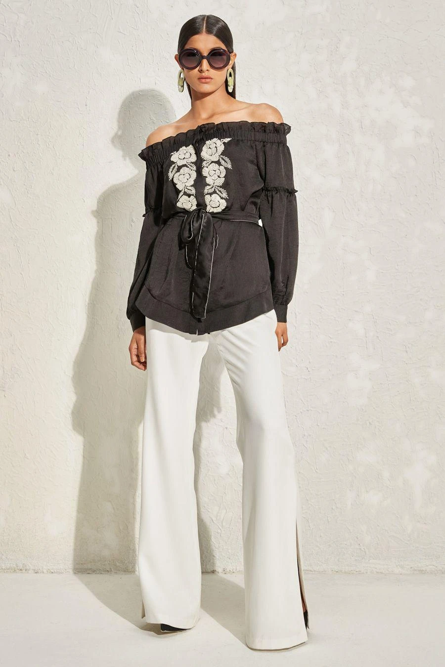 Look effortlessly stylish with this black top. Crafted in a sandwash fabric, this off shoulder top features floral hand embellished details all over. Pair this top with flared white pants to complete the set.
