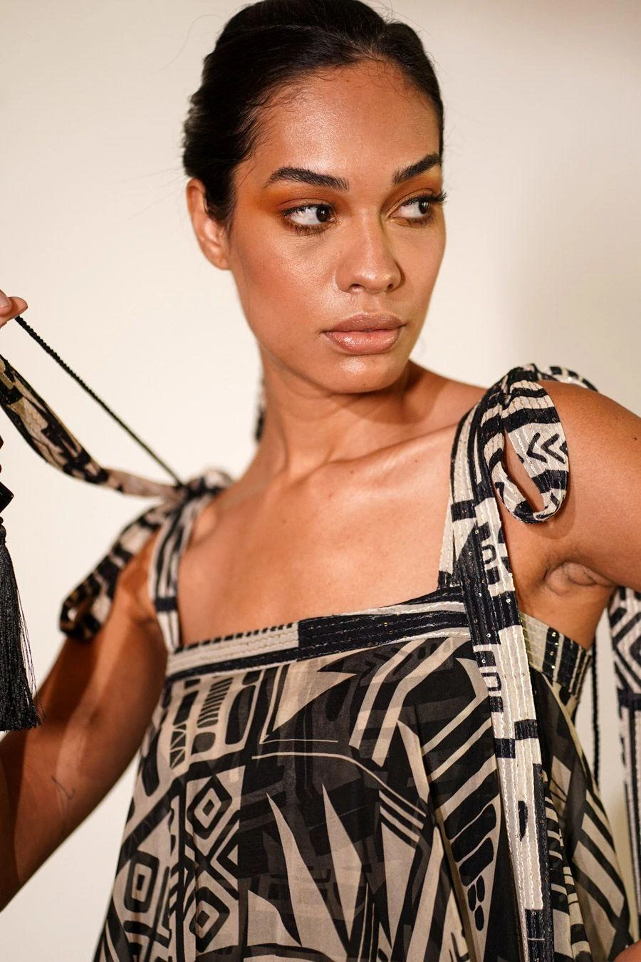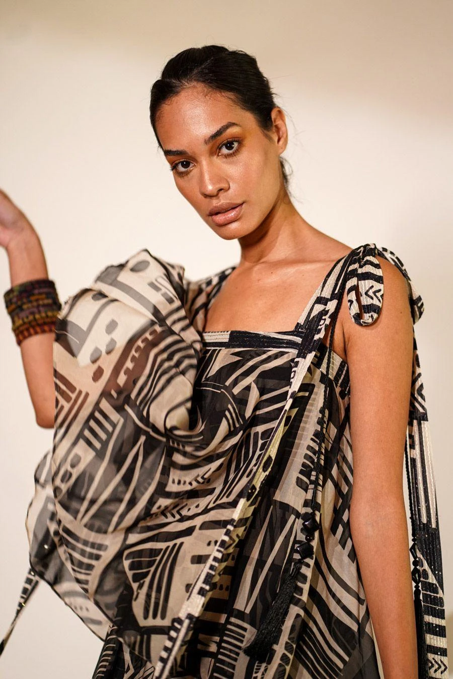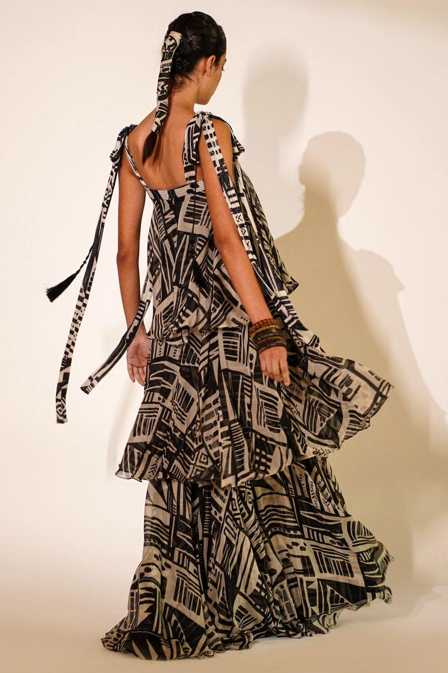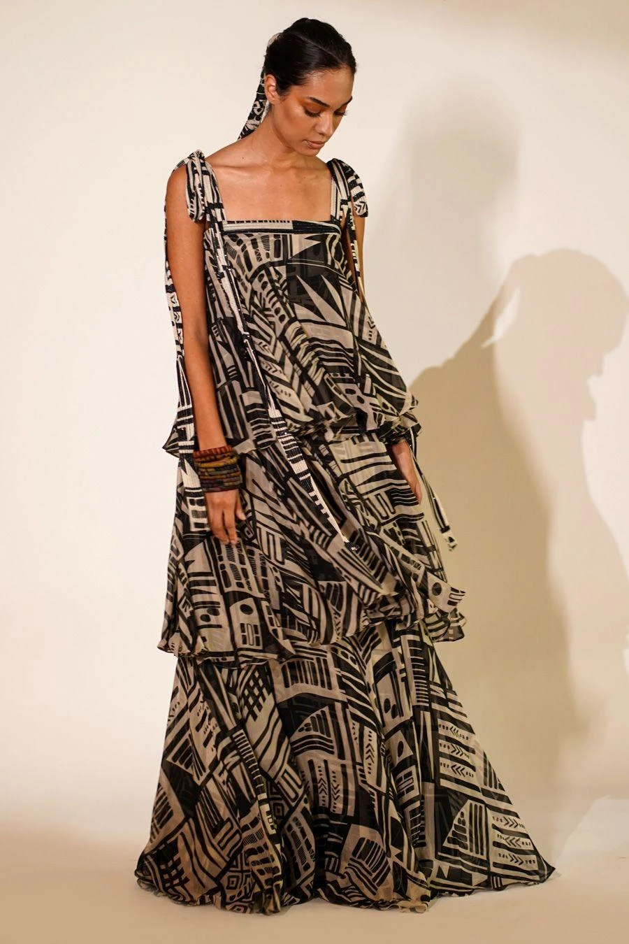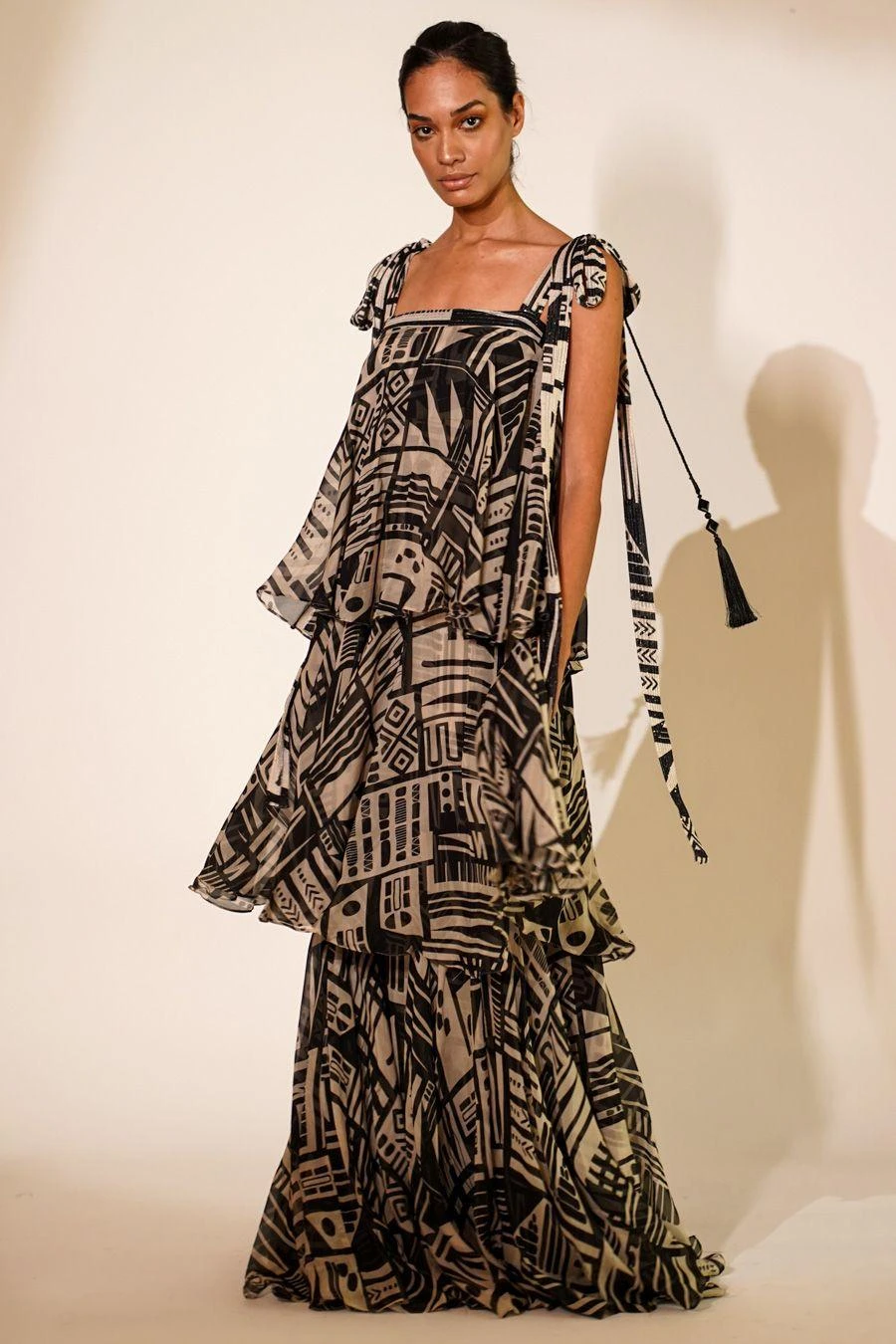 Add a layer of statement and glamour to your resort getaways with this black dress. Crafted in organza, this tiered maxi dress features an abstract print all over.