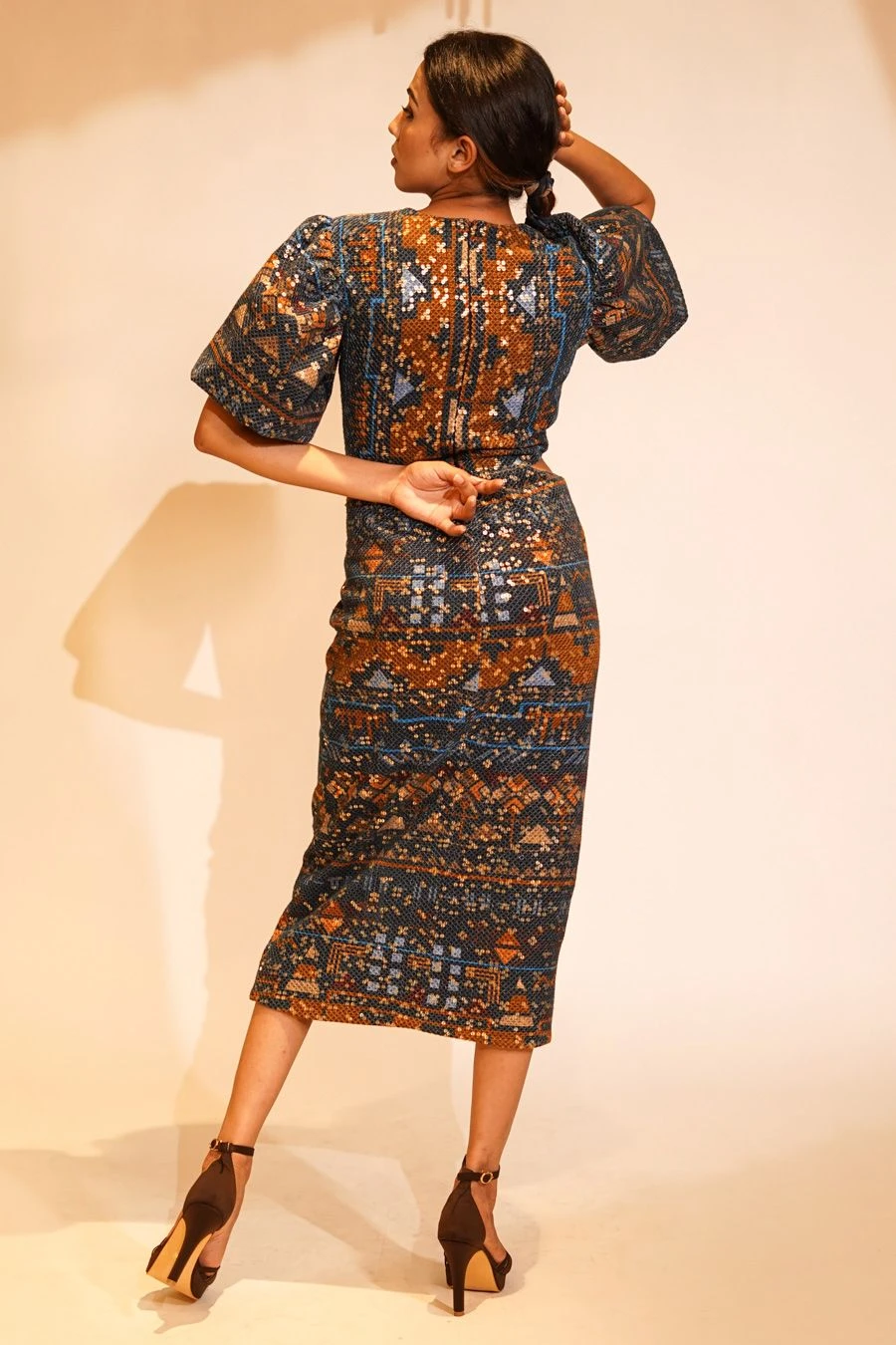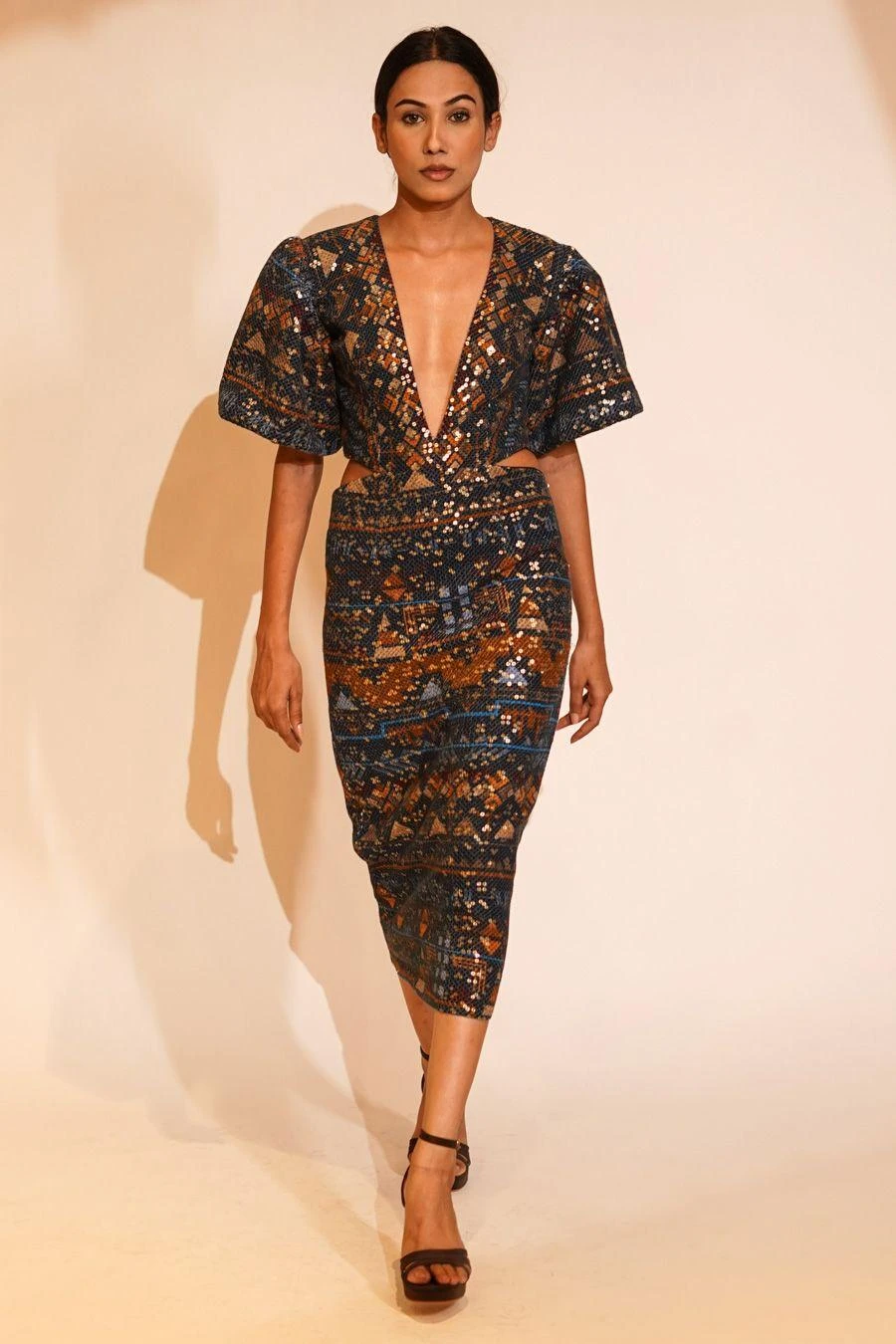 Add a layer of statement and glamour to your resort getaways with this blue dress. Crafted in georgette, this plunge neck dress features an abstract print all over. Add a pair of dangler earrings to complete the look.