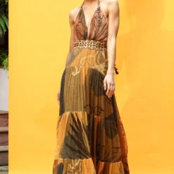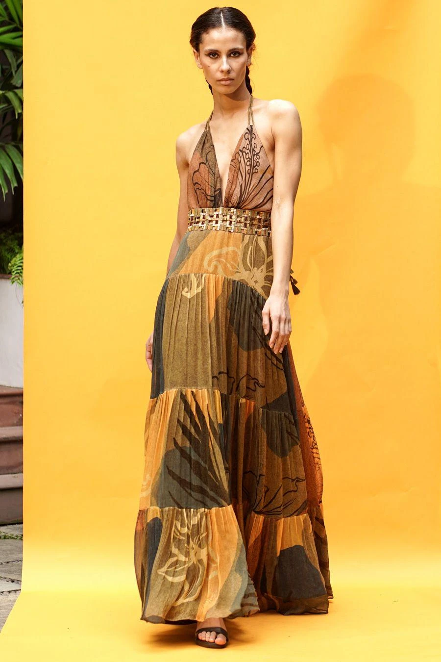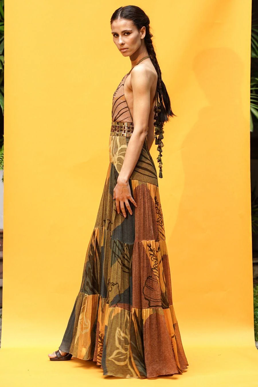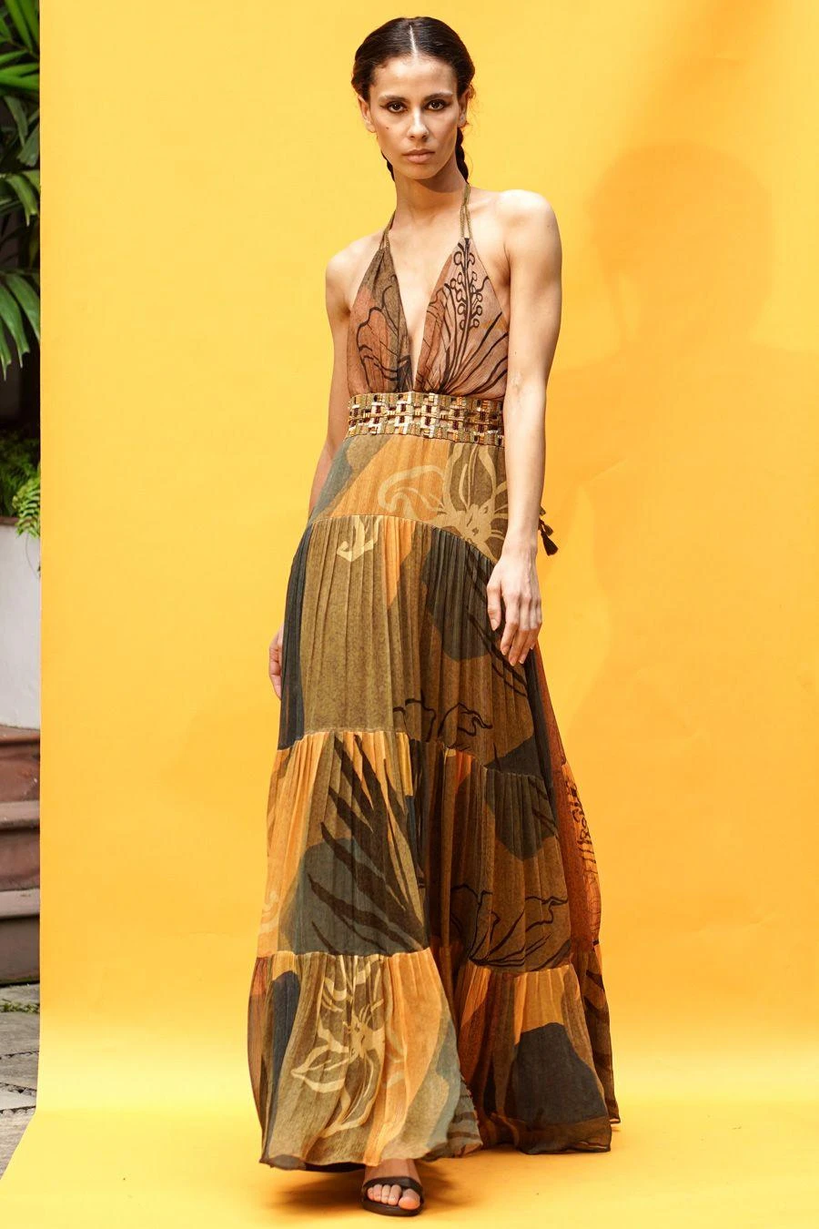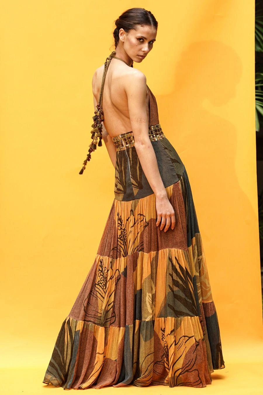 From dramatic Amazonian foliage to bold tribal-esque details, Nikita Mhaisalkar’s runway collection sings the song of the forest and all its life forms. Crafted in chiffon, this maxi dress features African baroque hand embroidered details.