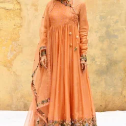 Uncomplicated & fuss-free, this set is a great pick for daytime festivities. Crafted in handwoven benarasi silk, this set features a hand embroidered angrakha highlighted with handmade 3D rosettes & paired with a dupatta & pants.
