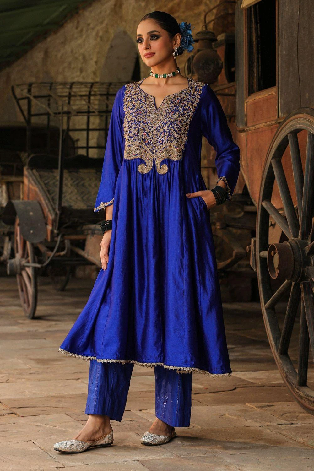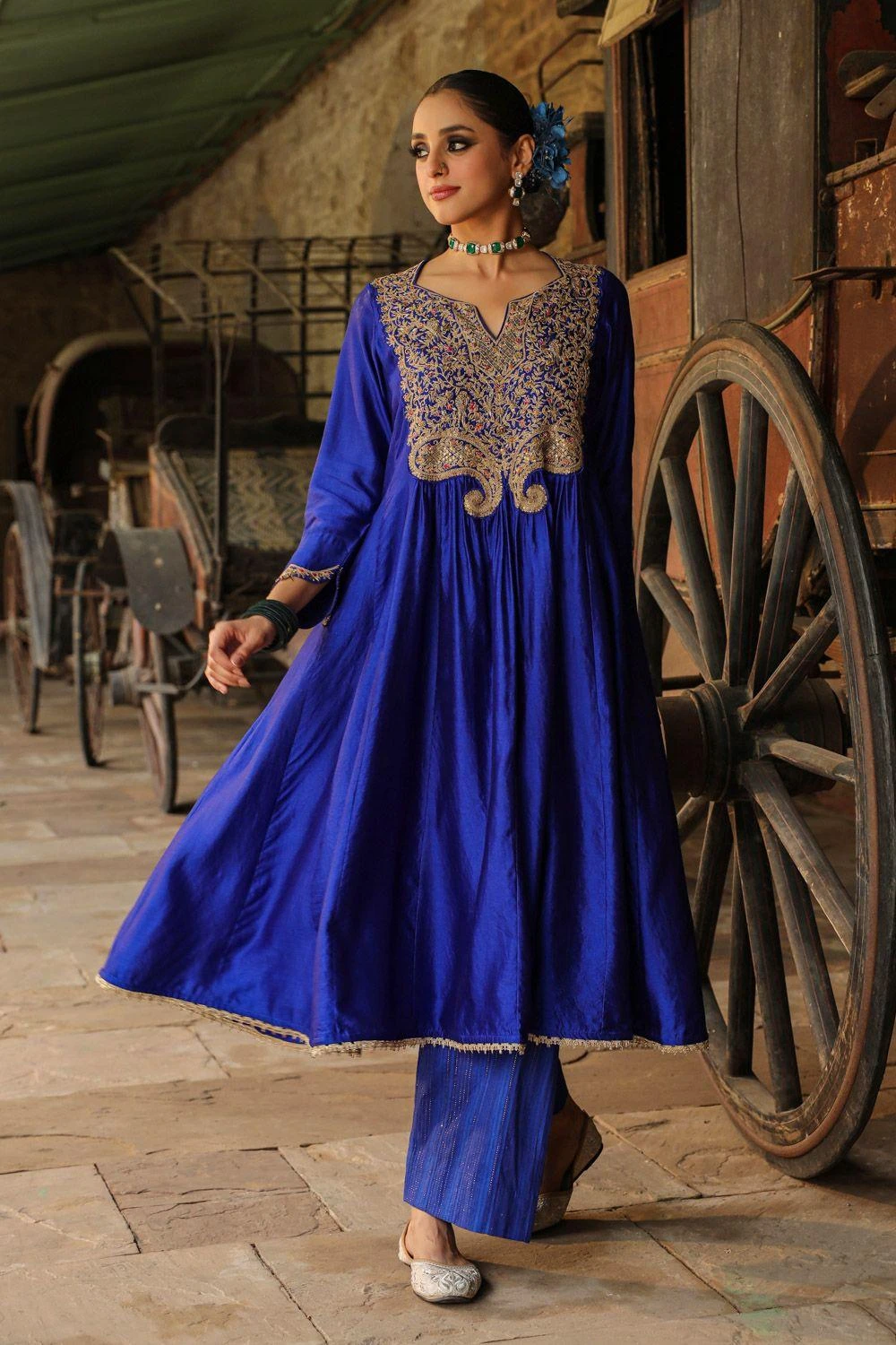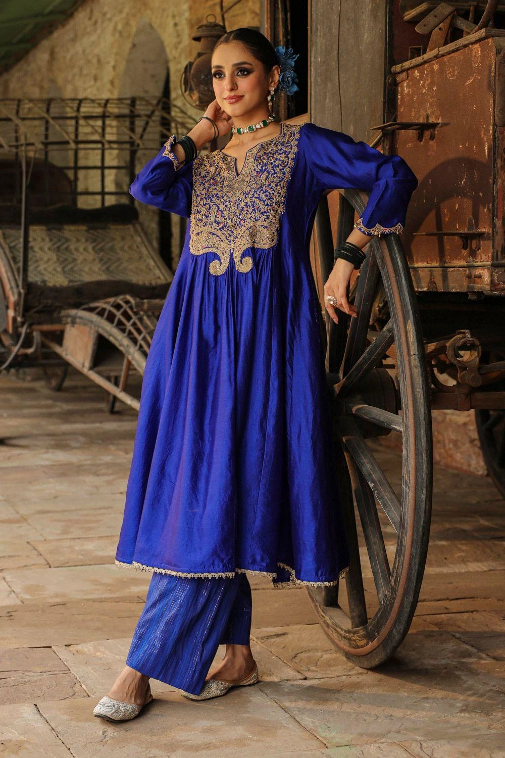 In the grand tapestry of luxury, she adorned the 2-piece silk choga setùa masterpiece of embroidered opulence. Zari dori, resham & tikkis danced on the yoke, while golden weave graced the palazzo. An optional dupatta, a delight upon request.