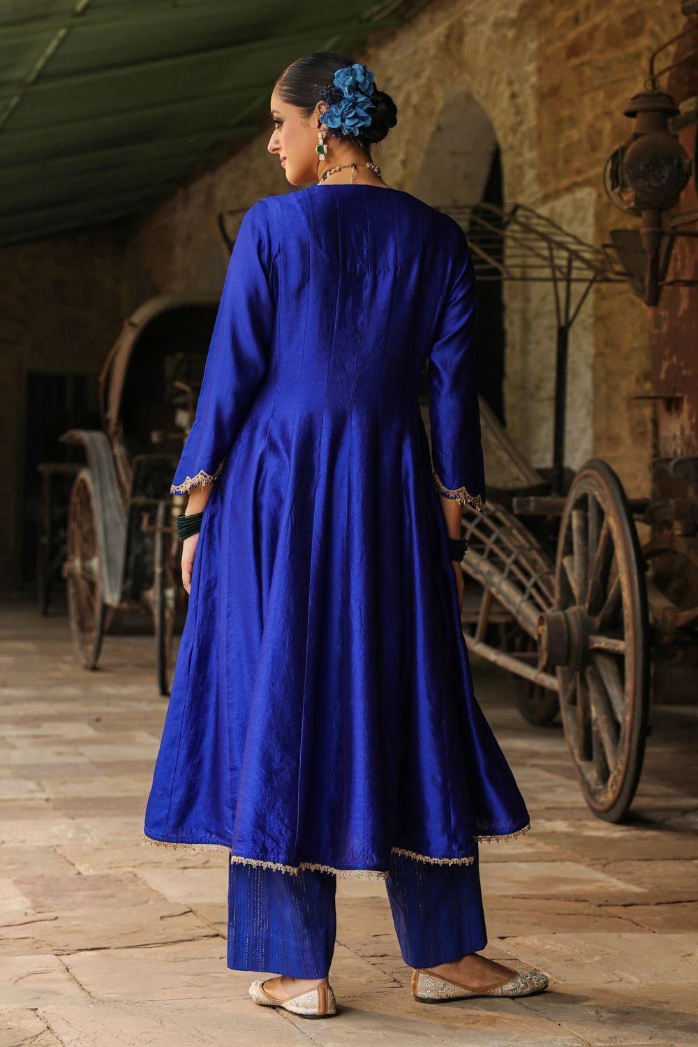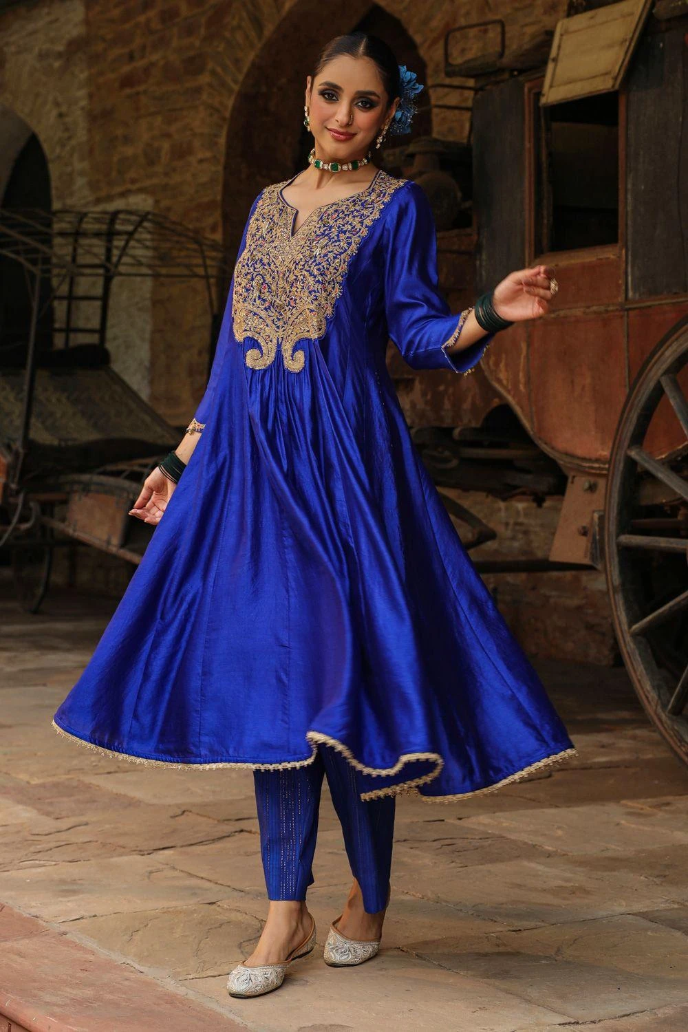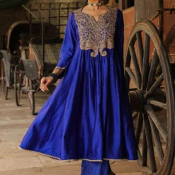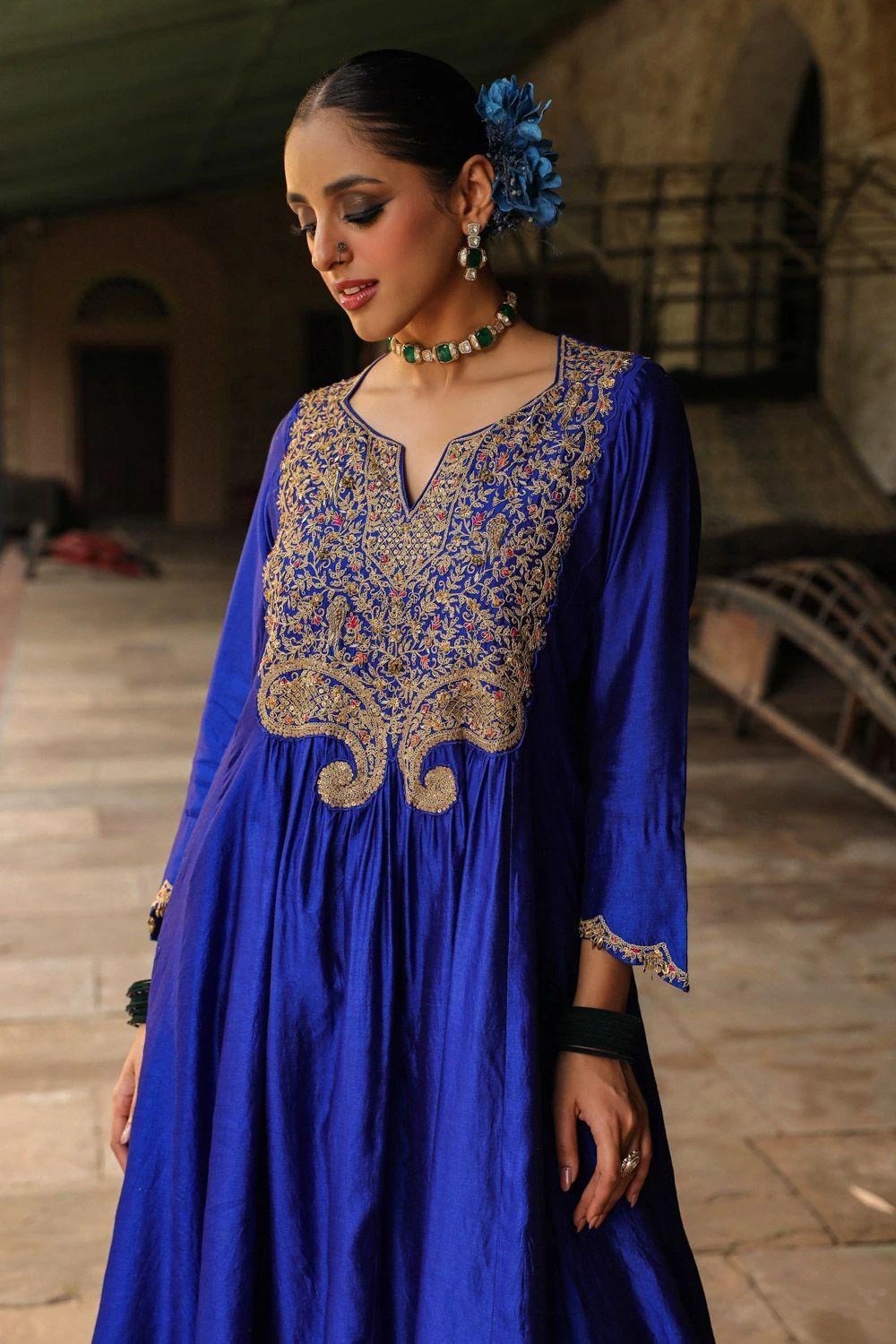 In the grand tapestry of luxury, she adorned the 2-piece silk choga setùa masterpiece of embroidered opulence. Zari dori, resham & tikkis danced on the yoke, while golden weave graced the palazzo. An optional dupatta, a delight upon request.