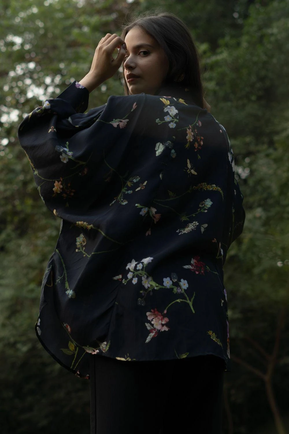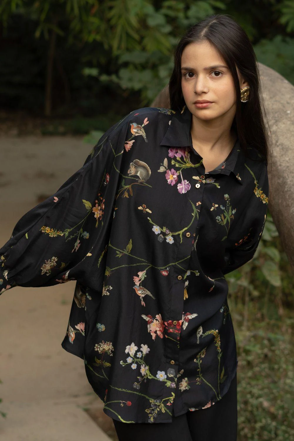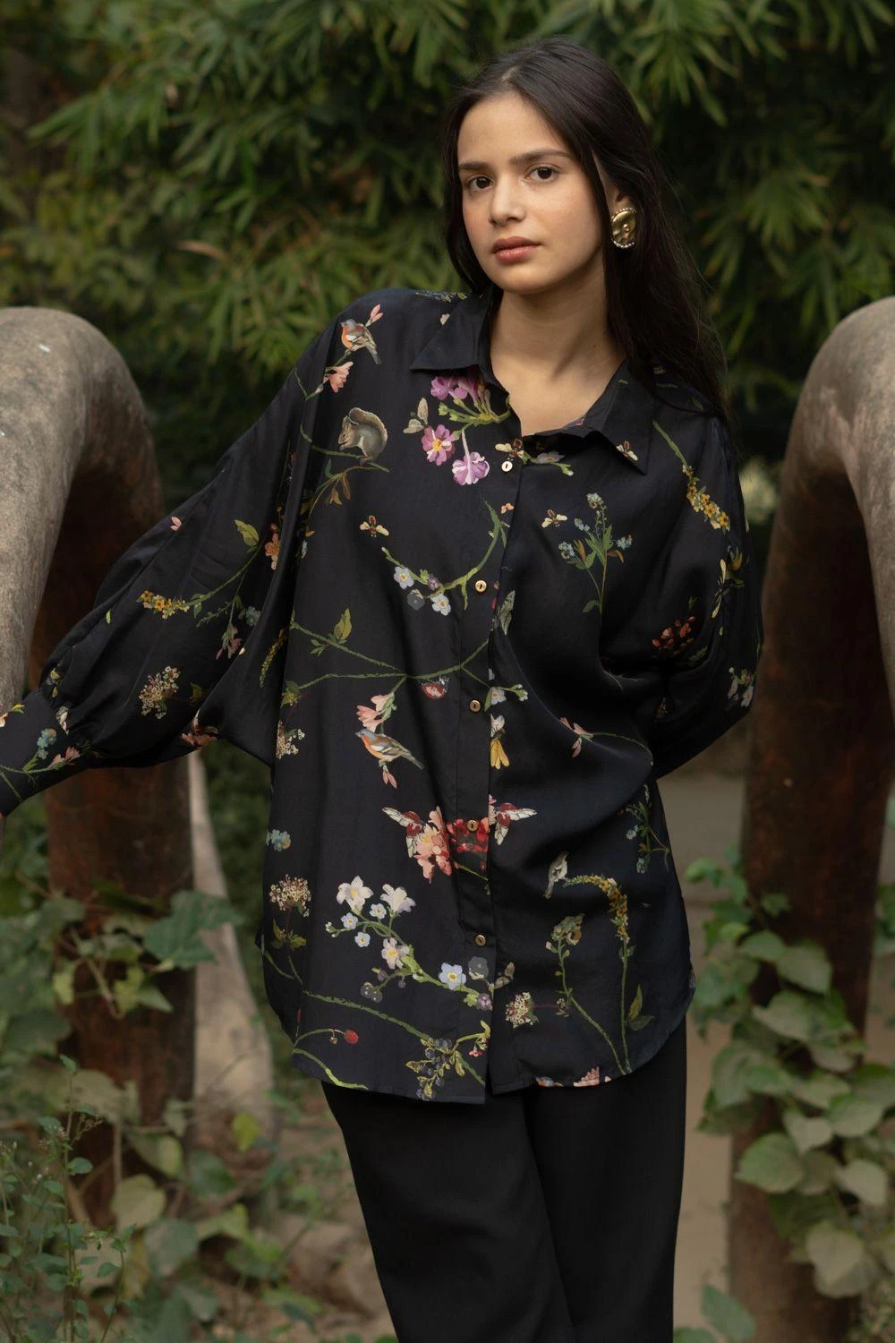 In the tapestry of elegance, the oversized silk shirt unfoldsùa canvas of artistry, adorned with signature brass buttons. Dolman sleeves embrace chic comfort. An enchanting choice for outings & leisurely brunches. Elevate your moments with grace.