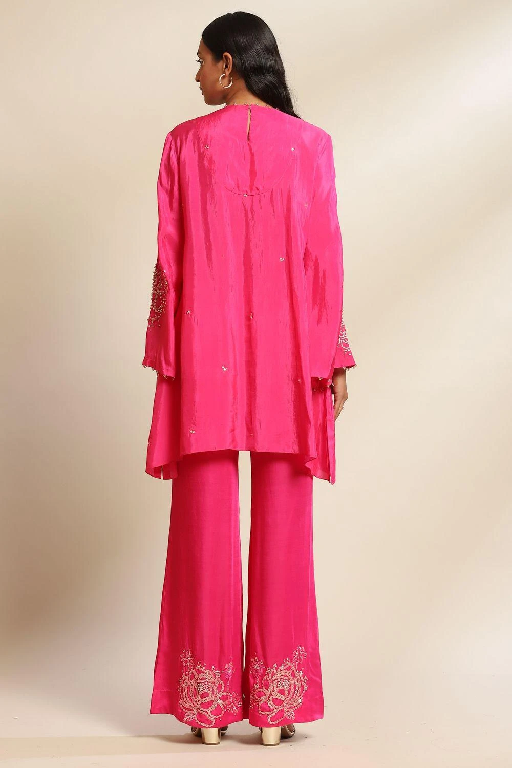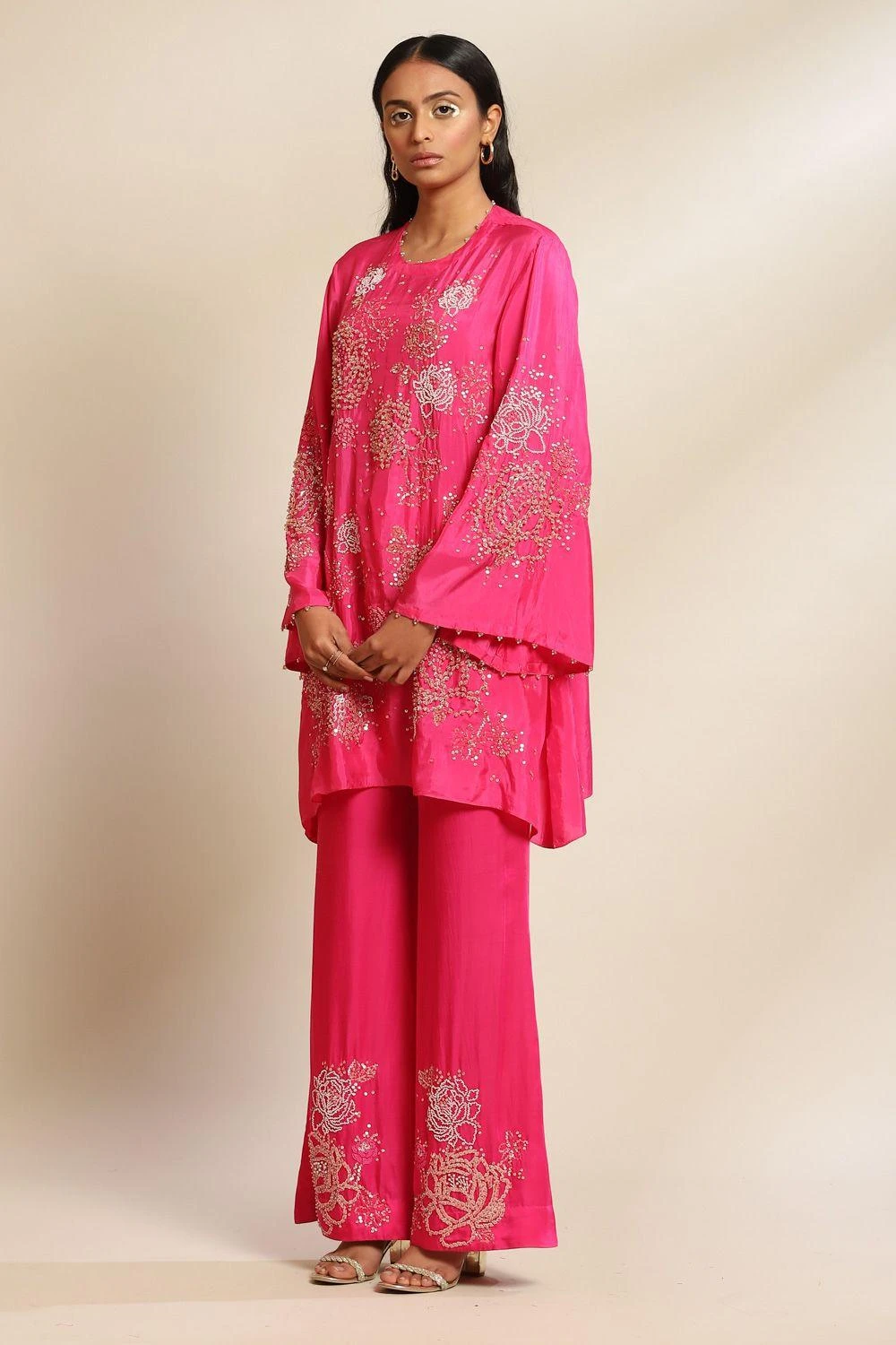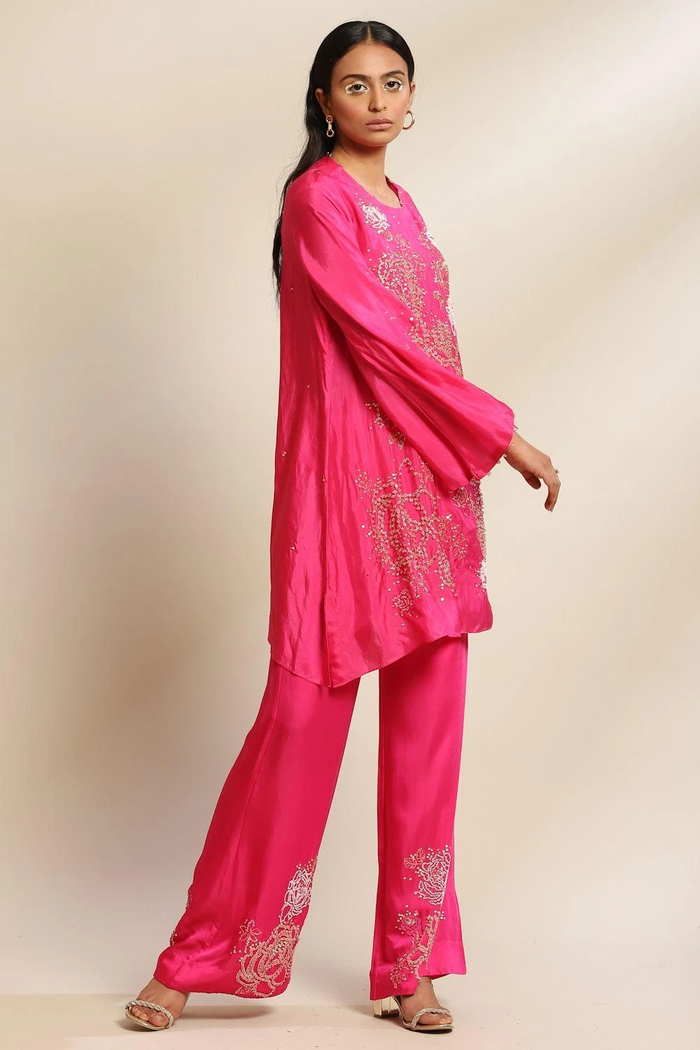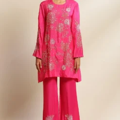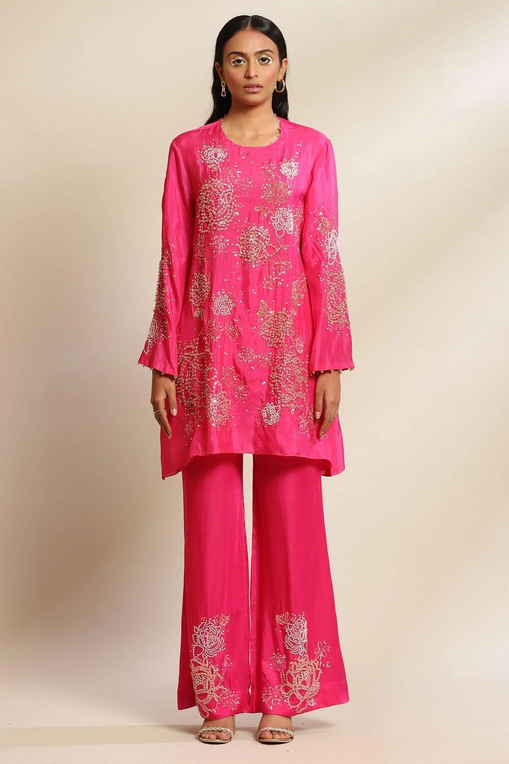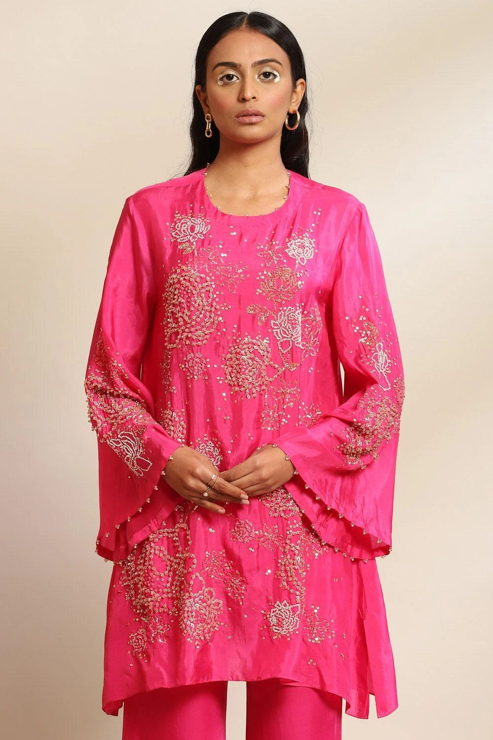 Step into elegance with this floral viscose printed silk kurta. Its floral embroidery, adorned with sequins and beads, creates a captivating allure. Add a pair of statement earrings to complete the look.