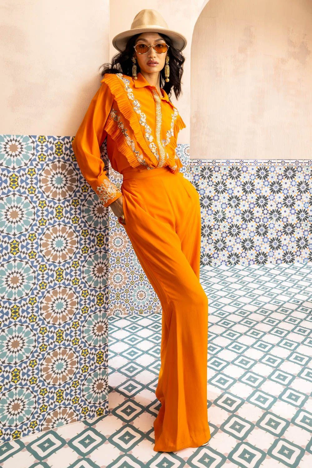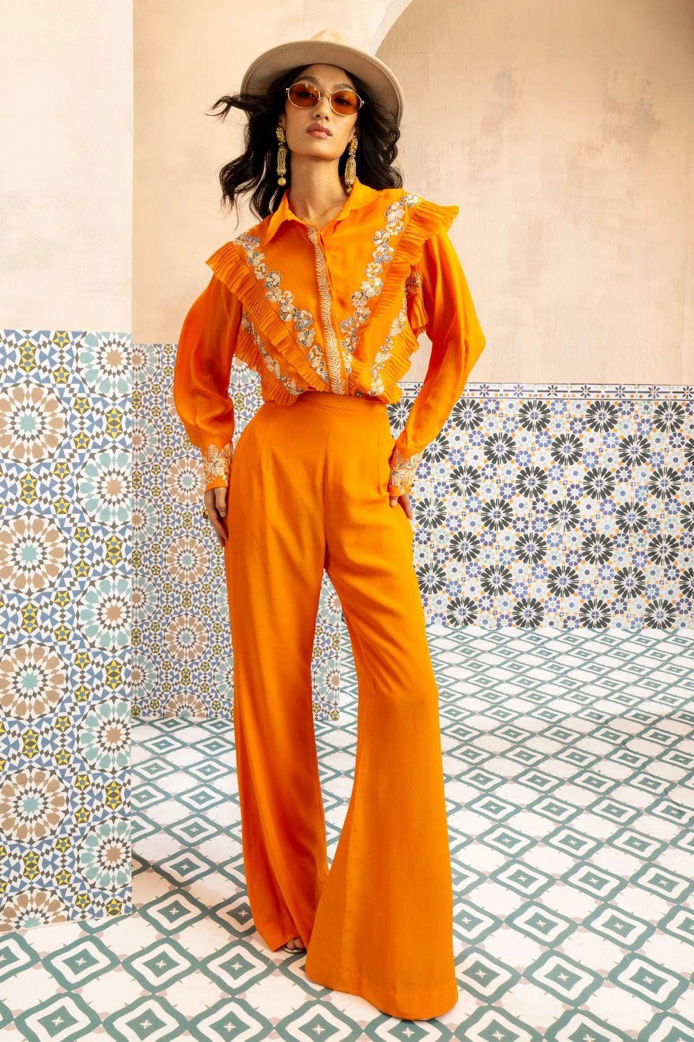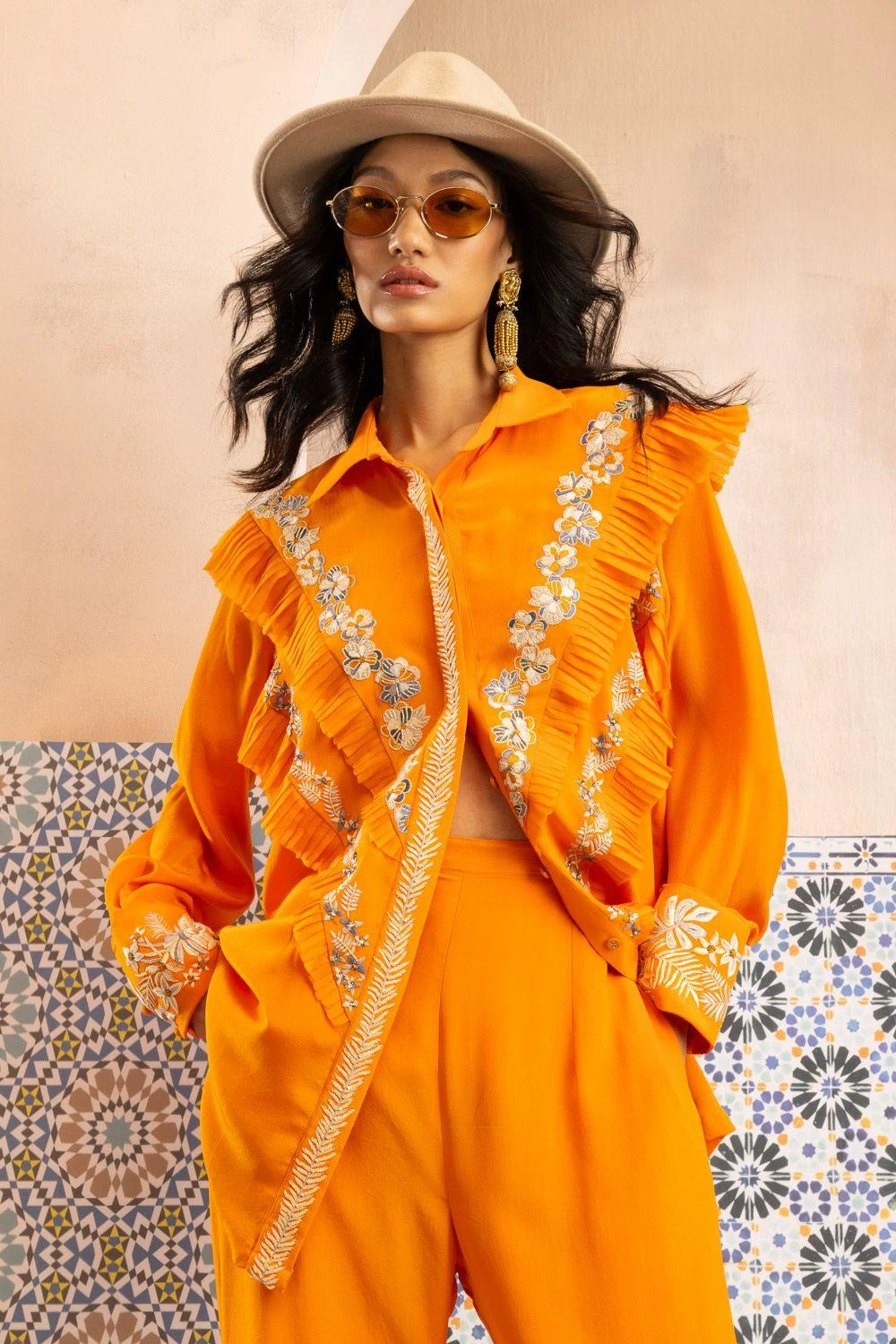 Look effortlessly stylish with this shirt. Crafted in silk crepe, this sunset orange shirt features Parsi gara embroidery with accents of ivory katdana & delicate techniques like French knots and bullion knots,
