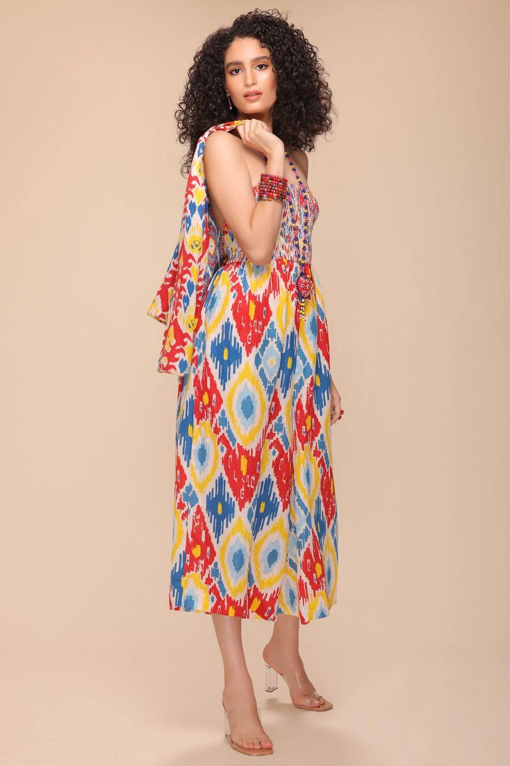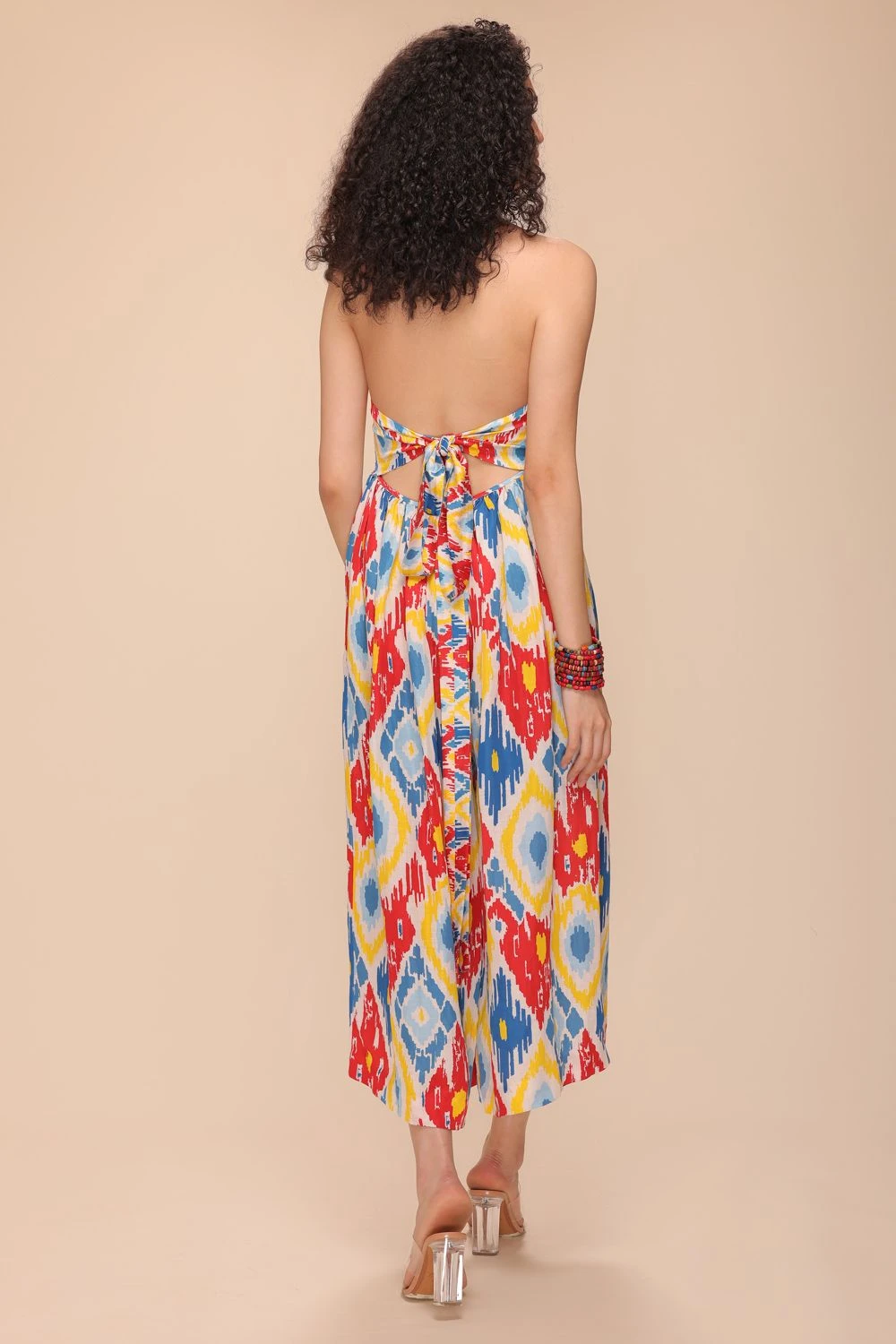 Immerse yourself in the world of exquisite fashion with this jumpsuit featuring a beautifully smocked bodice, epitomizing refined elegance. The tie back detail adds a touch of sophistication, while the side pockets provide both functionality & style.