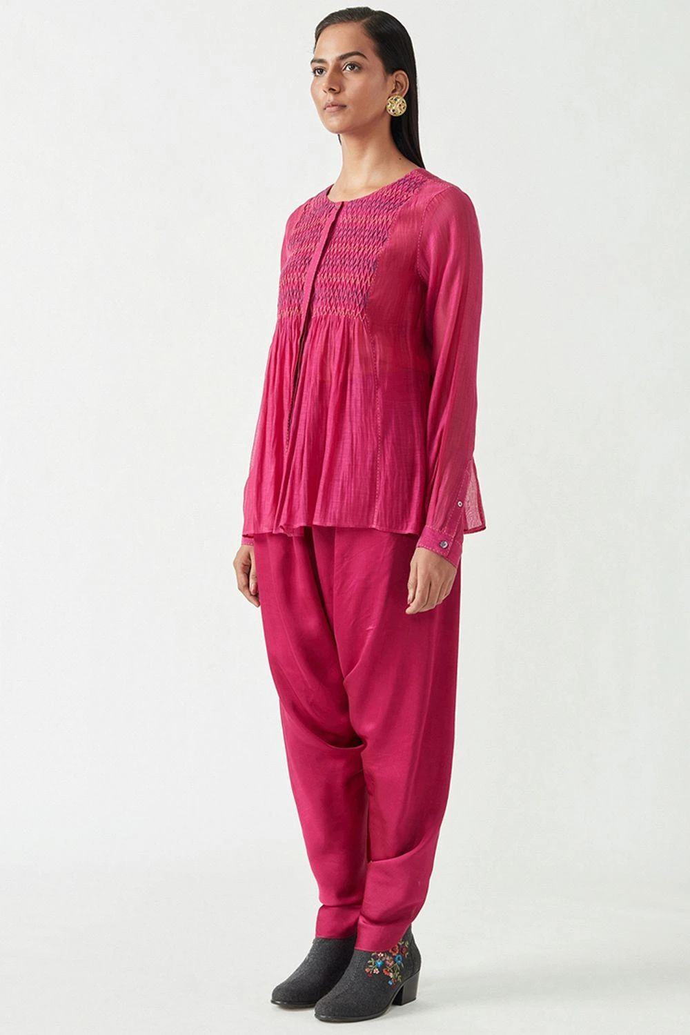 This fuchsia round neck top is a great piece for your everyday looks. It is cut in premium cotton silk fabric with front smocking details and comes with a slip. Style it with a pair of culottes.