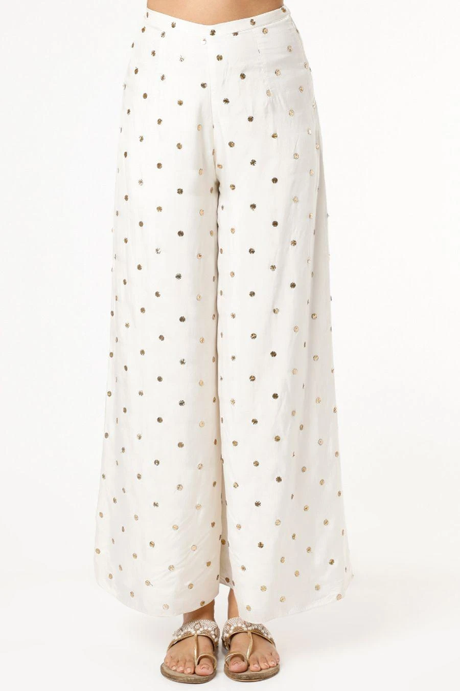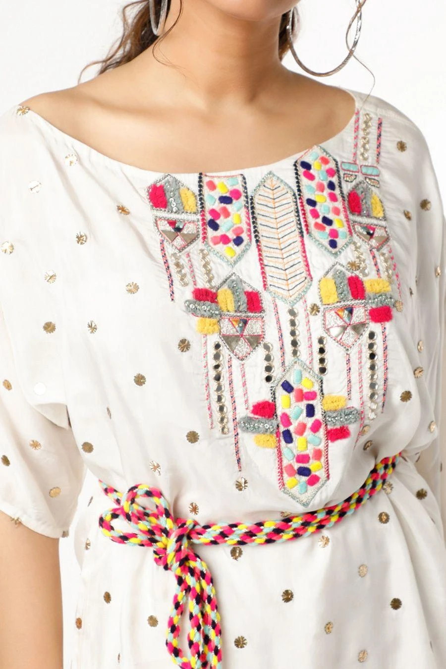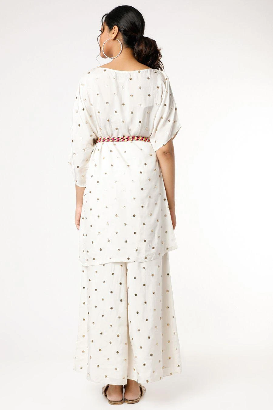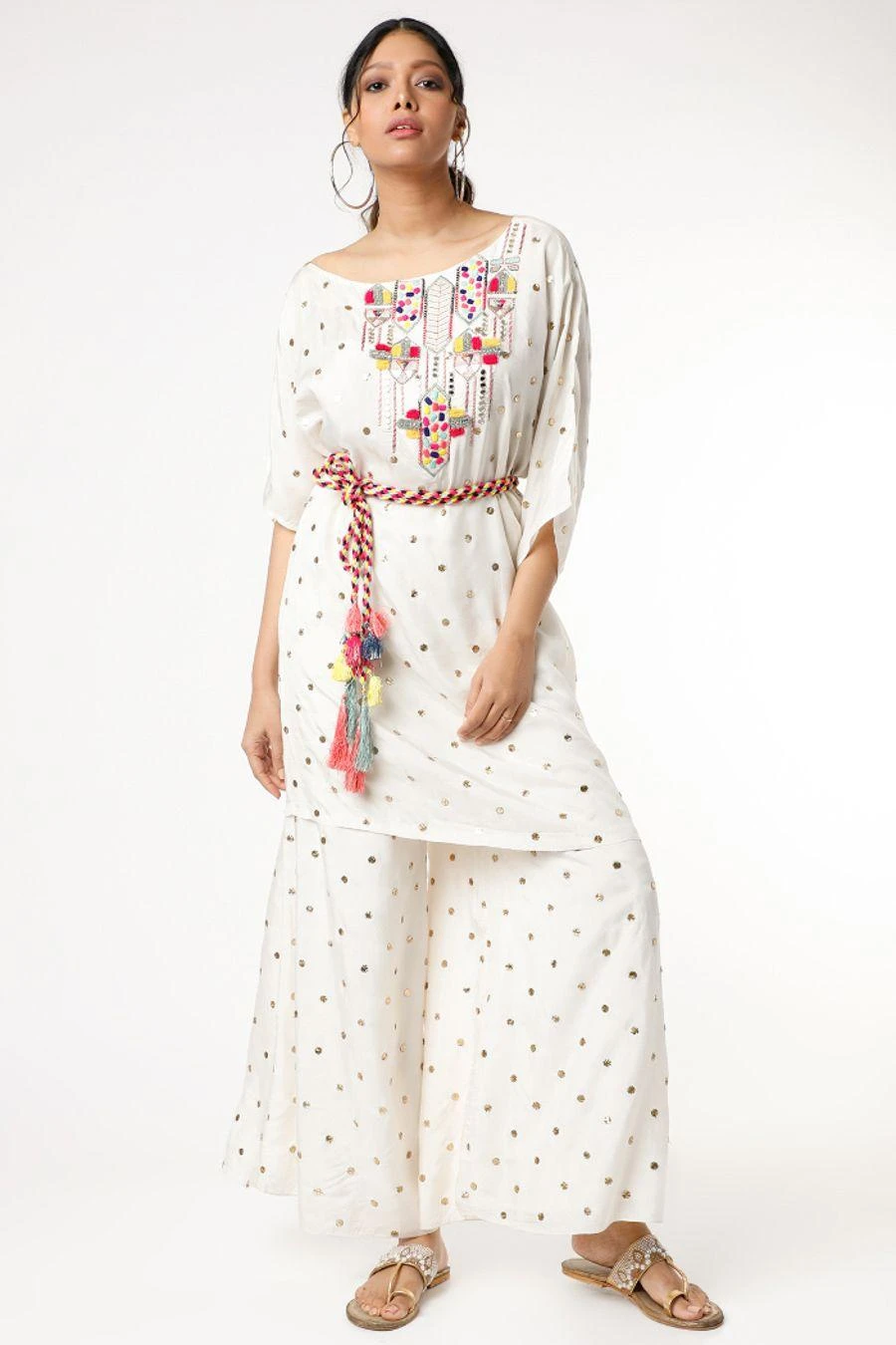 This kaftan set will see you through all kinds of celebrations this festive season. Crafted in crepe, this set comes with a mukaish embroidered kaftan paired with palazzo pants & a belt. Style it with a pair of dangler earrings to complete the look.