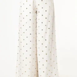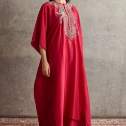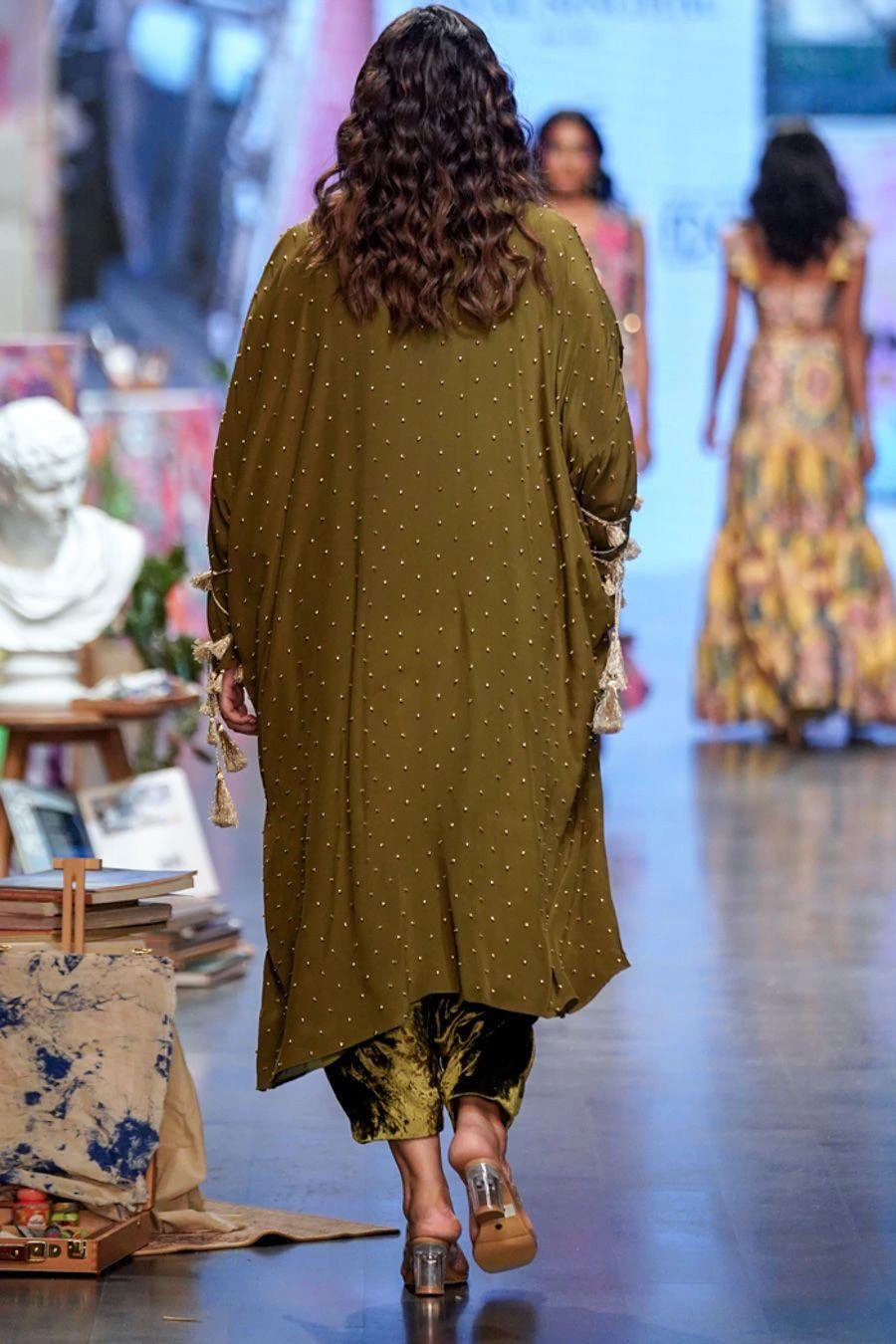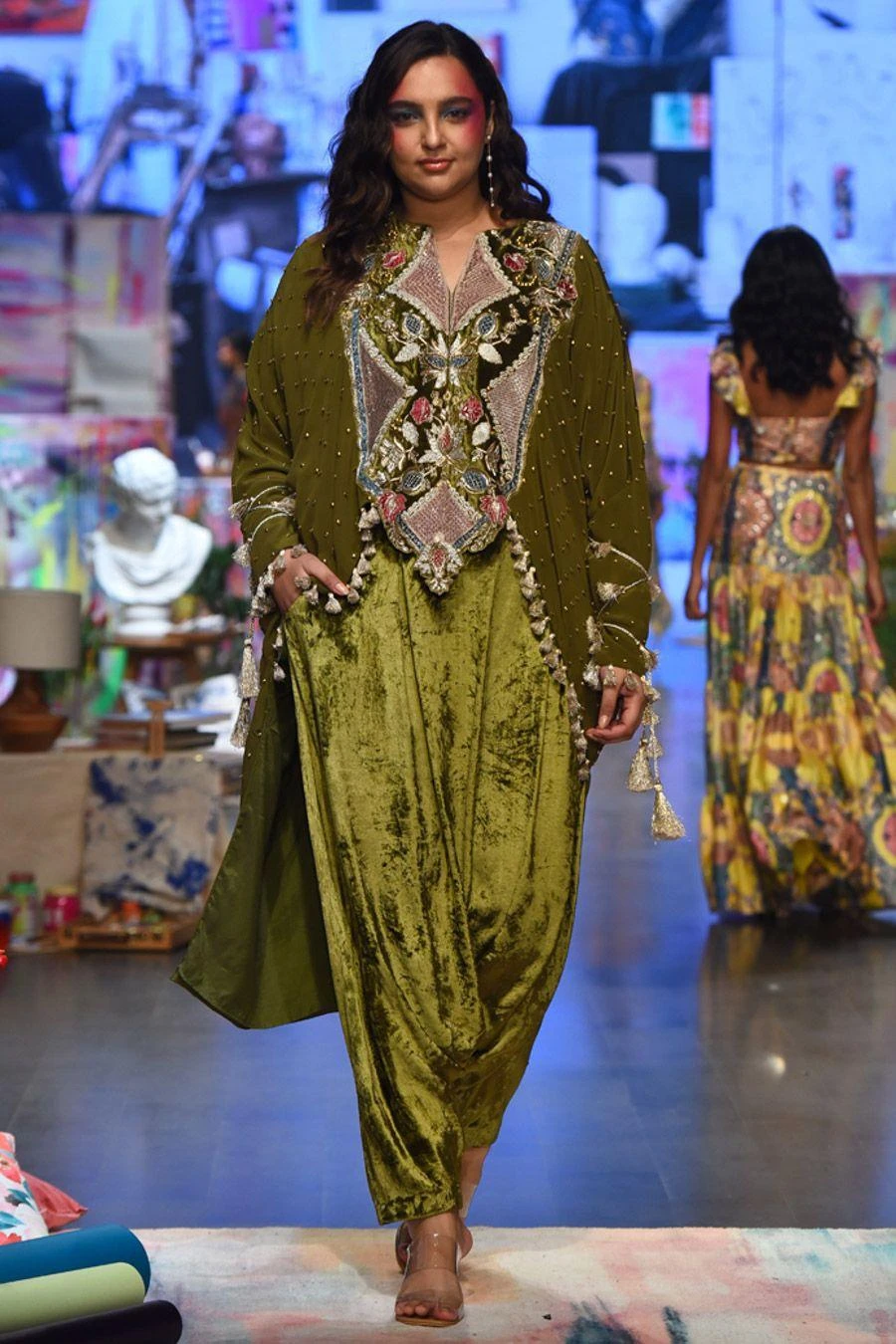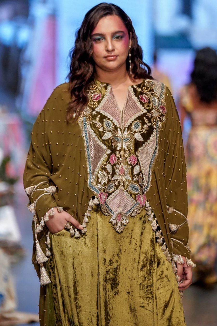Payal Singhal’s runway collection finds inspiration in art from multi hued brush strokes & abstract art to miniature Mughal paintings. Crafted in crepe, this set features an embroidered high low kaftan and velvet low crotch pants.