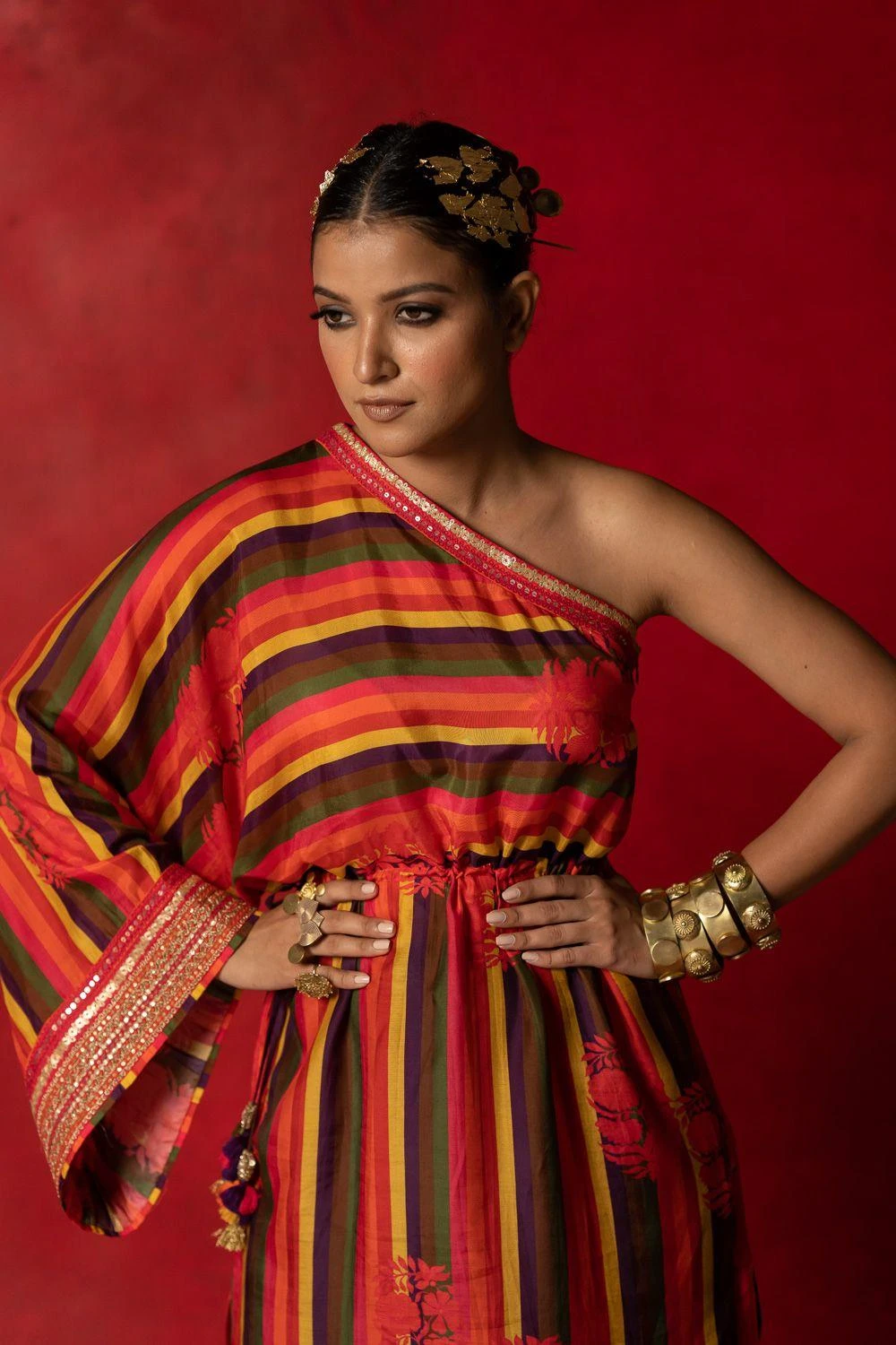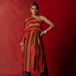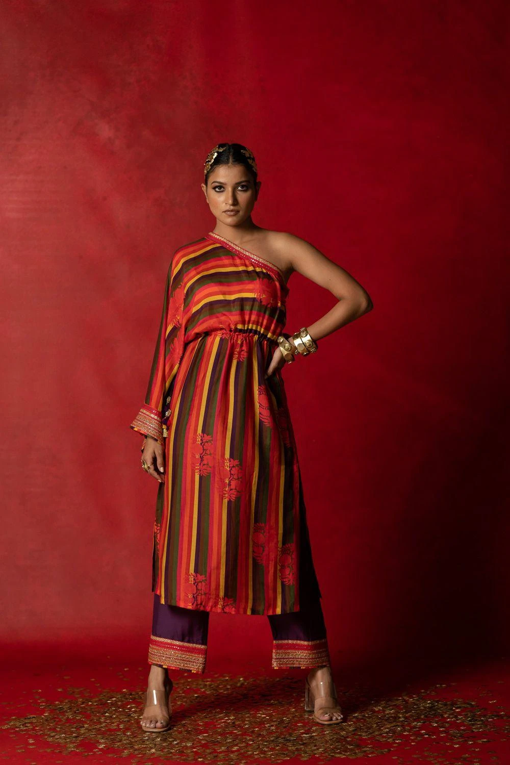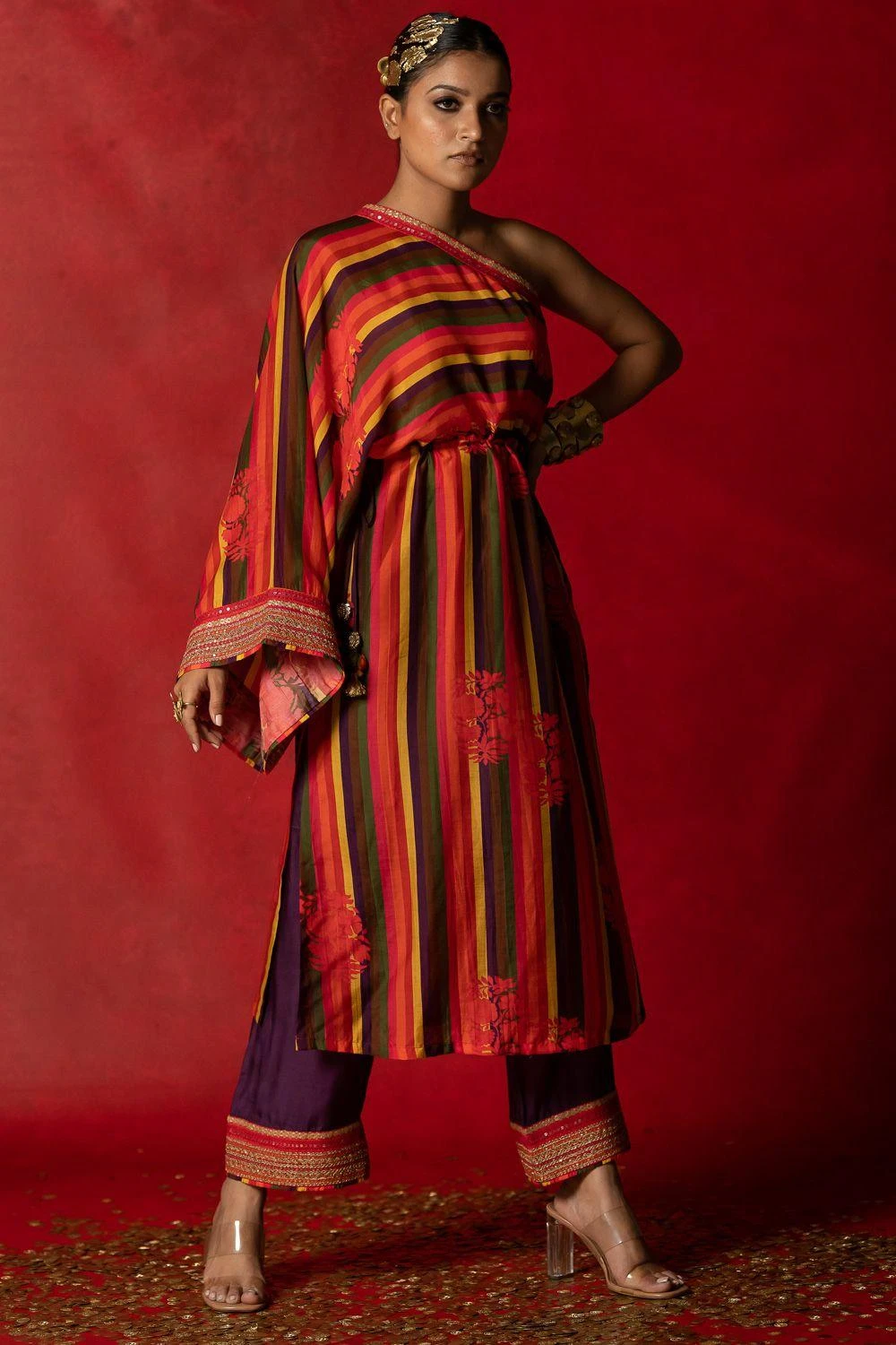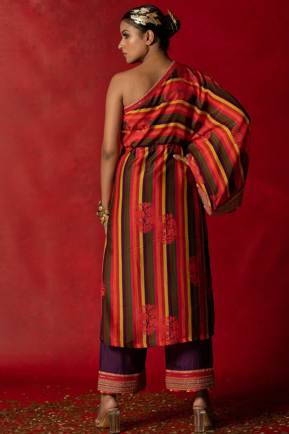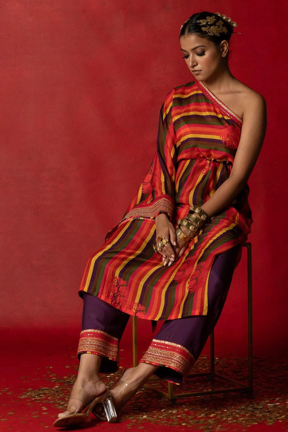 Give your festive closet a vibrant, artisan aesthetic with this kurta set. Crafted in cotton silk, this set features a one shoulder kurta with a cinched waist paired with purple pants. It has aari embroidery on the sleeves & hem of the pants.