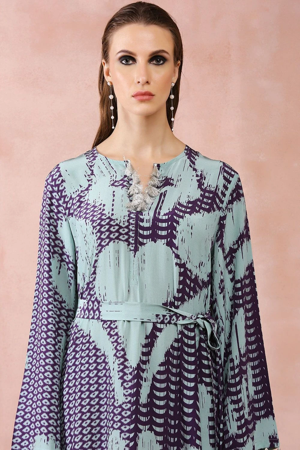 Immerse yourself in the allure of this Aqua & Purple Uzbek Print Kaftan, accompanied by a stylish belt. The captivating print and flowing silhouette evoke a sense of exotic elegance.