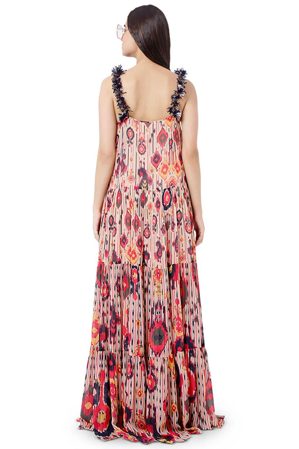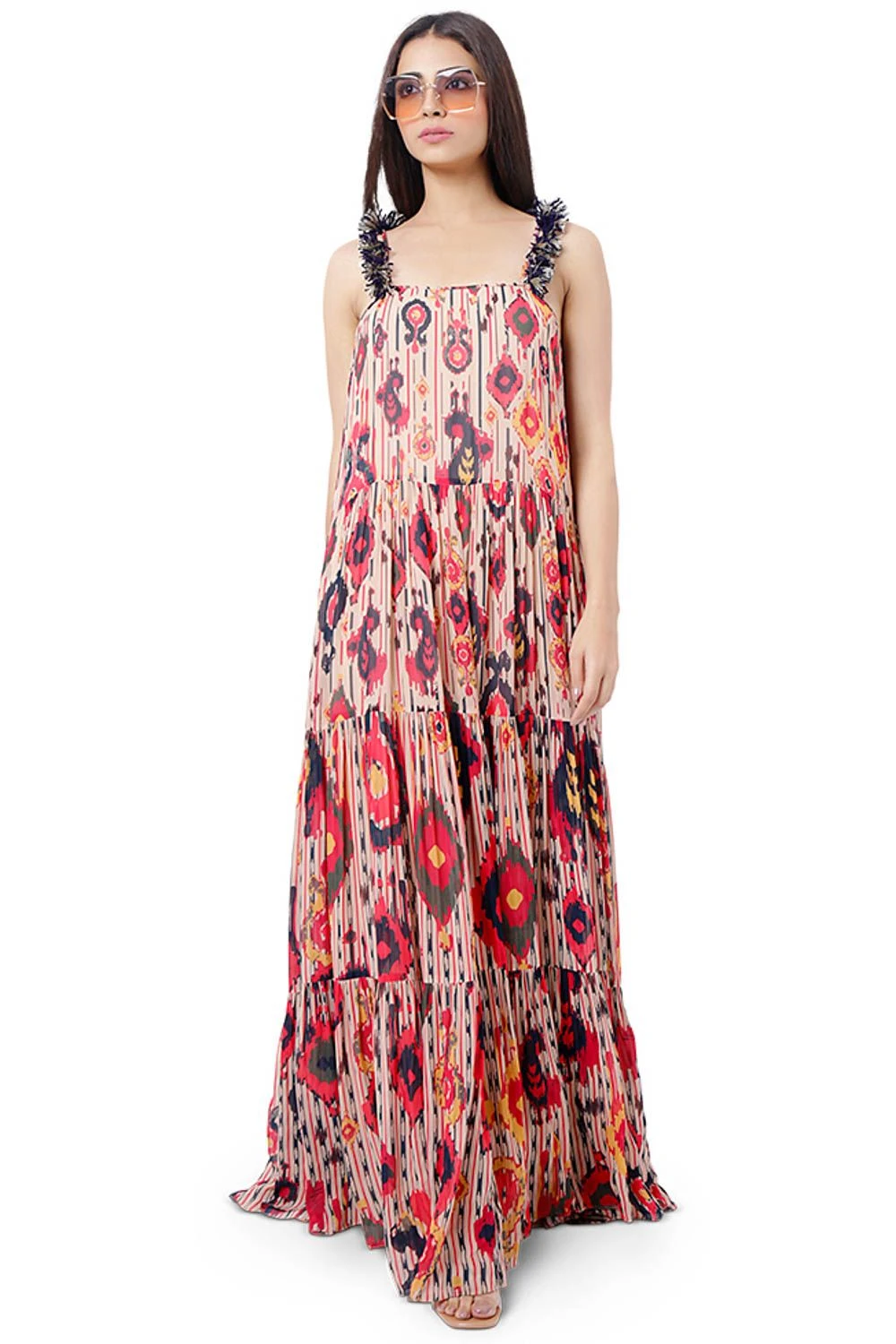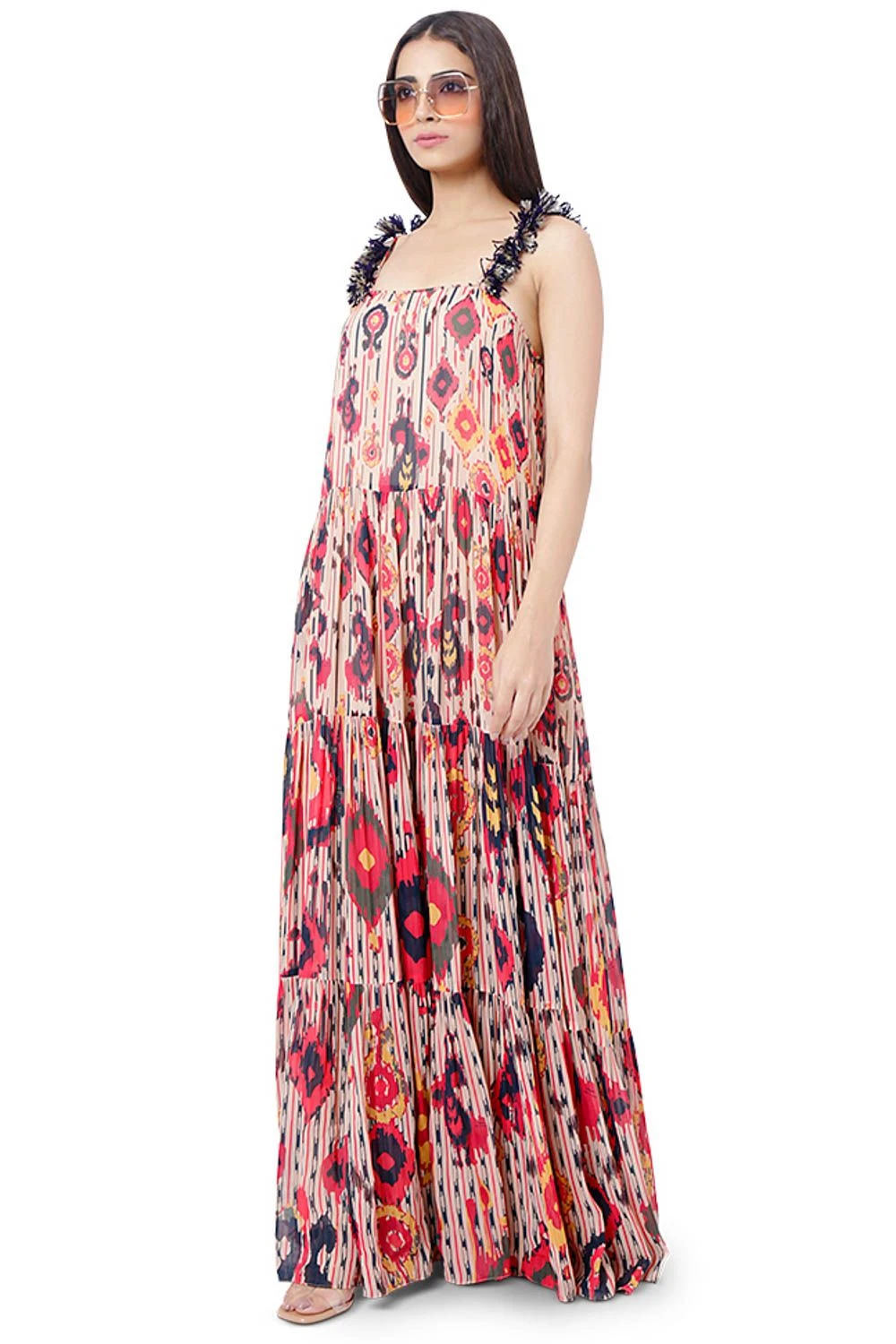 The perfect amalgamation of style & comfort, this dress is perfect for a day out. Crafted in georgette, this tiered maxi dress features an ikat tribe print art with tassels on the strap. Style it with a pair of dangler earrings to complete the look.