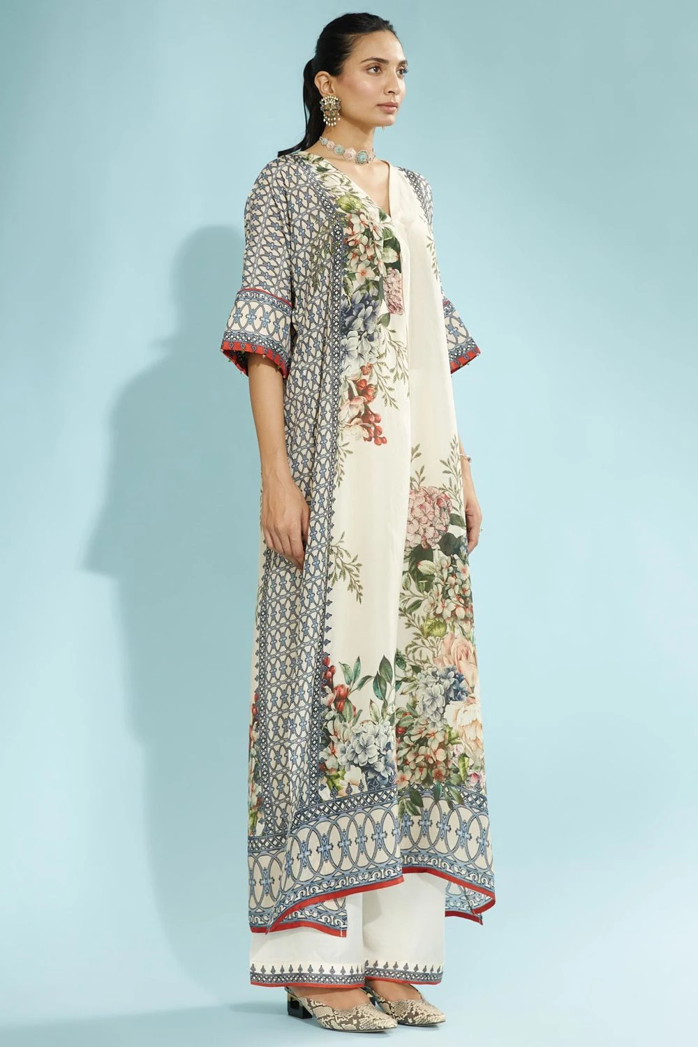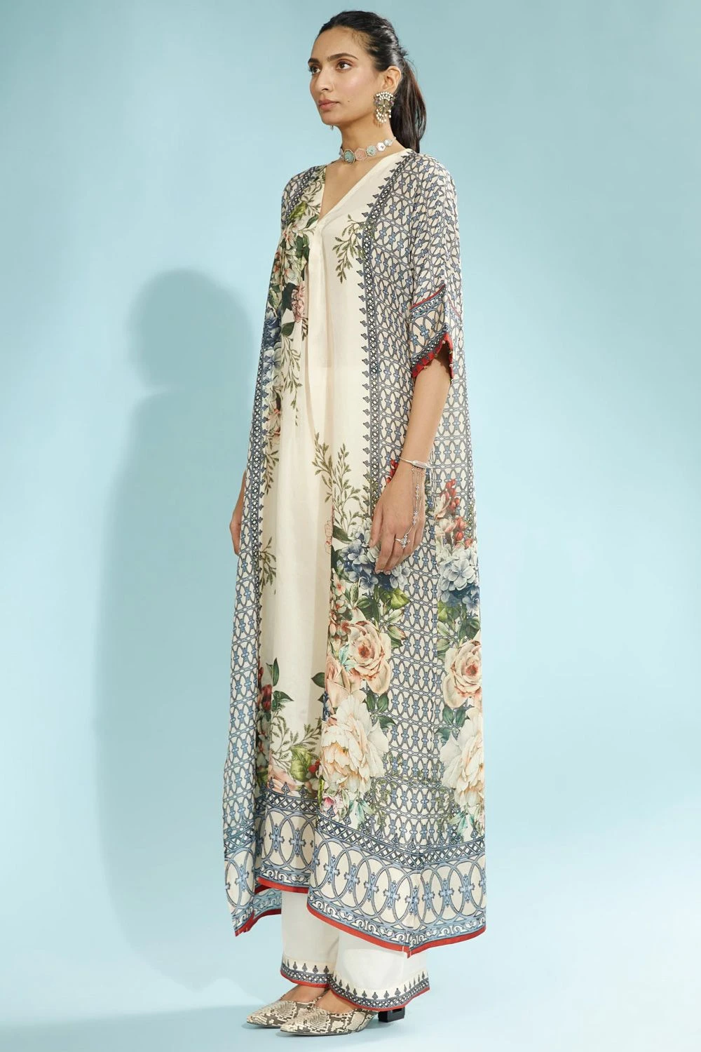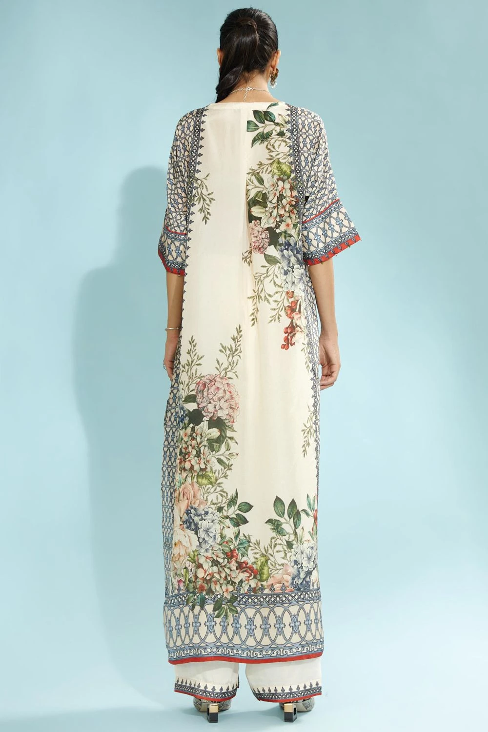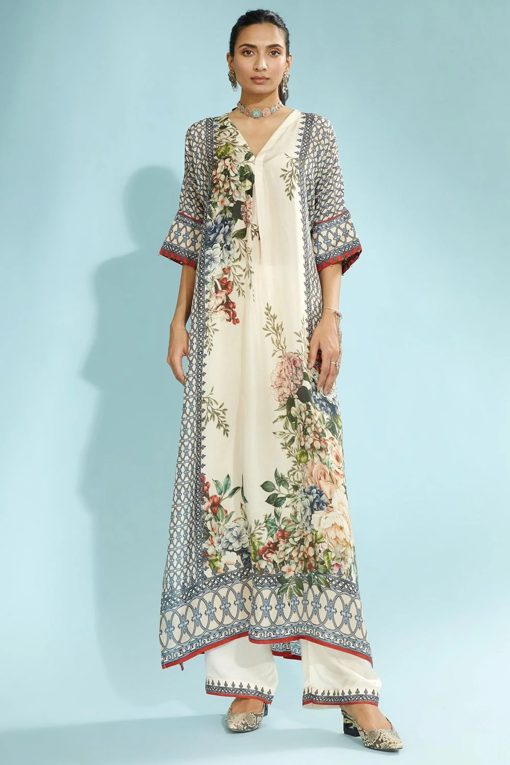 Playful silhouettes & vibrant tones are in perfect style this season, & this tunic fits the bill perfectly. It features a V neckline with a floral print. Style it with a pair of blue palazzos to complete the look.