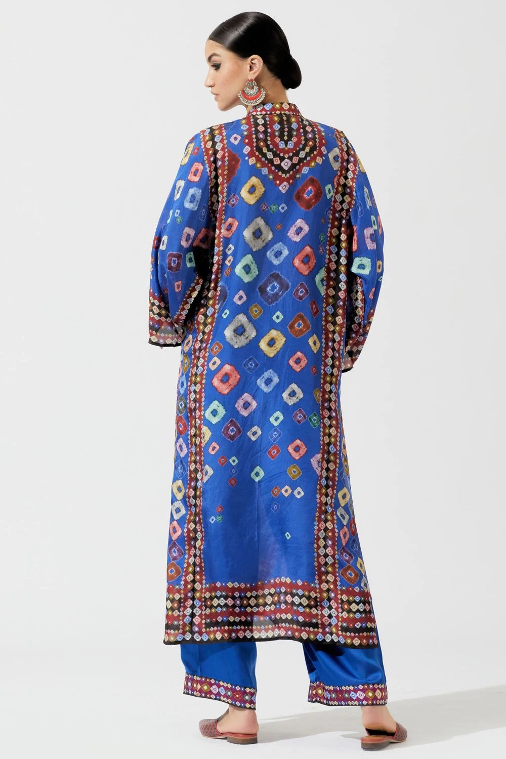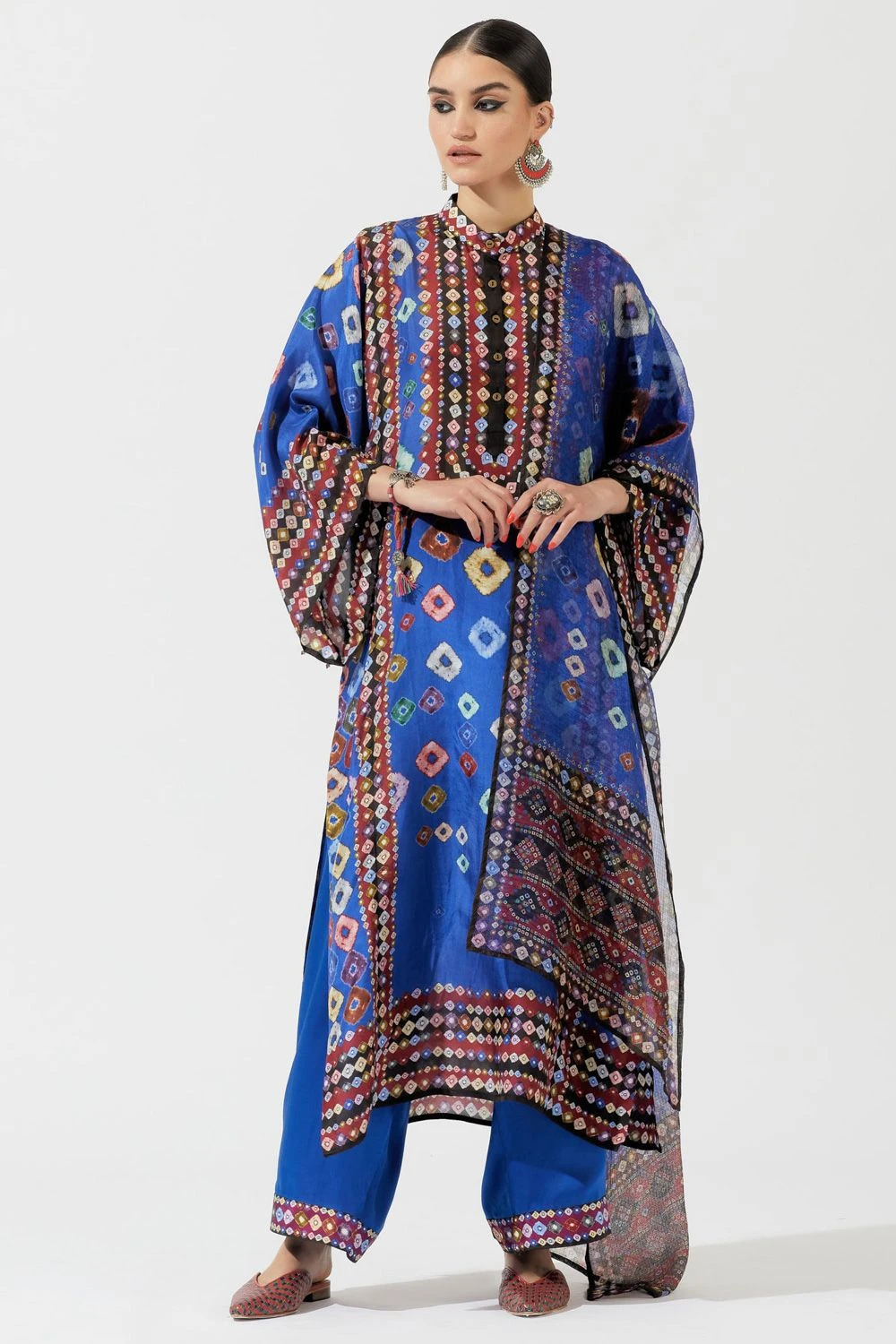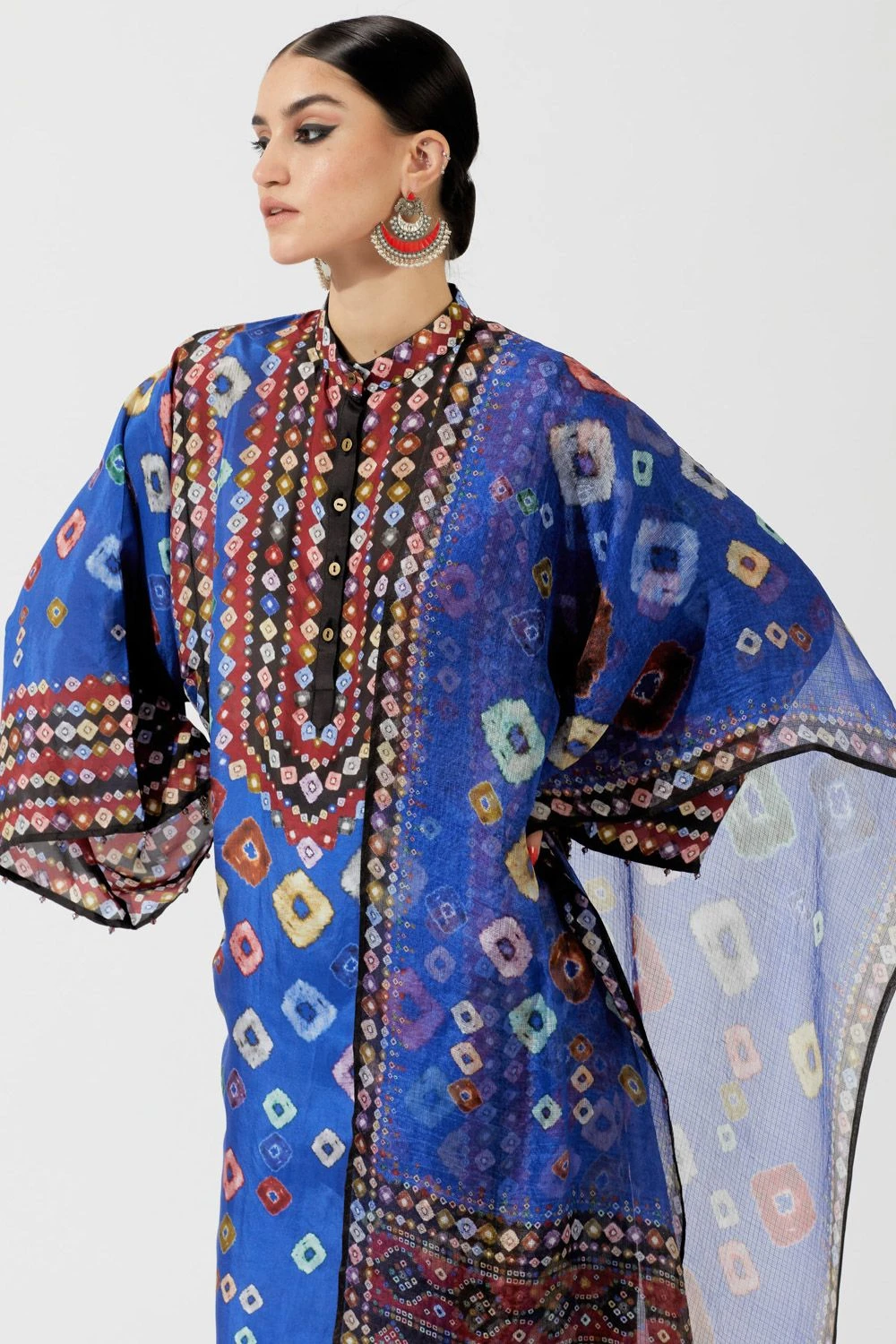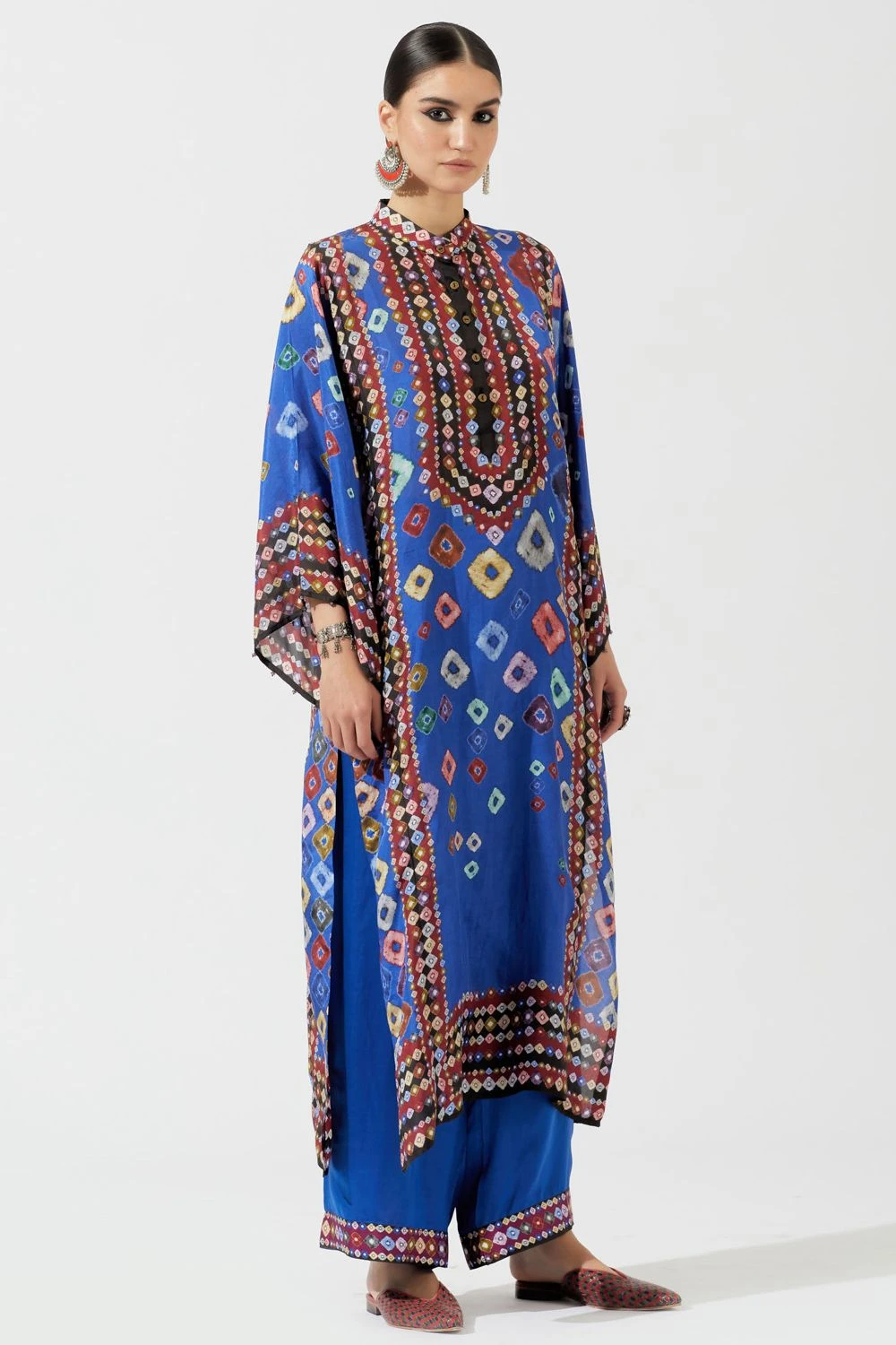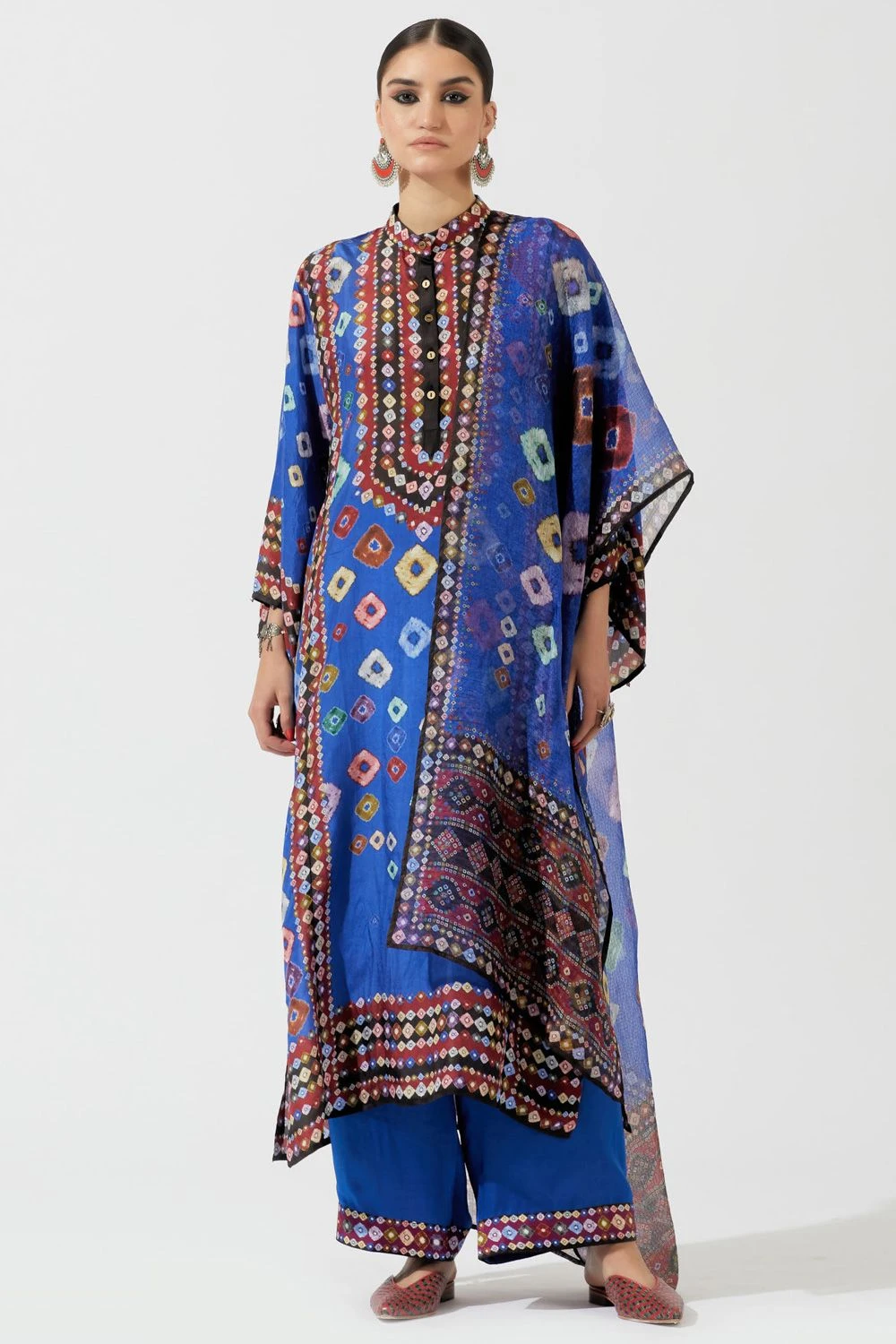 This eclectic blue bandhani printed kurta is perfect for evening festivities. This elegant piece is set in a luxe silk fabric with front button placket & boxy sleeves. It comes with a pair of solid blue palazzos & a printed kota silk stole.