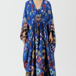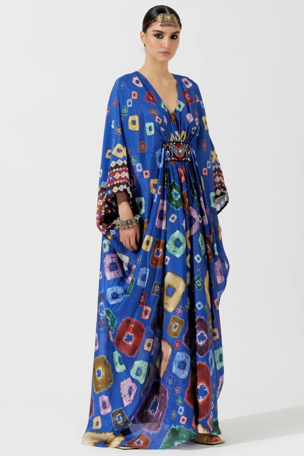 This blue printed kaftan is a perfect solution for a quick festive look. It is cut in sumptuous silk enhanced with enlarged bandhani print and a jewelled belted waist. Adorn a chic choker with this look.