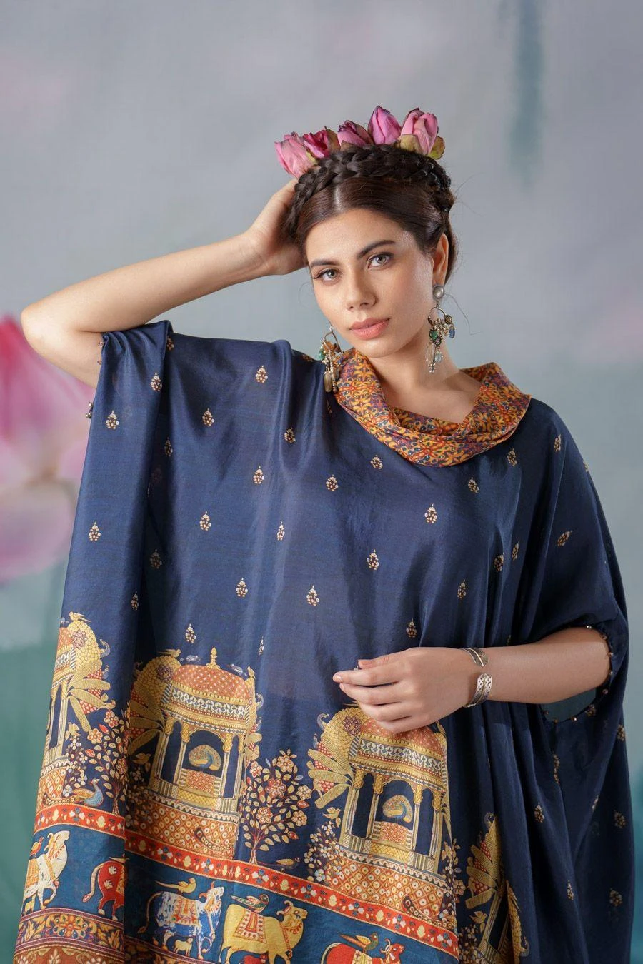 The perfect amalgamation of style & comfort, this tunic set works across occasions. Crafted in silk & satin, this set features a printed draped tunic with a cowl neckline paired with coordinating plain palazzo pants.