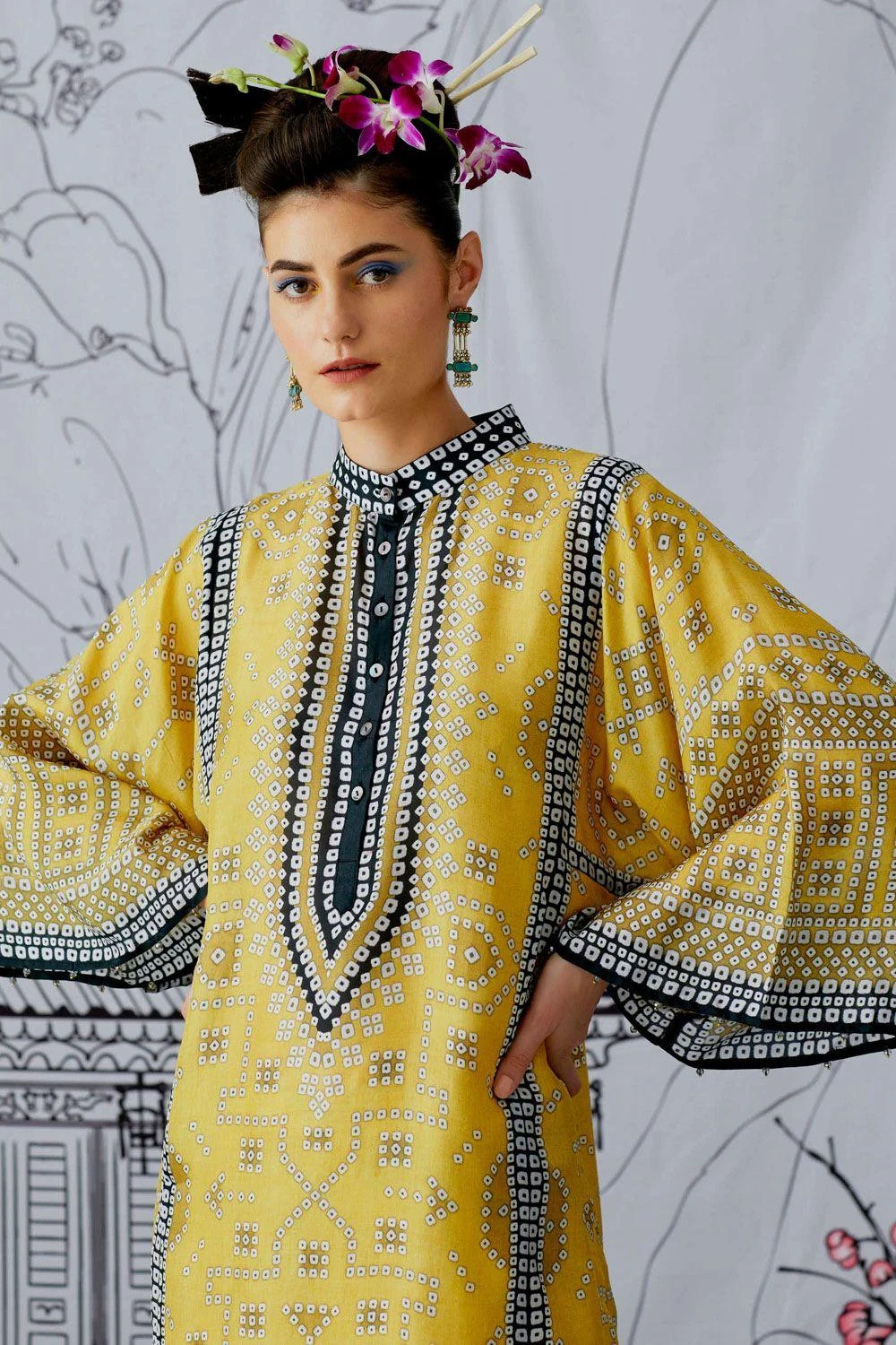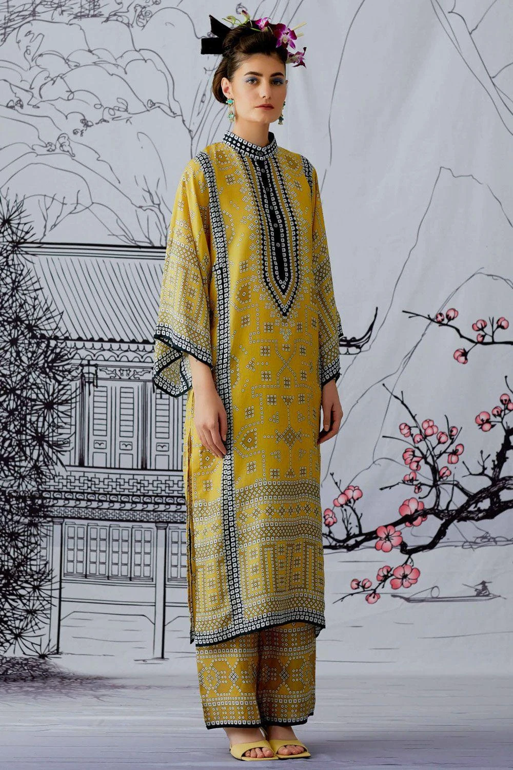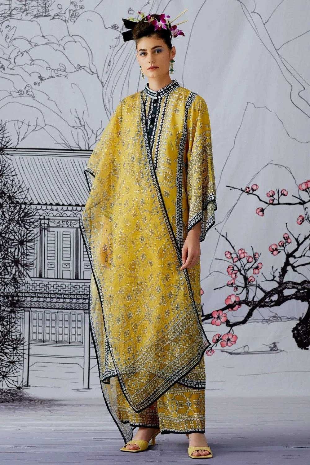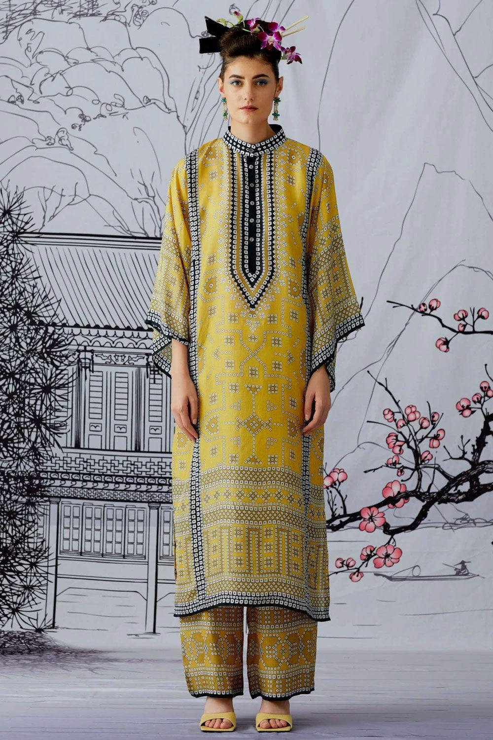 This festive season is all about vivid tones & relaxed silhouettes. This radiant kurta set is cut in luxe silk fabric and printed in understated bandhani. It is finished with an elegant printed kota silk stole.