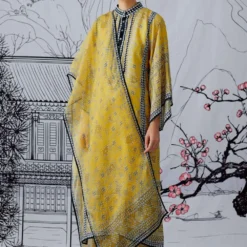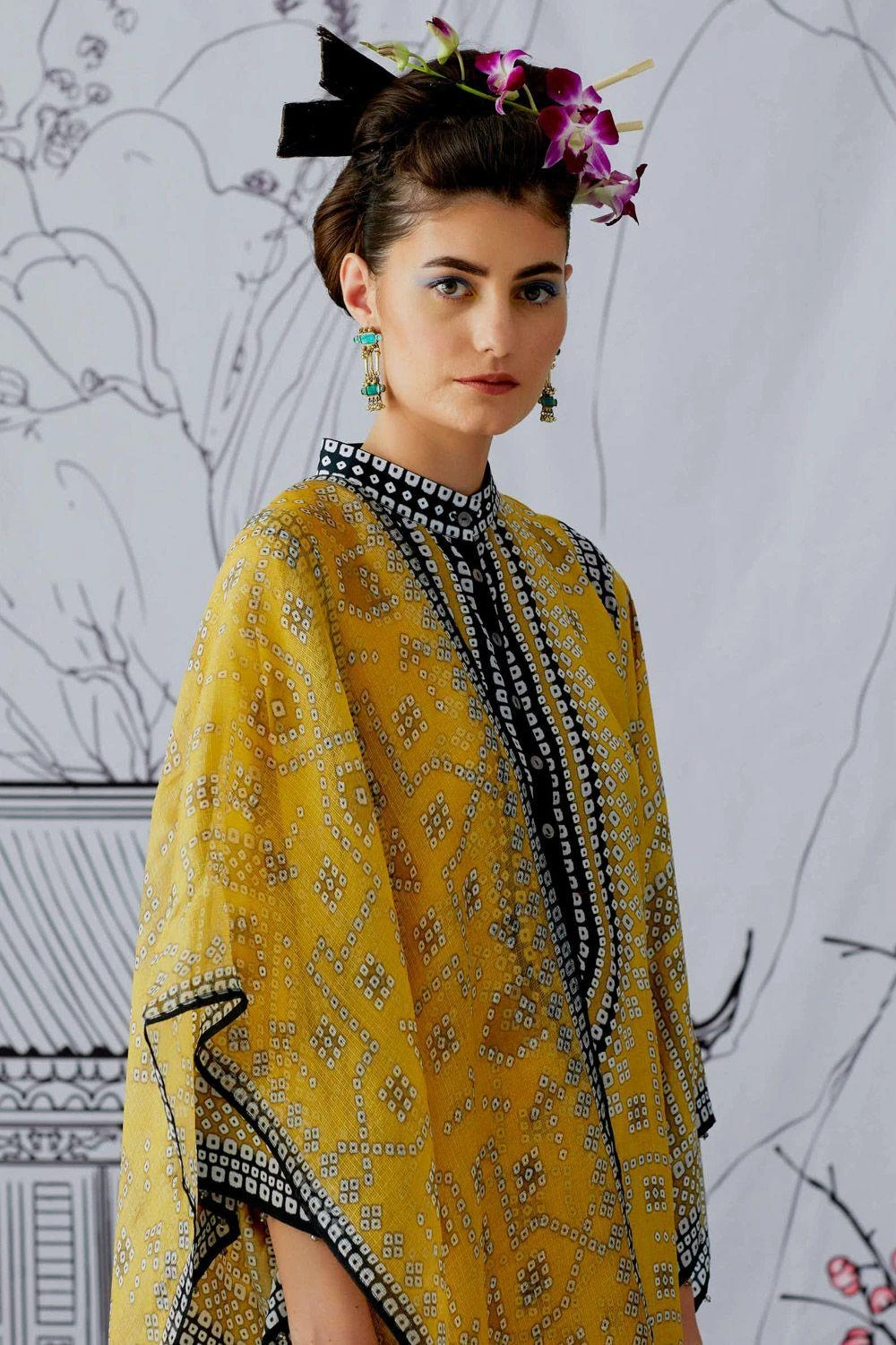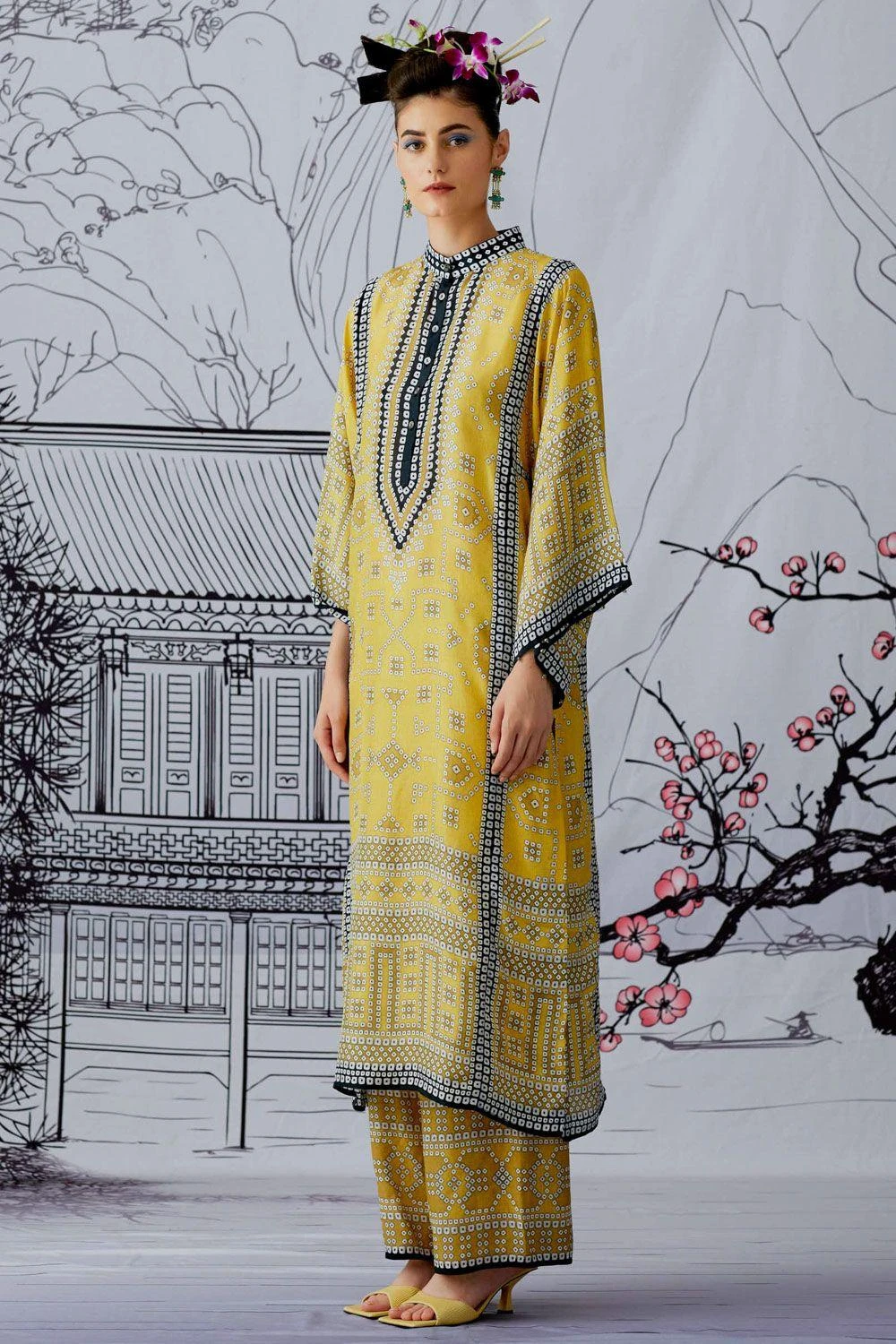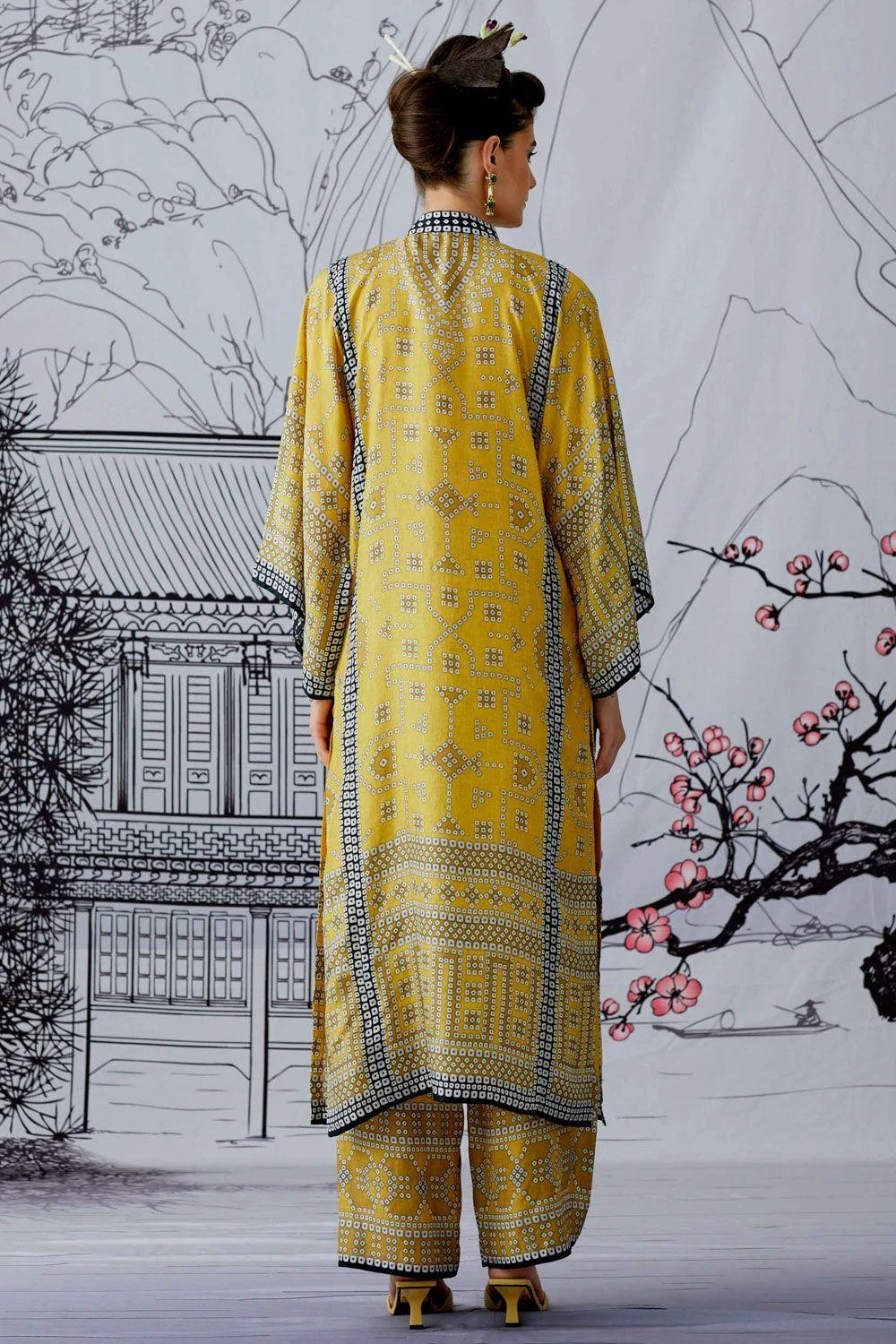 This festive season is all about vivid tones & relaxed silhouettes. This radiant kurta set is cut in luxe silk fabric and printed in understated bandhani. It is finished with an elegant printed kota silk stole.