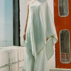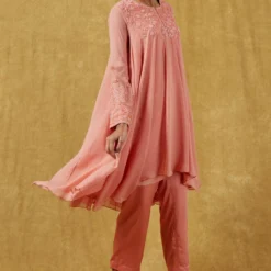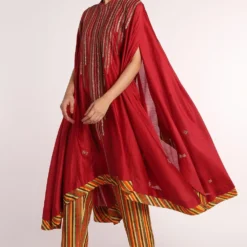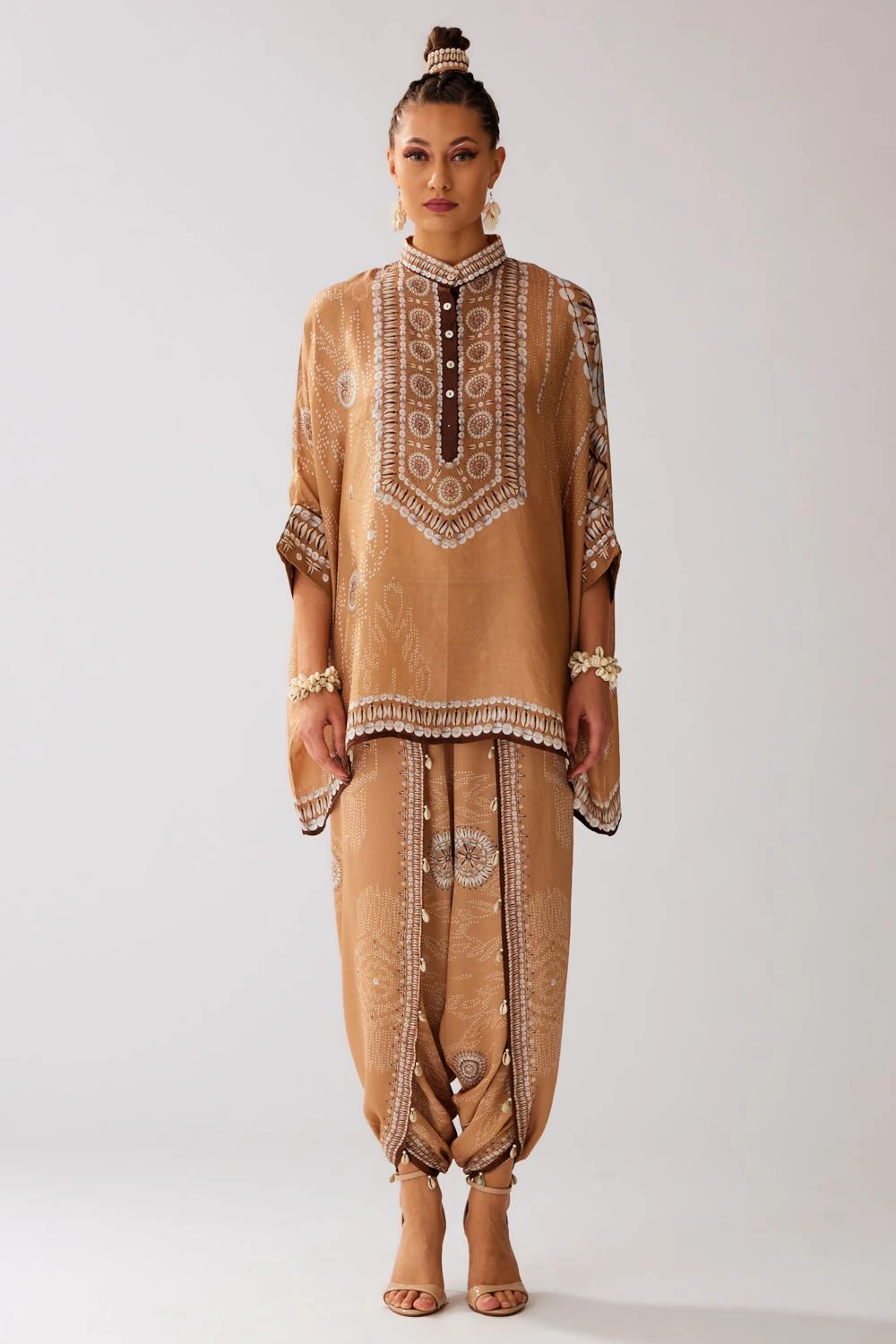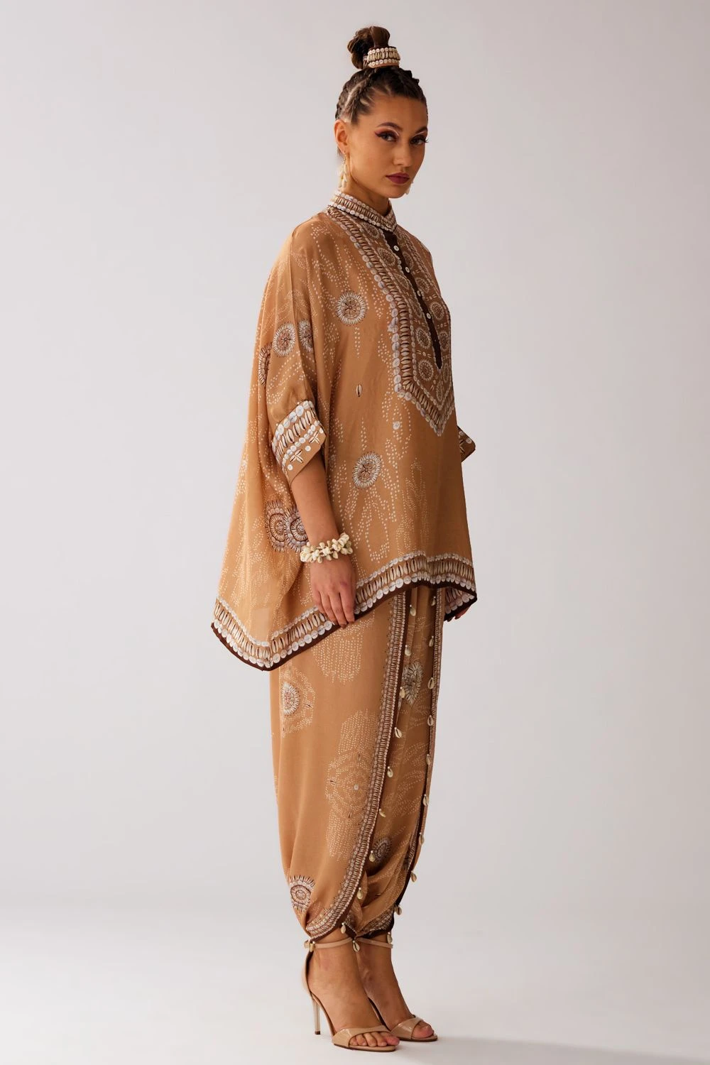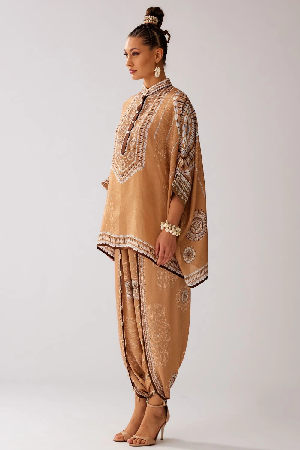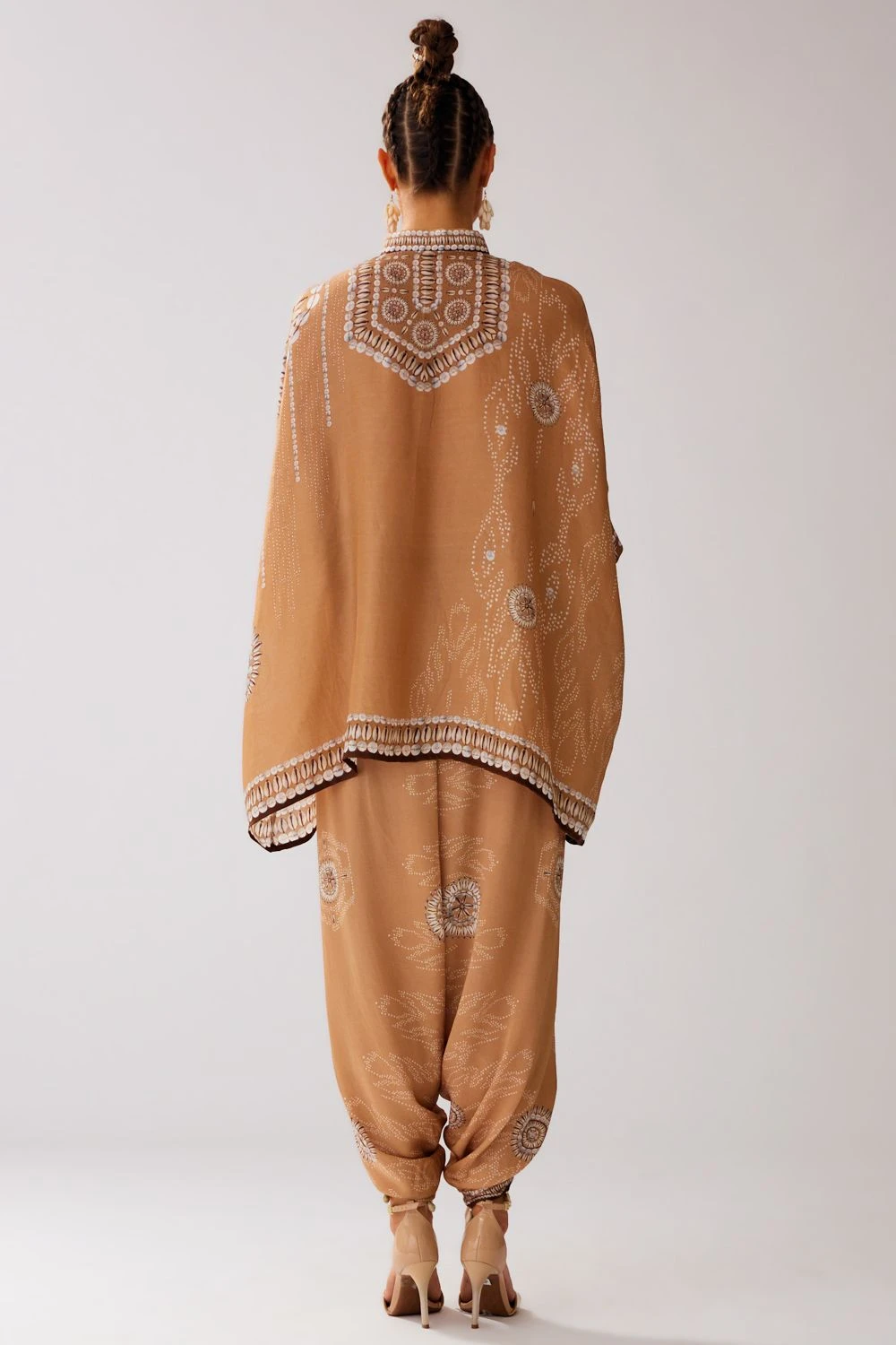 The perfect amalgamation of style and comfort, this tunic set works across occasions. Crafted in silk, this poncho style tunic features a floral print all over & is paired with coordinating pants.