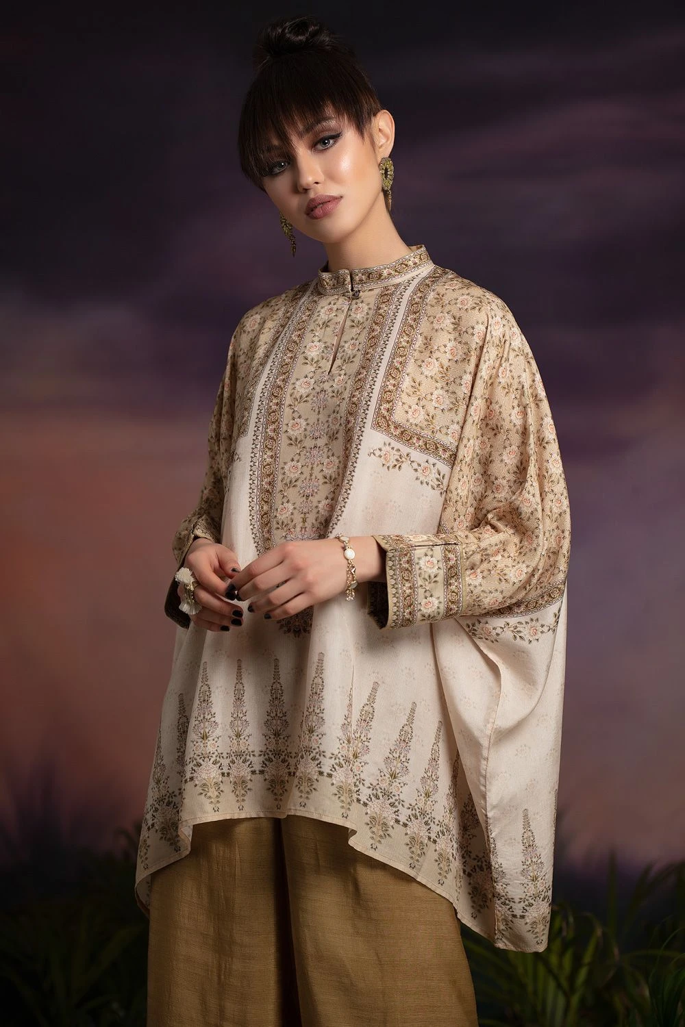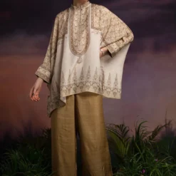 Indulge in refined elegance with this ivory floral print, silk kaftan tunic. Featuring a band collar detail & cuffs, it is versatile for casual outings & sophisticated events. Pair it up with sandals for a relaxed vibe or heels for evening affairs.