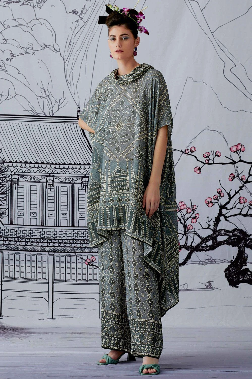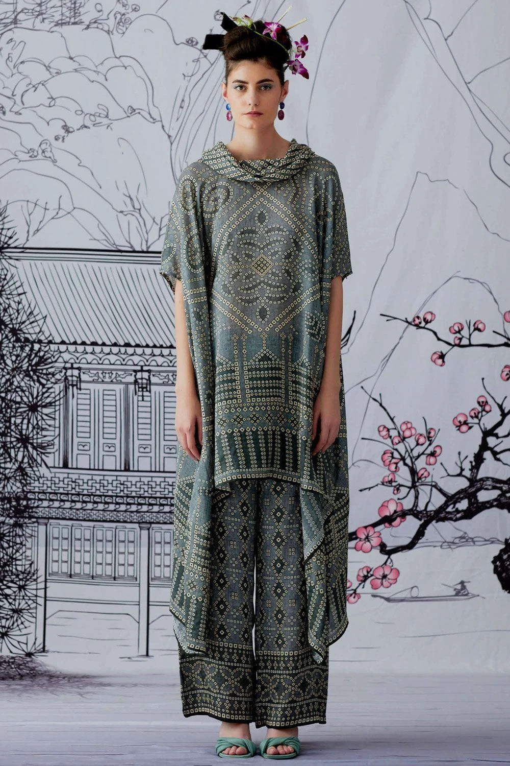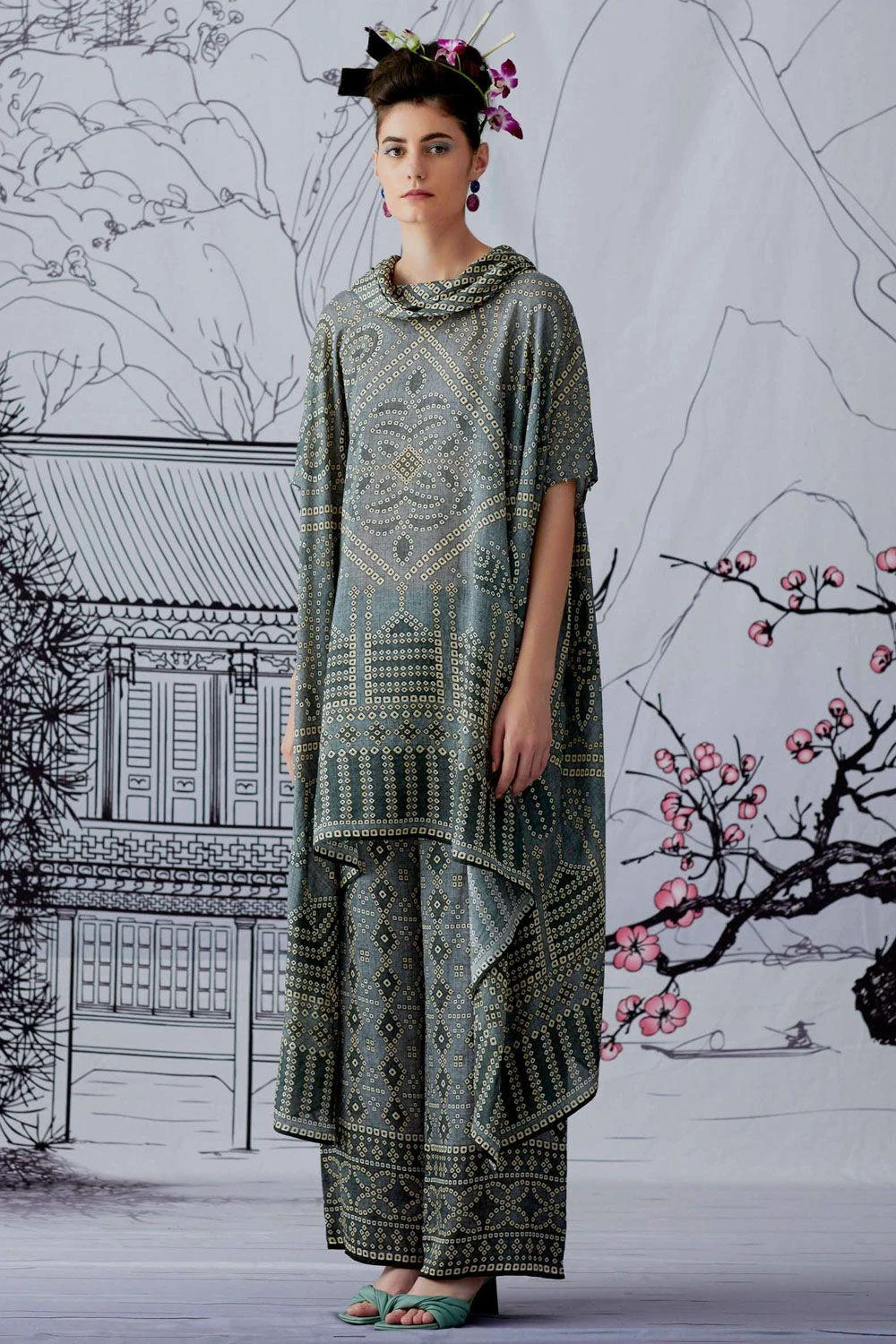 This draped tunic has drop sleeves & a draped cowl neck. Style this elegant piece for daytime events, with statement stud earrings to complete your look.
