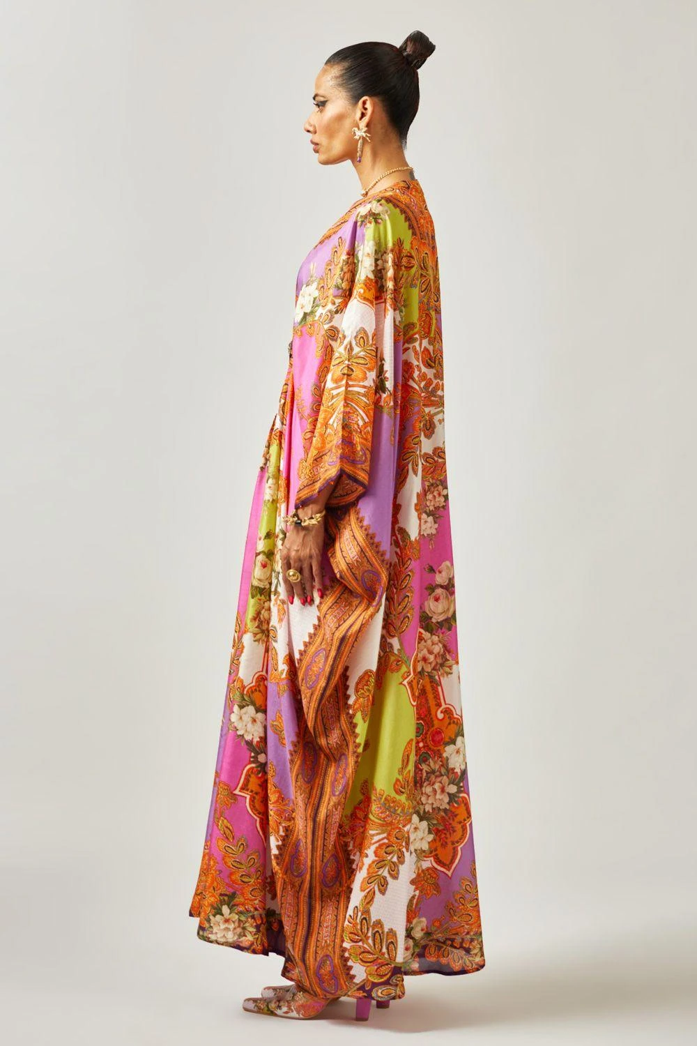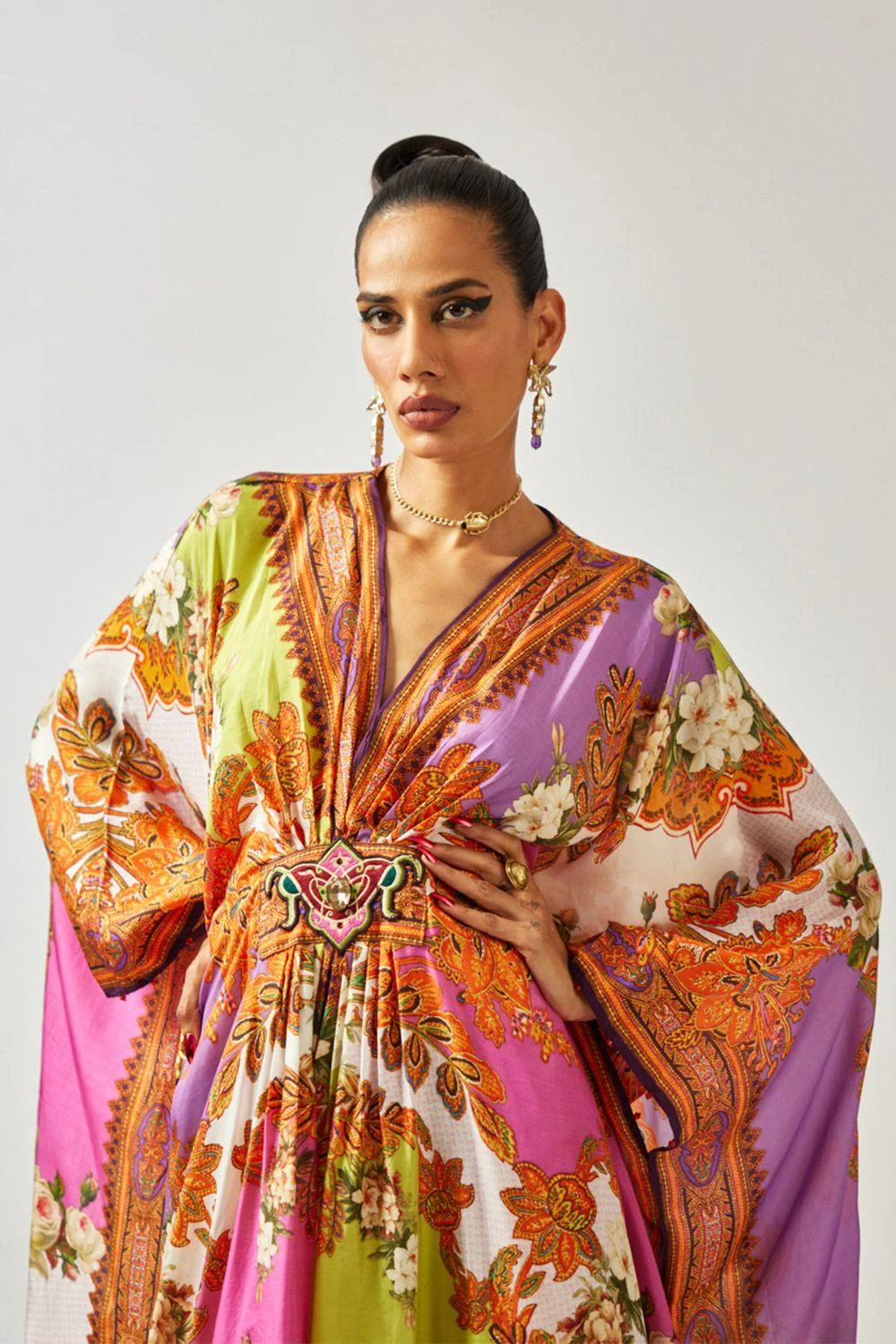 Effortless grace meets vibrant charm in this multi-color floral silk kaftan. The long V-neck & jewel adorned waist-belt detail is perfect for resort evenings & special occasions. Pair up with sandals for chic leisure or heels for elevated glamour.