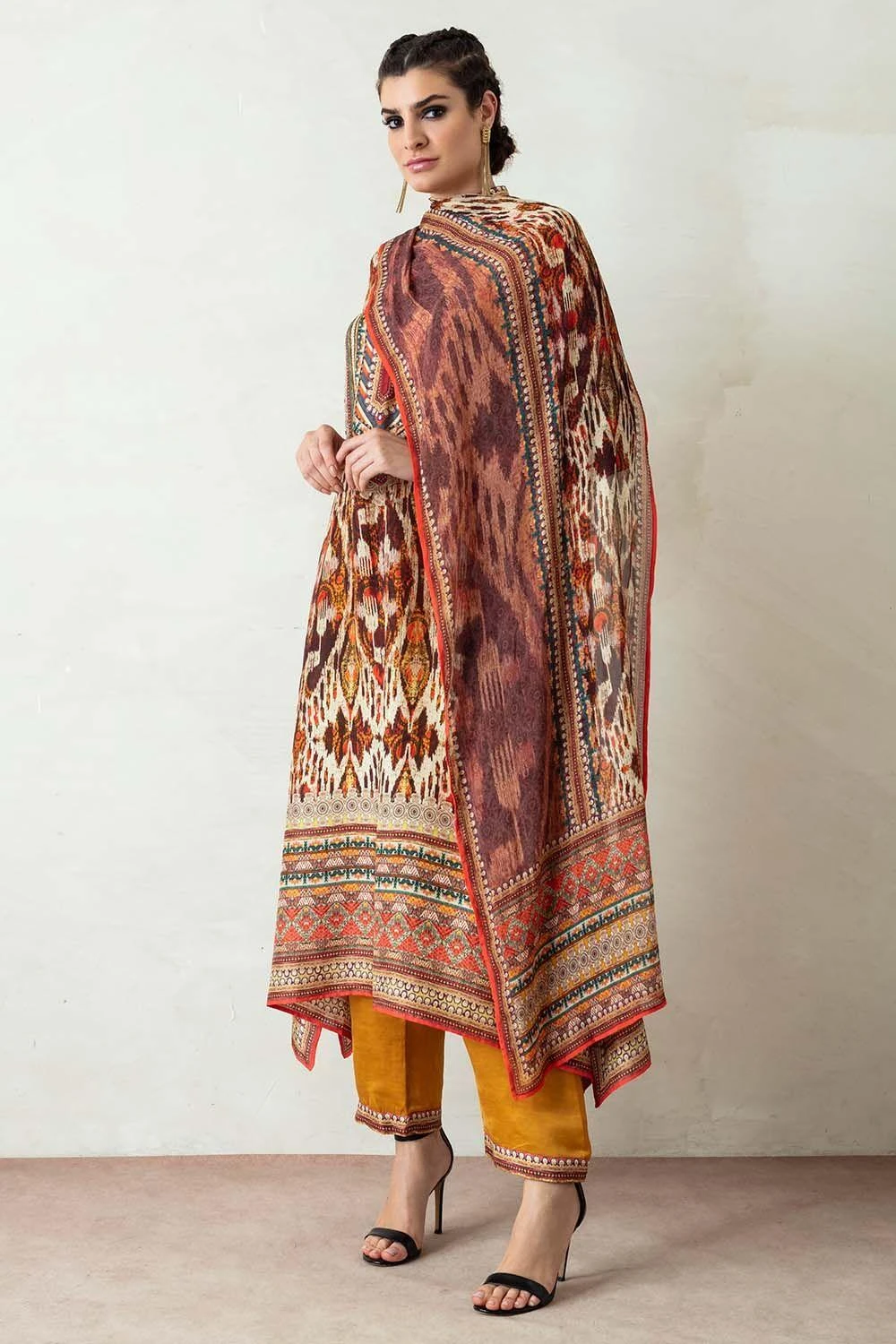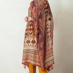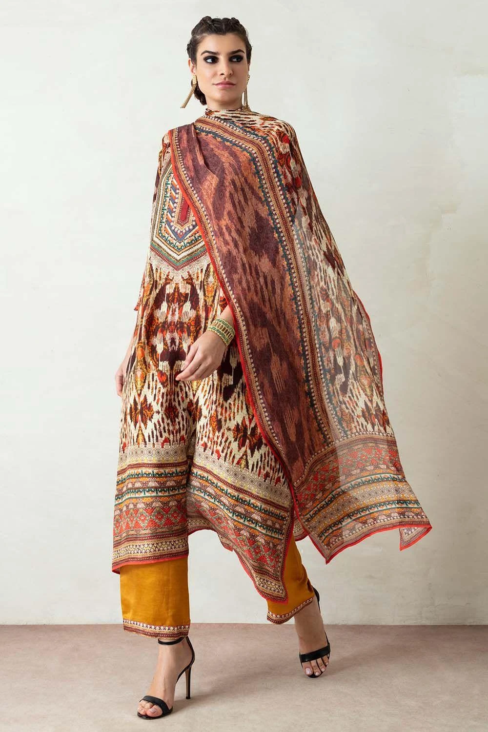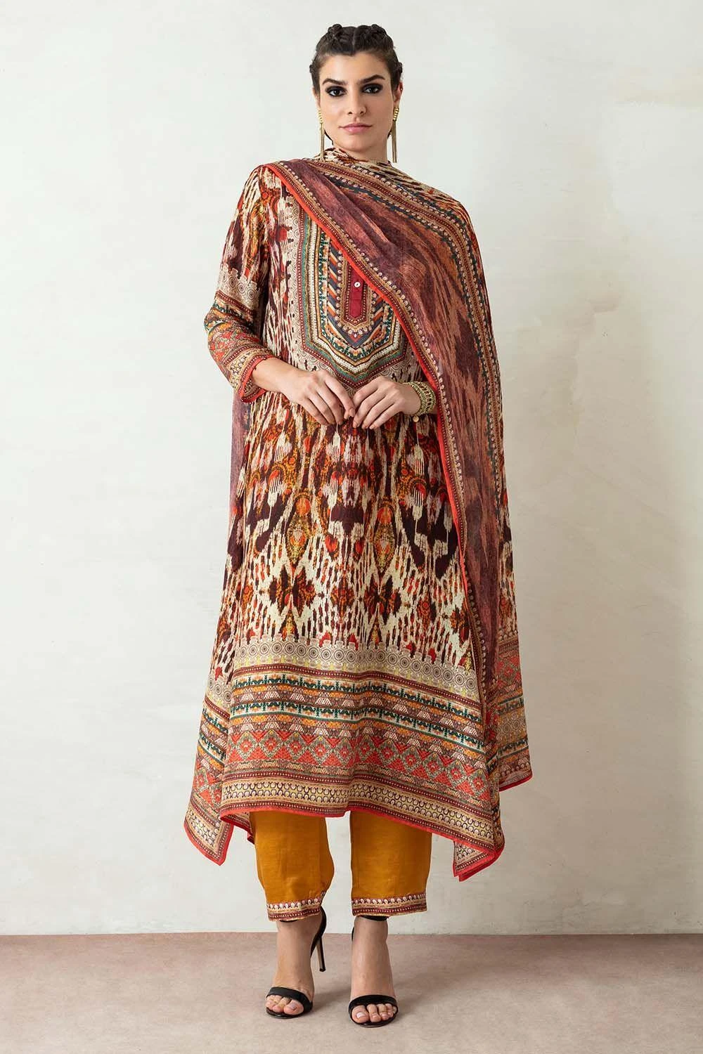 This kurta set will truly ooze your boho spirit. It boasts prolific prints on a flowy silhouette. The kurta features side panels and gazette sleeves paired with coordinating slouchy pants. The look is complimented with a kota silk printed stole.