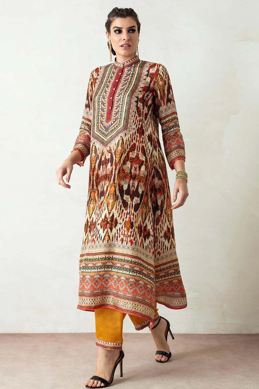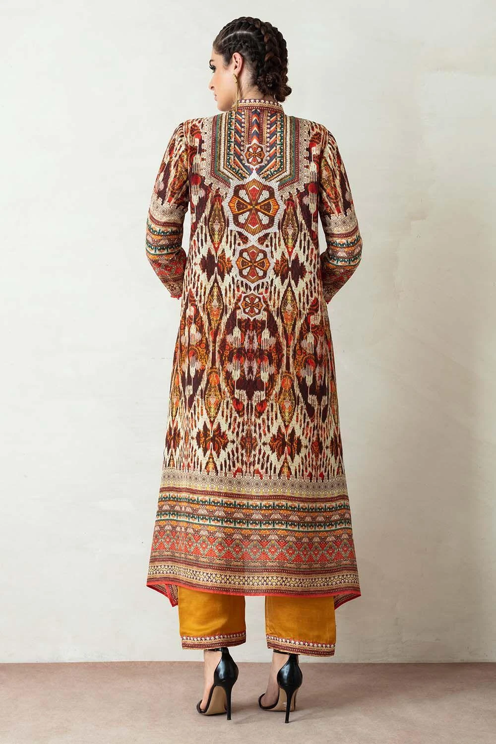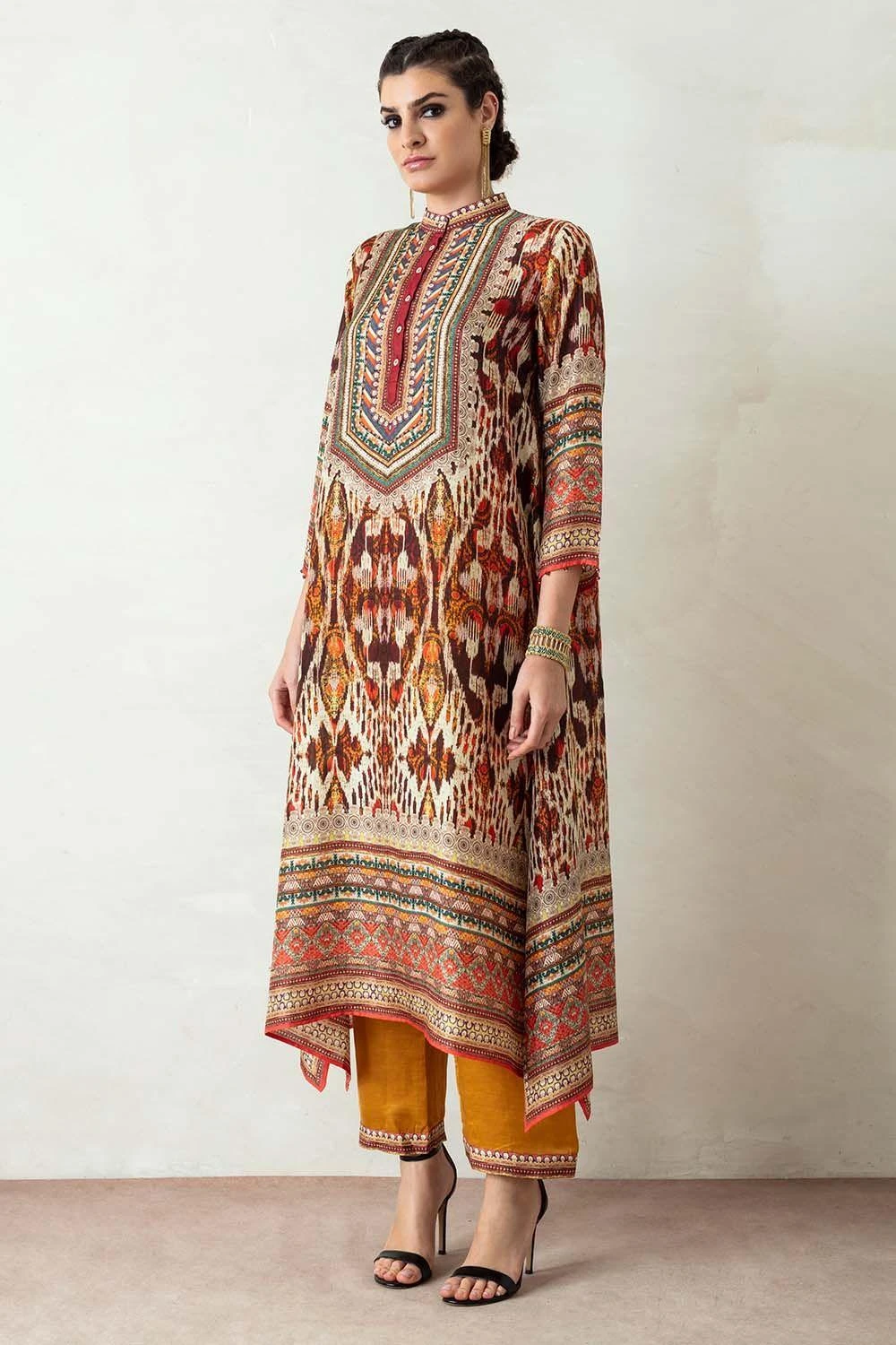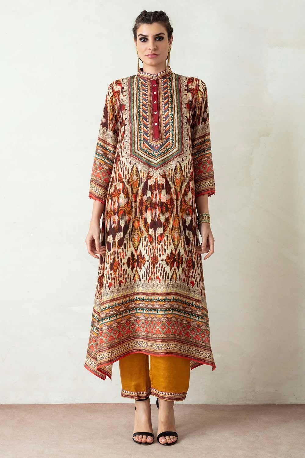 This kurta set will truly ooze your boho spirit. It boasts prolific prints on a flowy silhouette. The kurta features side panels and gazette sleeves paired with coordinating slouchy pants. The look is complimented with a kota silk printed stole.