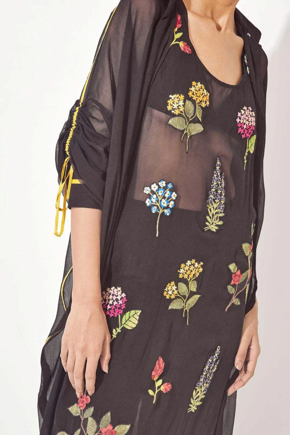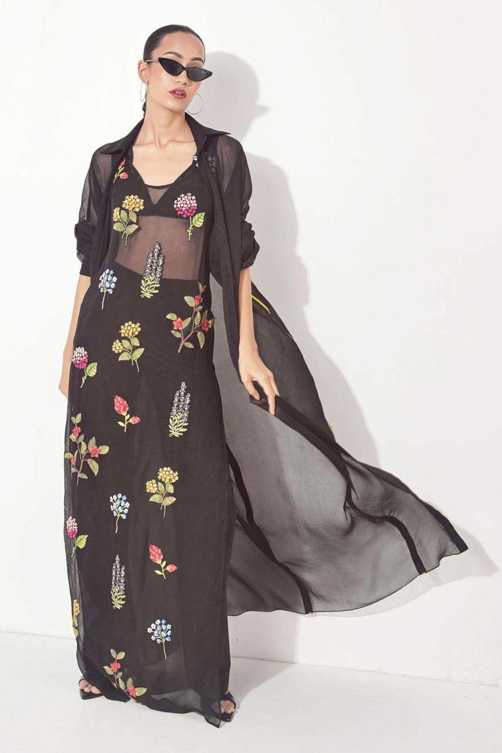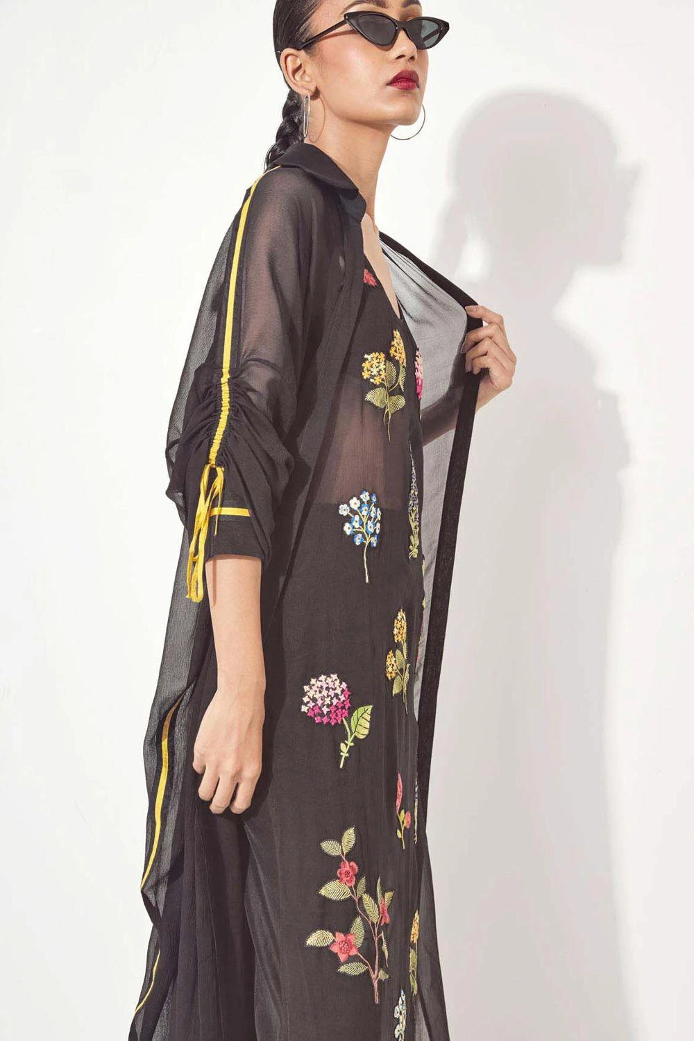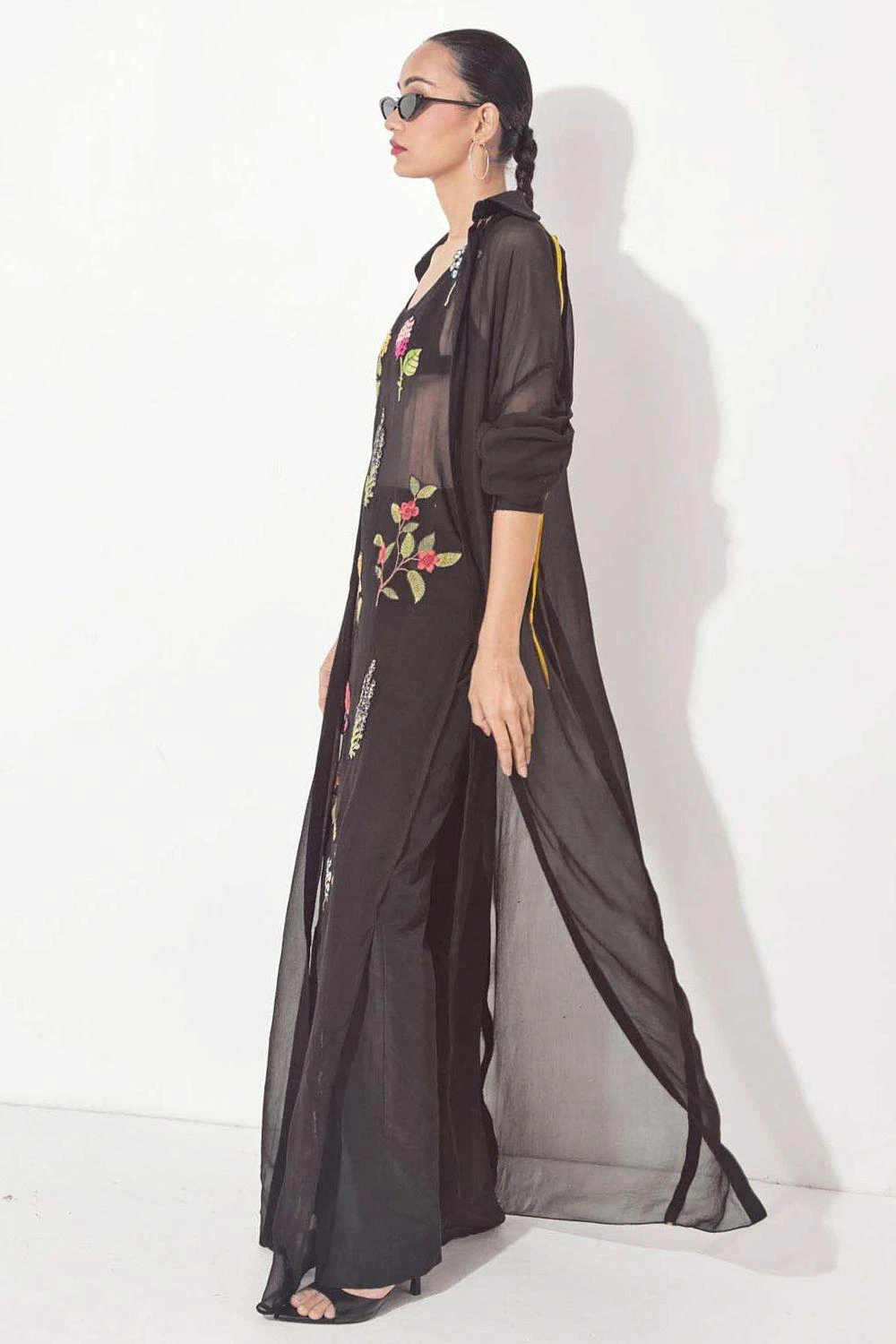Step into the world of elegance with this hand-embroidered and appliqued floral black dress. The side slits add a touch of allure, while the front pleat jacket with gathered sleeves & pants elevate the ensemble to new heights of sophistication.