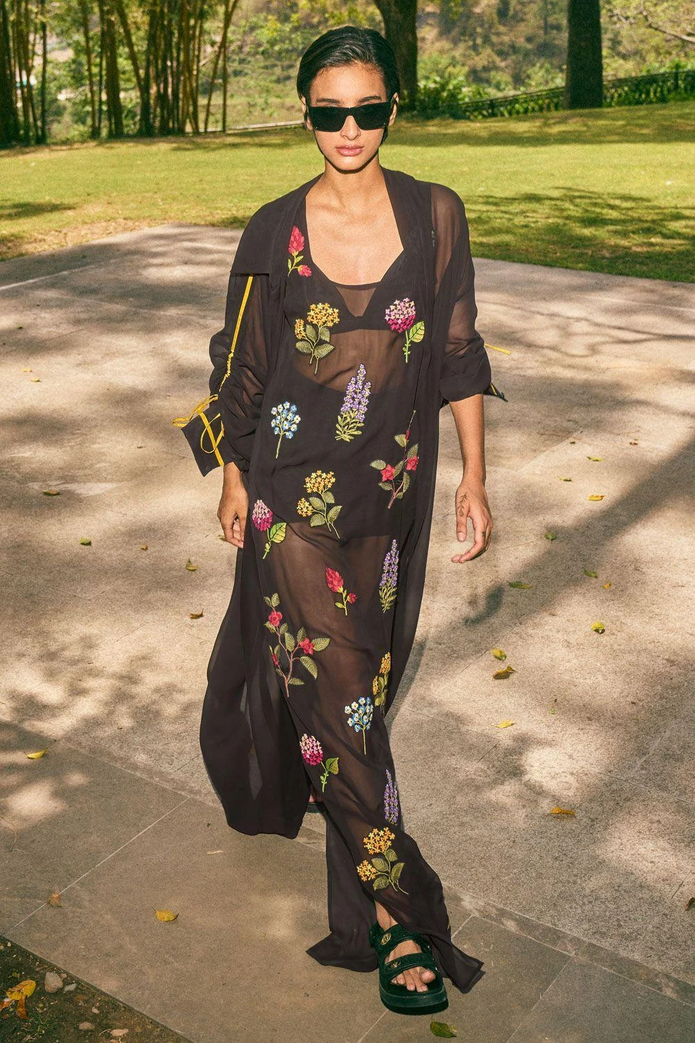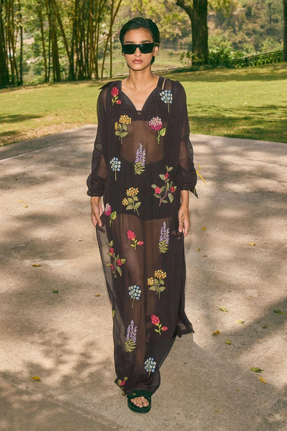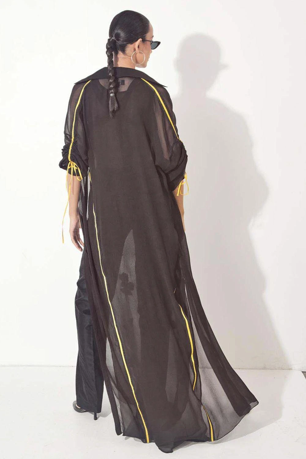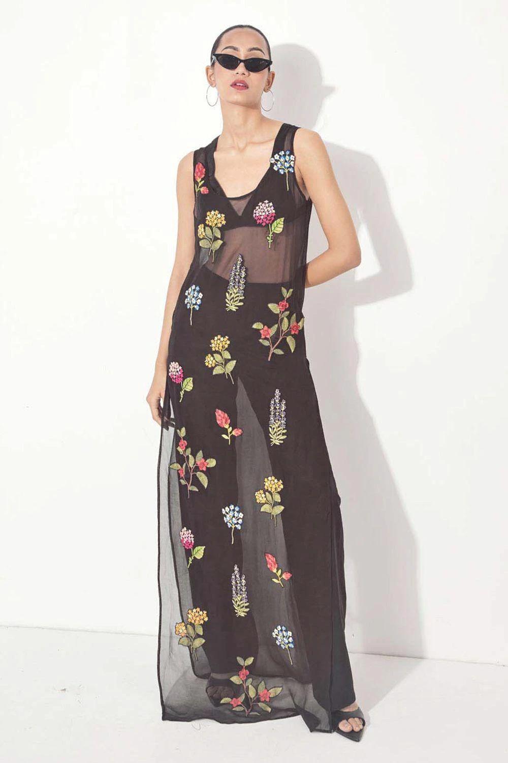 Step into the world of elegance with this hand-embroidered and appliqued floral black dress. The side slits add a touch of allure, while the front pleat jacket with gathered sleeves & pants elevate the ensemble to new heights of sophistication.