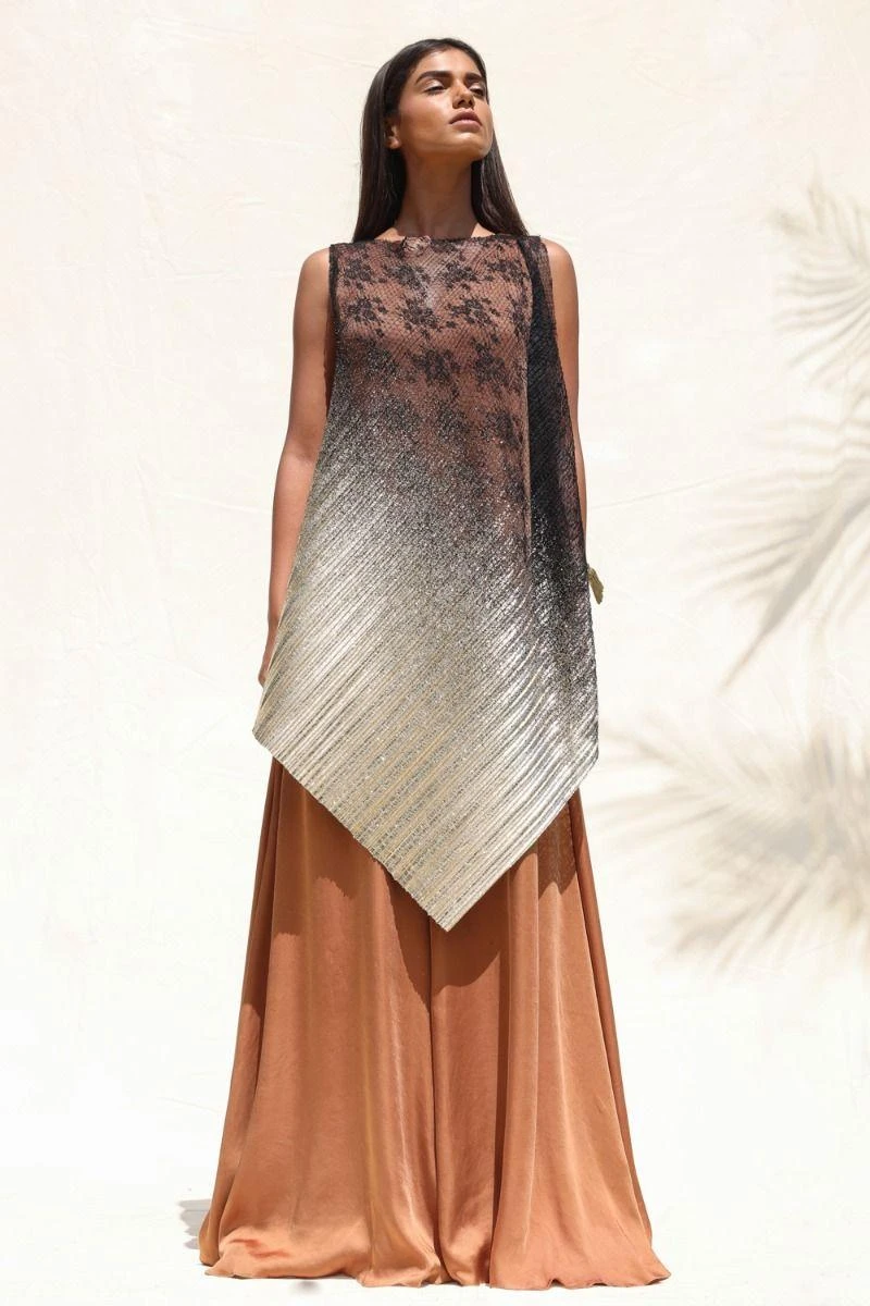 Look effortlessly stylish in this floor length jumpsuit. Crafted in taffeta, this flared jumpsuit comes with a black and gold drape in front. Add an pair of dangler earrings to complete the look.
