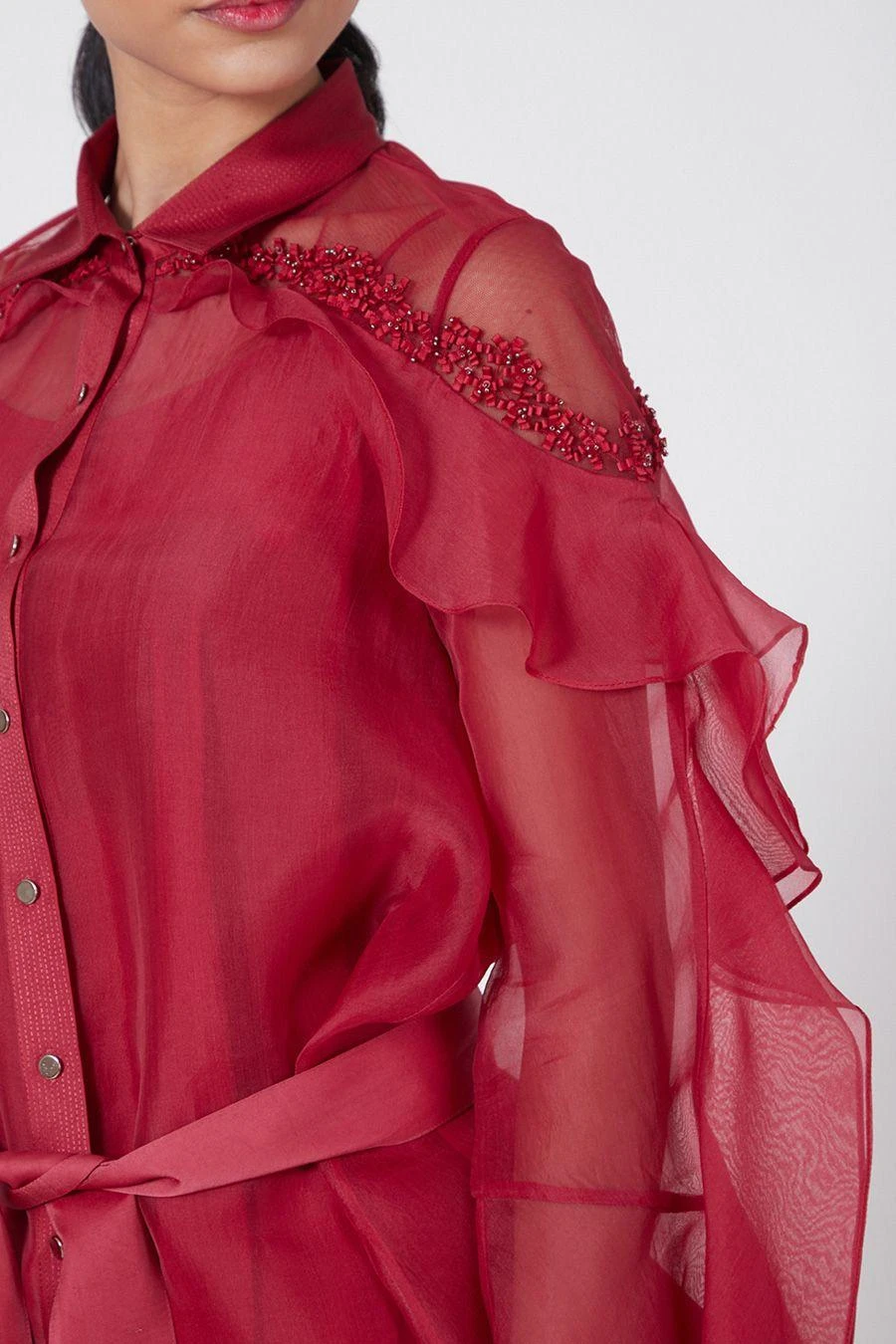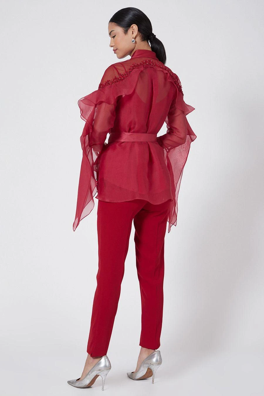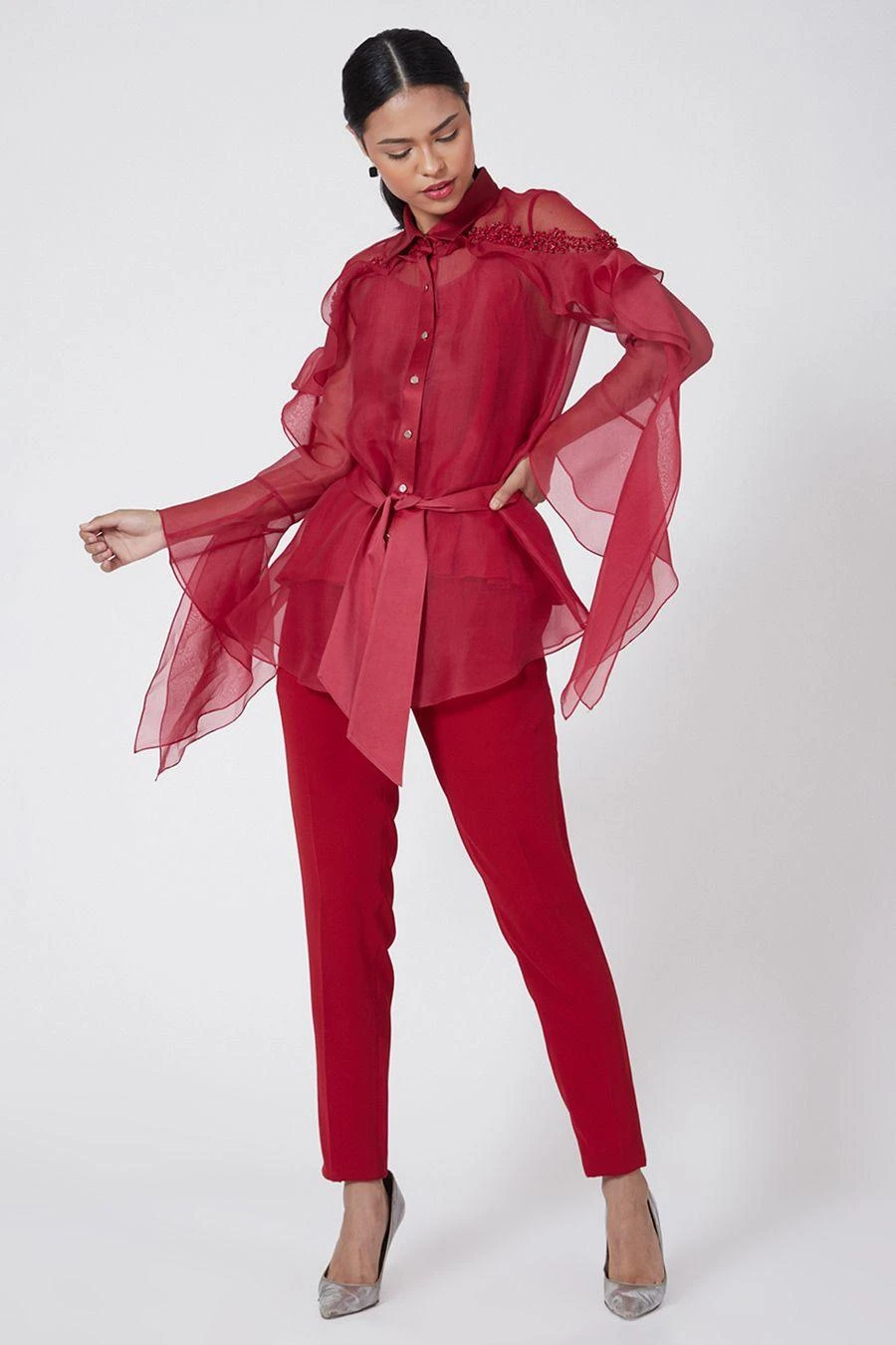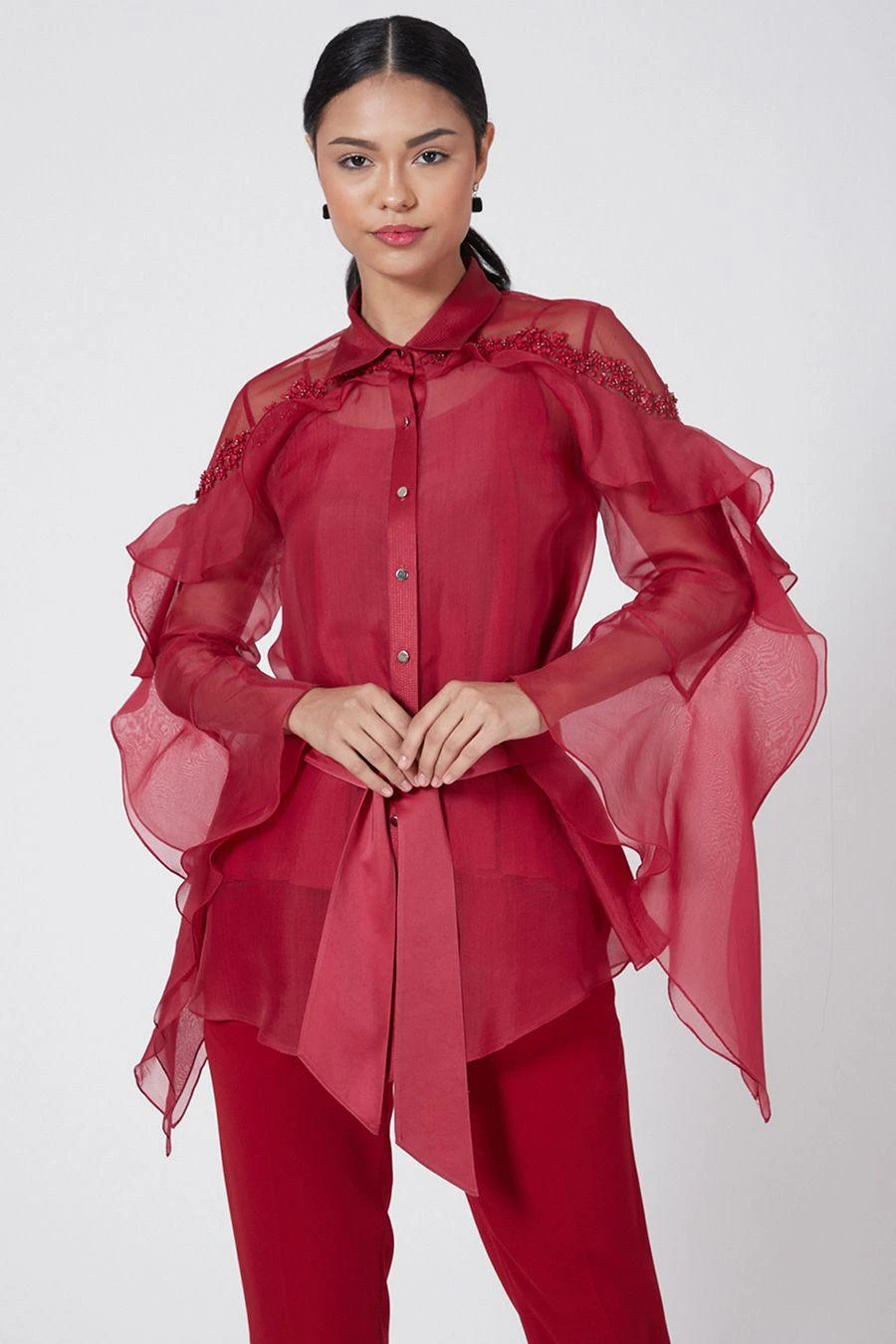 Look effortlessly stylish with this scarlet red top. Crafted in organza, this swing top features beaded embellishments and swirl sleeves. Pair it with red pants to complete the set.
