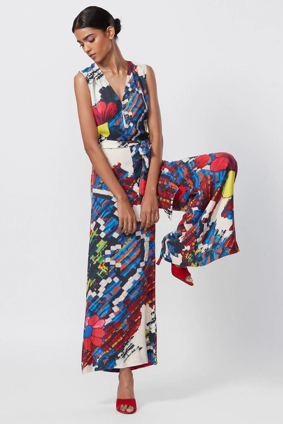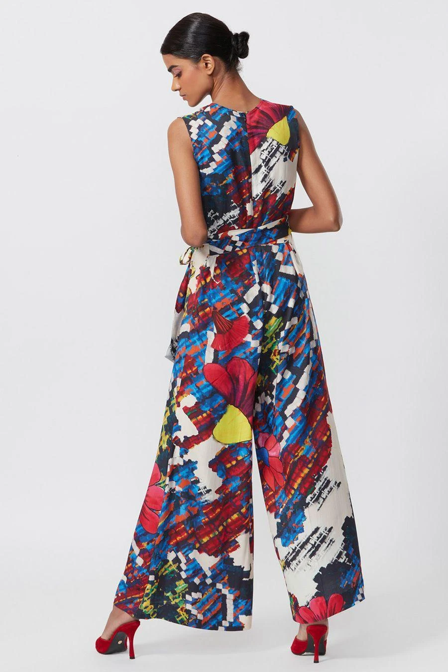 Add a layer of statement and glamour to your resort getaways with this jumpsuit. Crafted in satin, this sleeveless jumpsuit features an abstract floral print with an attached belt. Add a pair of dangler earrings to complete the look.
