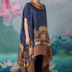 Elevate your style with this Periwinkle Bandhani Print Kaftan, featuring a drawstring waist, adjustable sleeves, and customizable side slits.