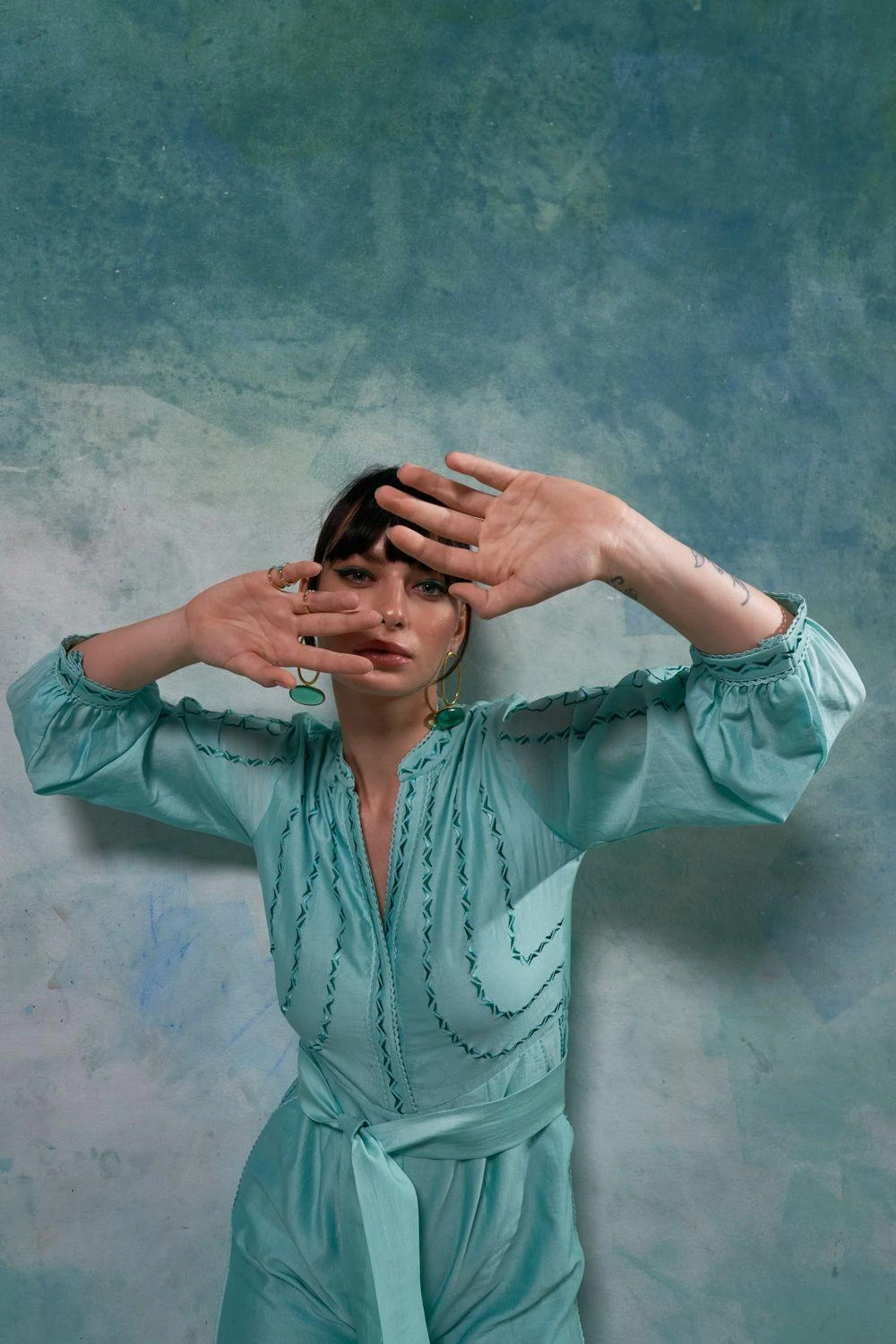 Indulge in the elegance of this V-neck band jumpsuit featuring exquisite embroidery and delicate lace detailing. The design extends to the front & sleeves, while the wide-leg bottom boasts intricate embroidery & lace with a side slit for added charm.