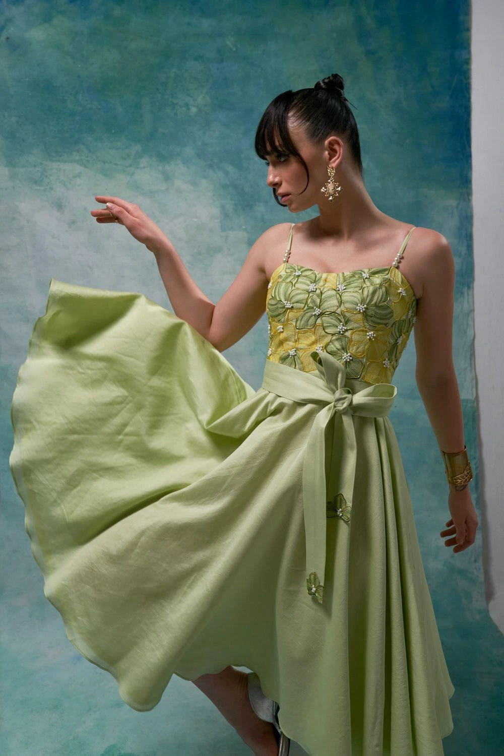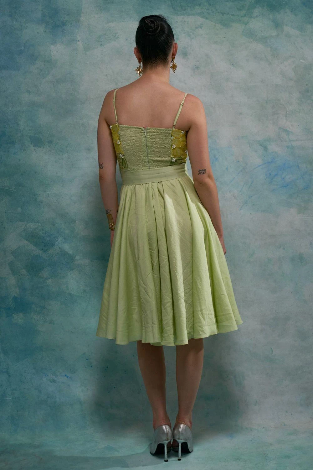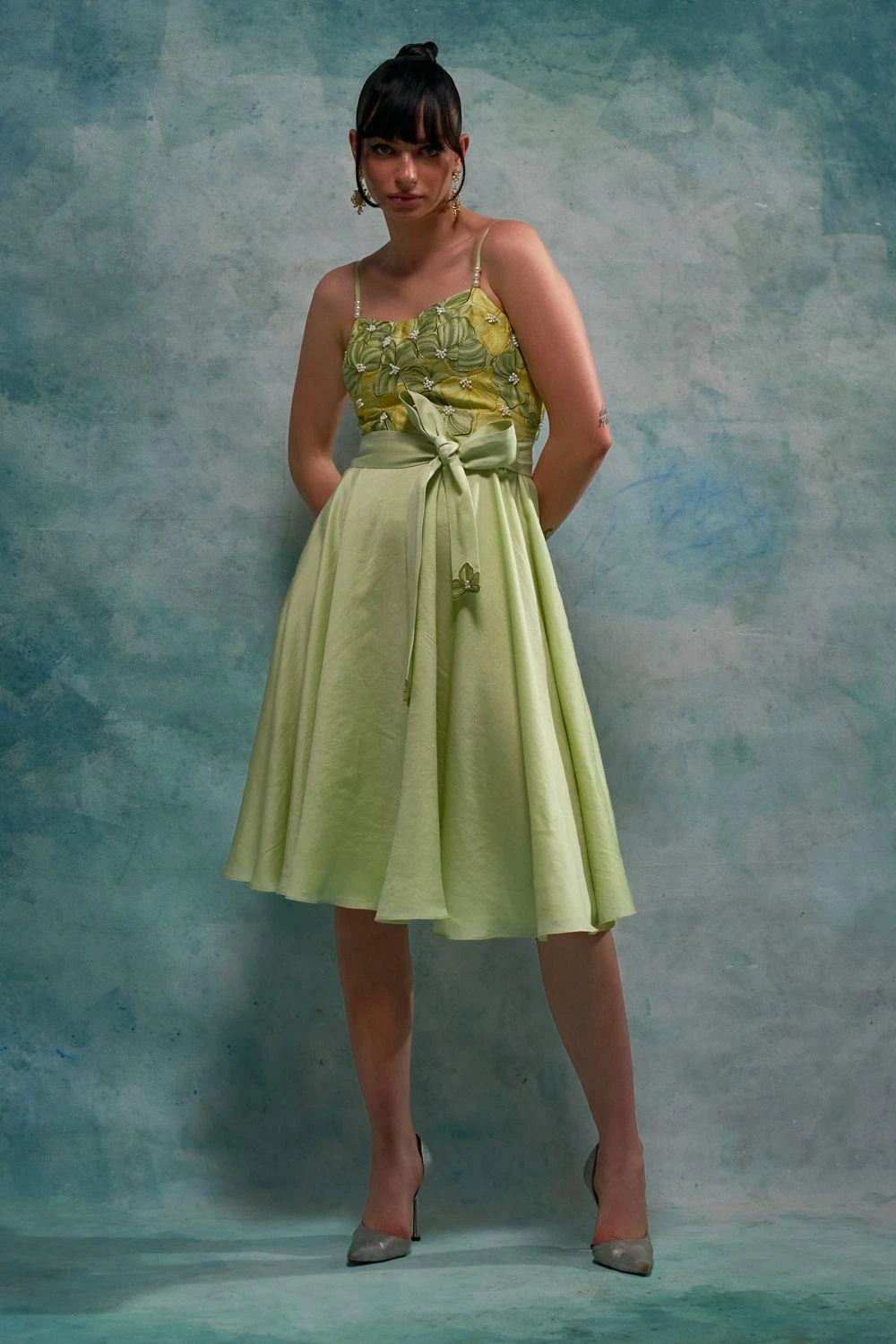 Immerse in luxury with a hand-embroidered corset dress, boasting circular flare & slender adjustable straps. The elasticated back, complemented by a discreet zipper, is paired with an accompanying beltùa tale of sophistication in every stitch.