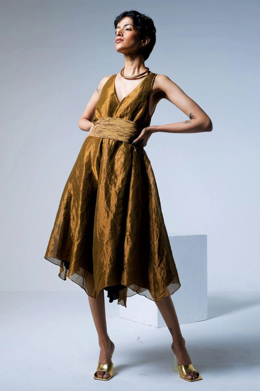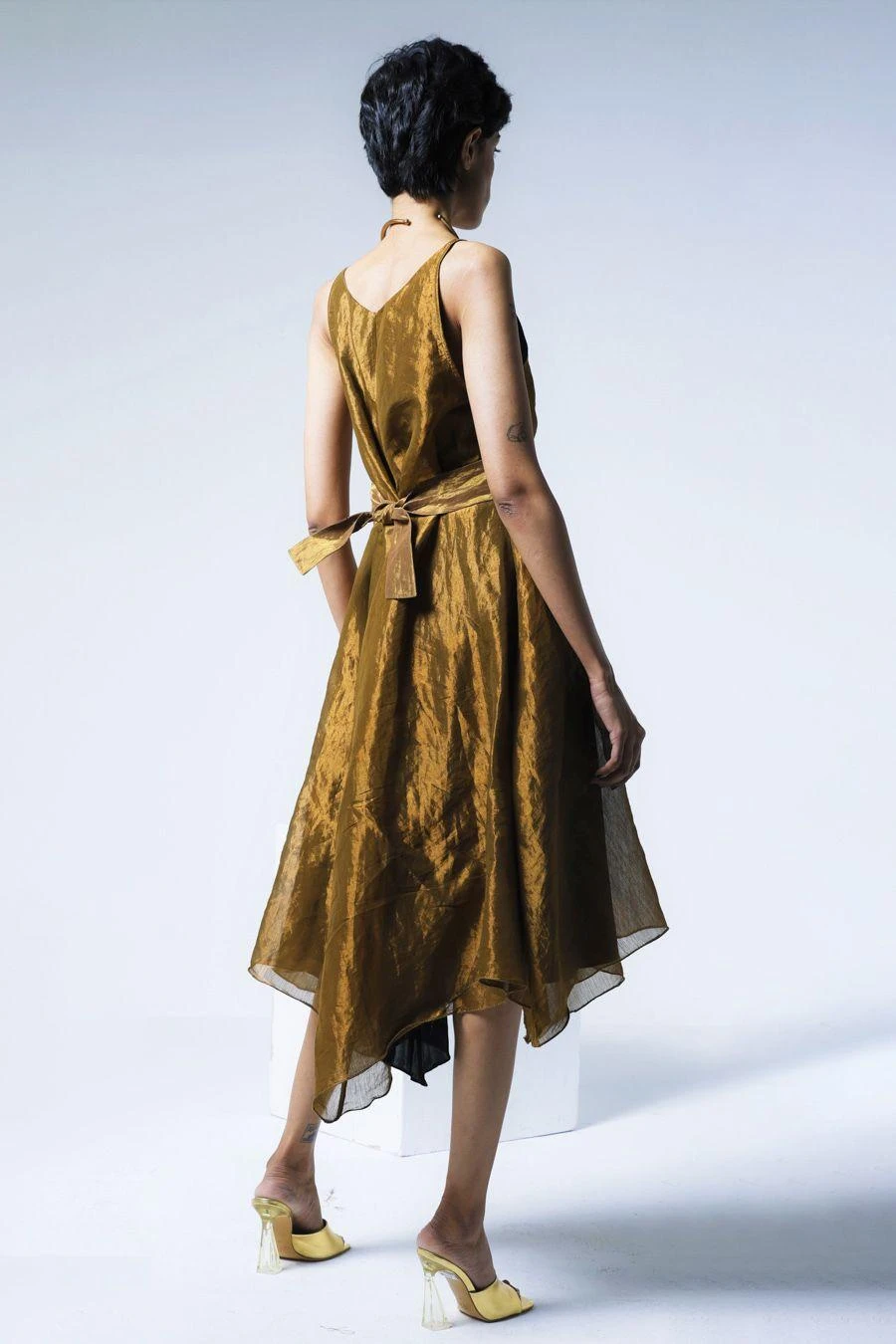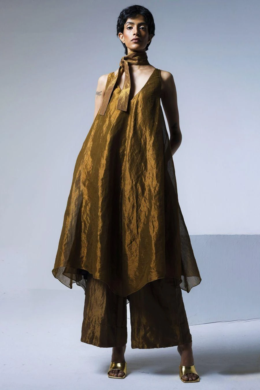 From your work desk to the brunch table & from lounging at home to catching flights, you can always count on this tunic. Crafted in handloom tissue, this strappy tunic features a V-neck & asymmetric hemline and is paired with a coordinating belt.