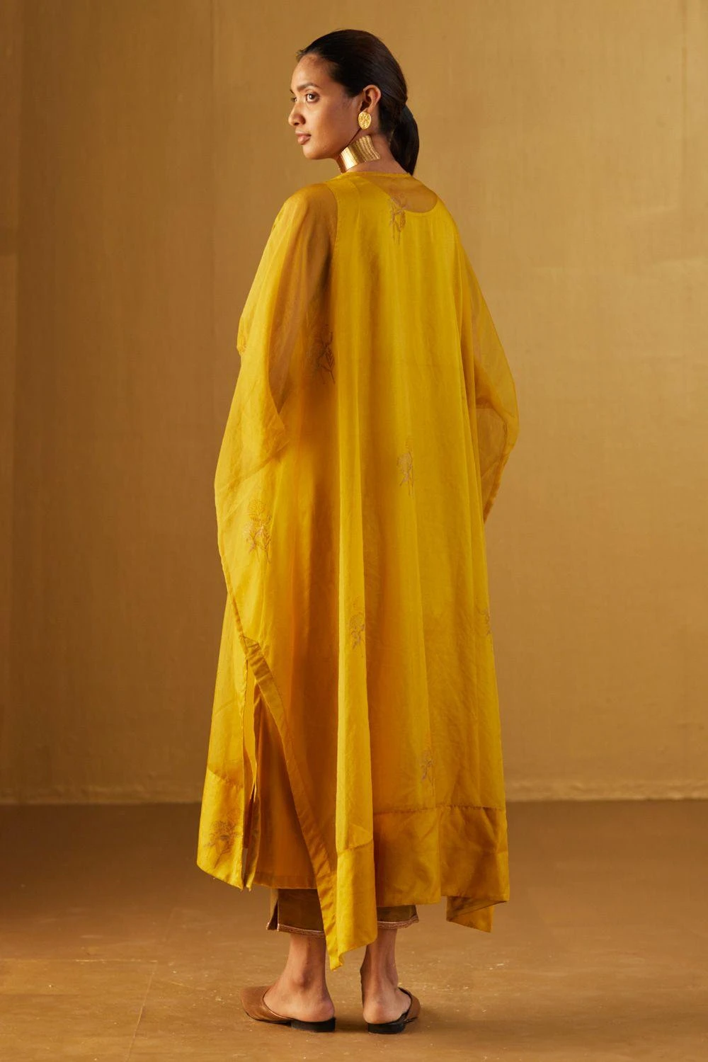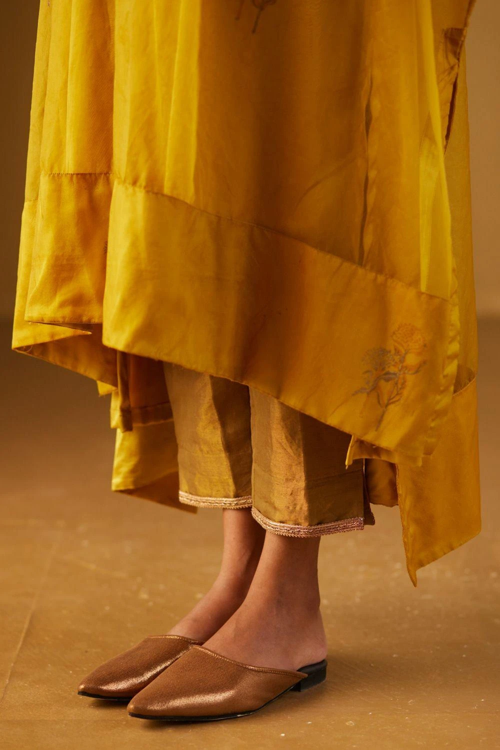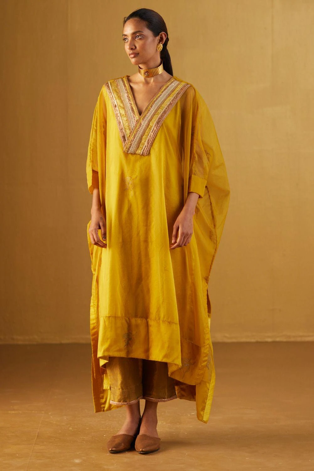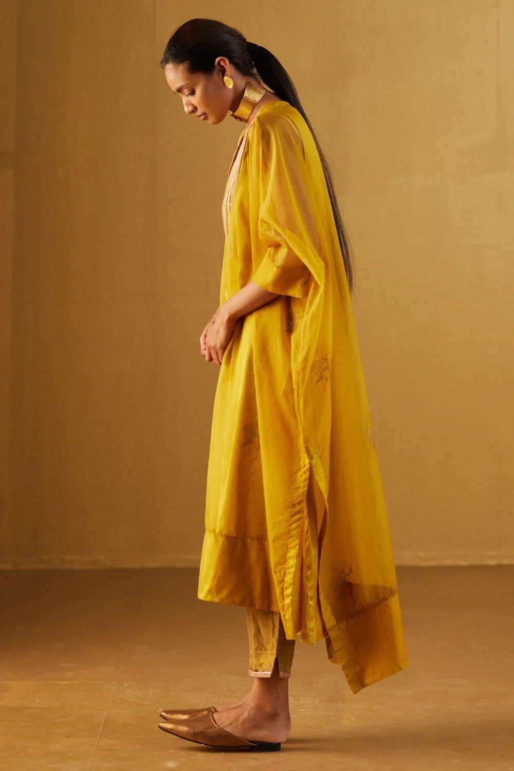 Indulge in the timeless charm of the Waahida Kaftan, crafted in vibrant ochre hand-blocked organza, accompanied by a lustrous gold tissue pant. A perfect fusion of simplicity and elegance, this ensemble is your ultimate choice for parties and events.