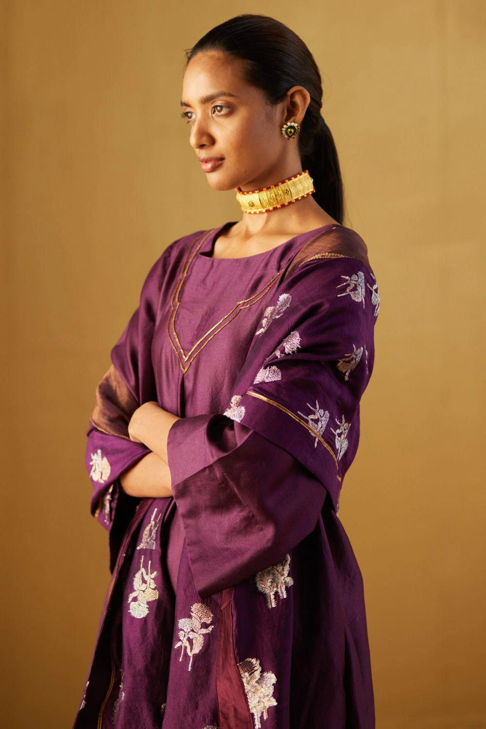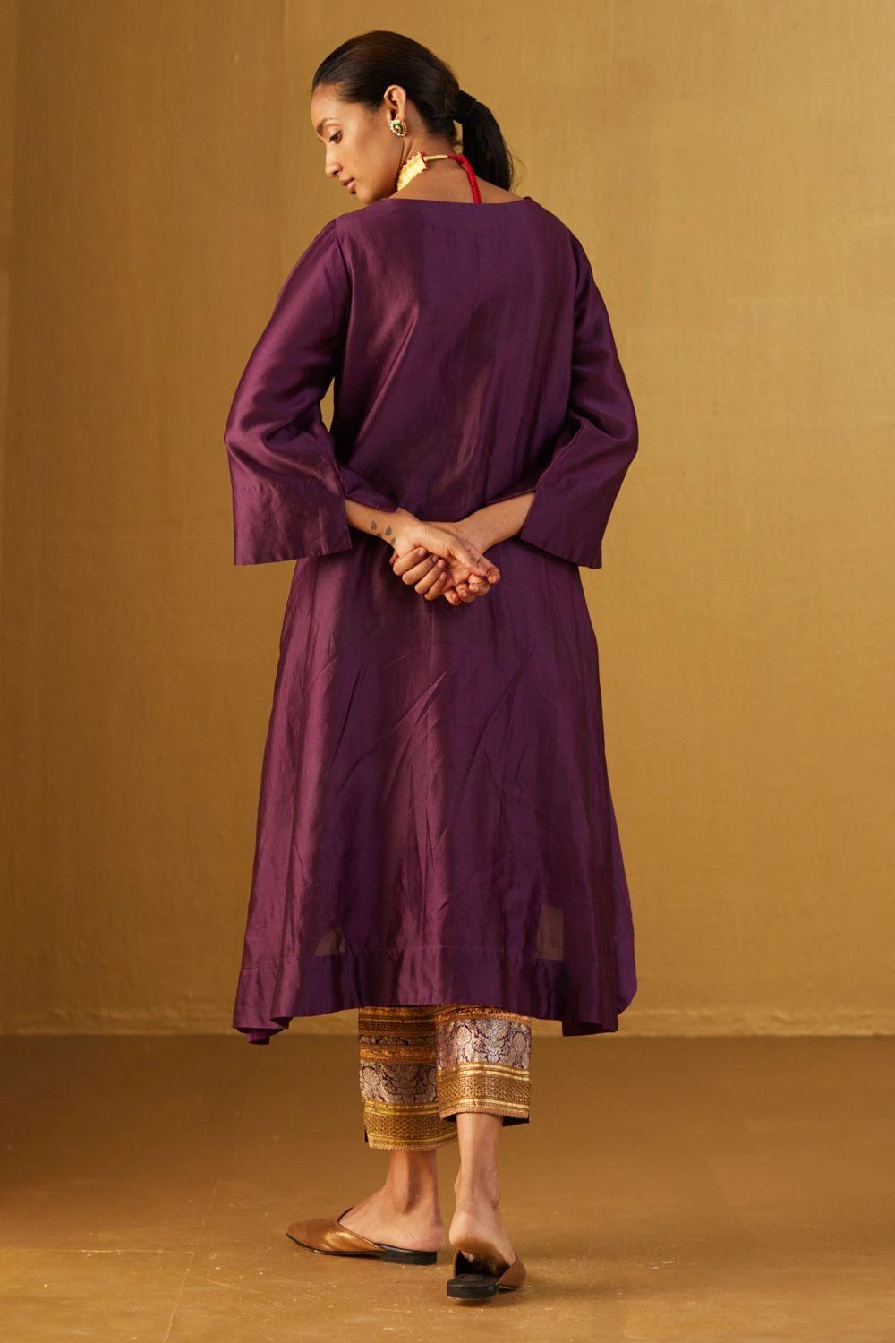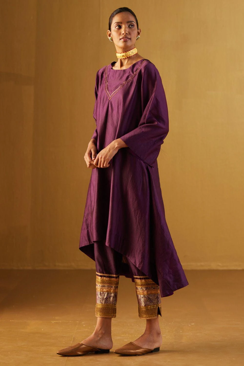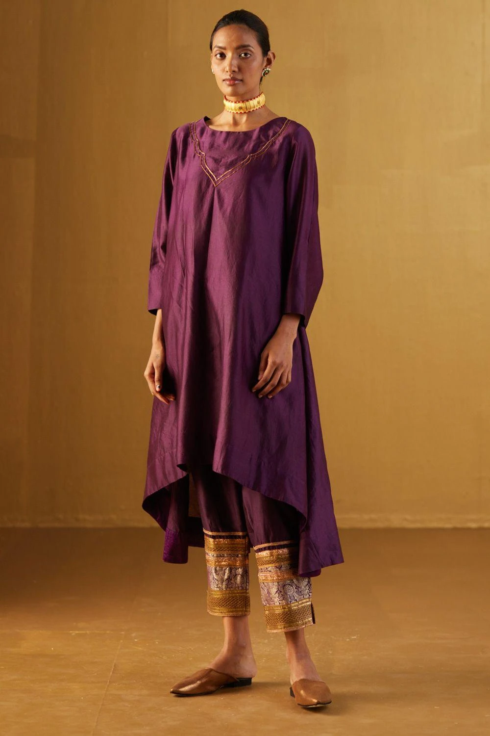 Immerse yourself in festive fervor with this Oonch Neech Kurta, graced by intricate Mehraab embroidery on the neckline. Paired elegantly with Gota Chanderi pants, it’s your ideal choice for any special occasion.