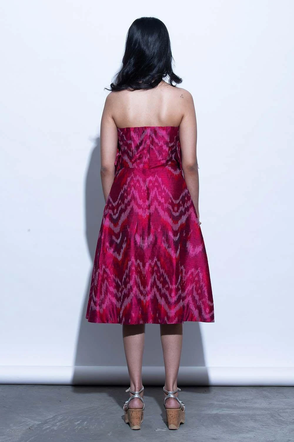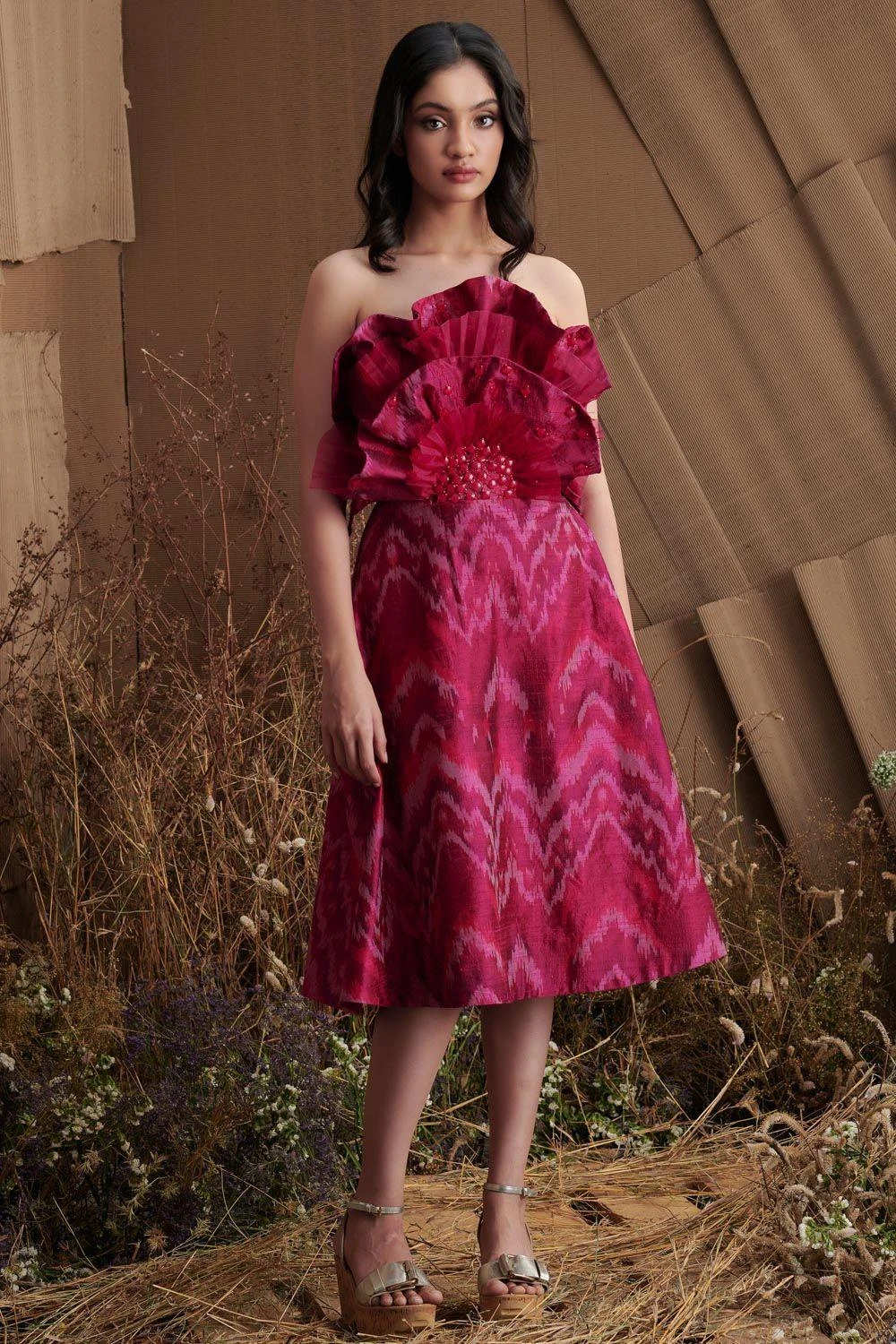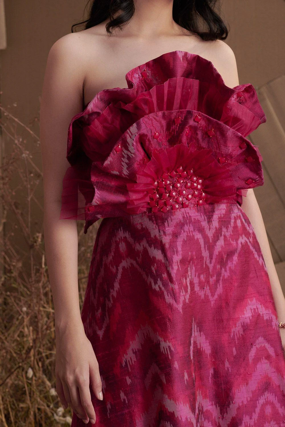 A majestic ode to textile, silhouette and futuristic embroidery. This ikat dress features dramatic ruffling on the bodice adorned with dainty embellishments. The skirt has a fit & flare form woven in ikat silk.