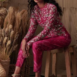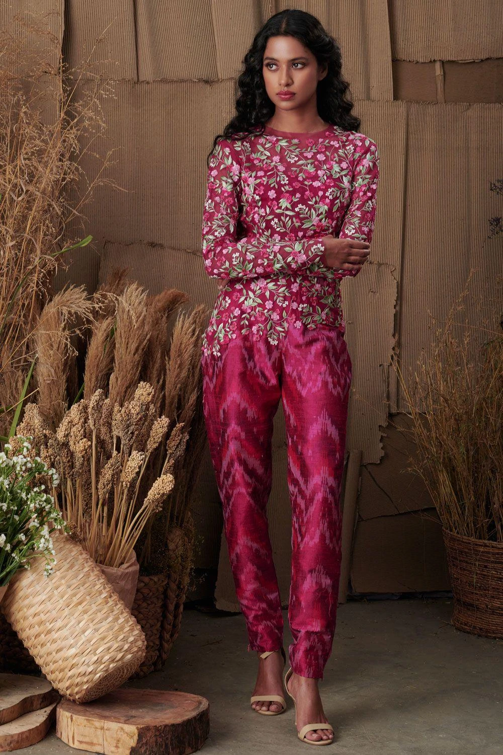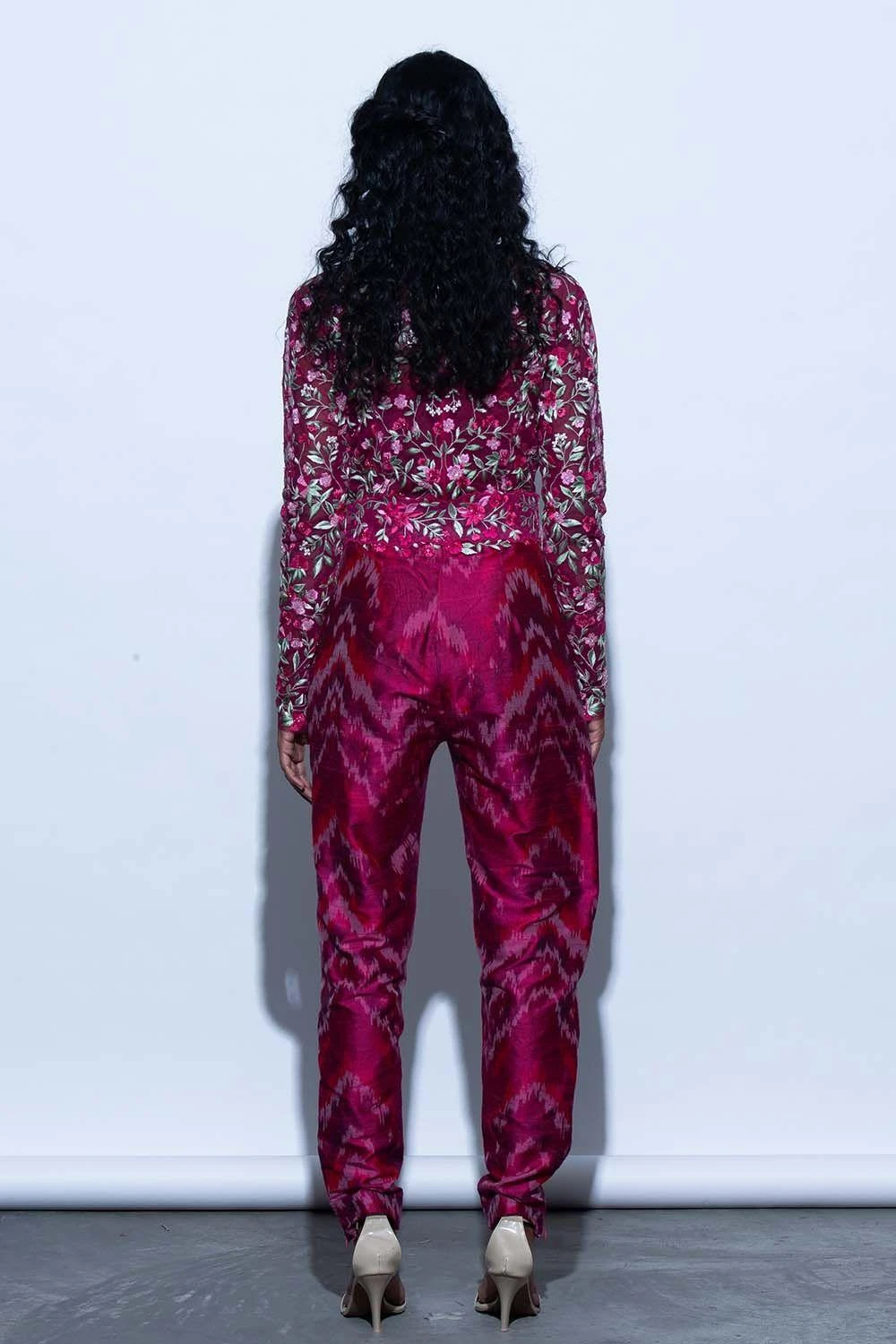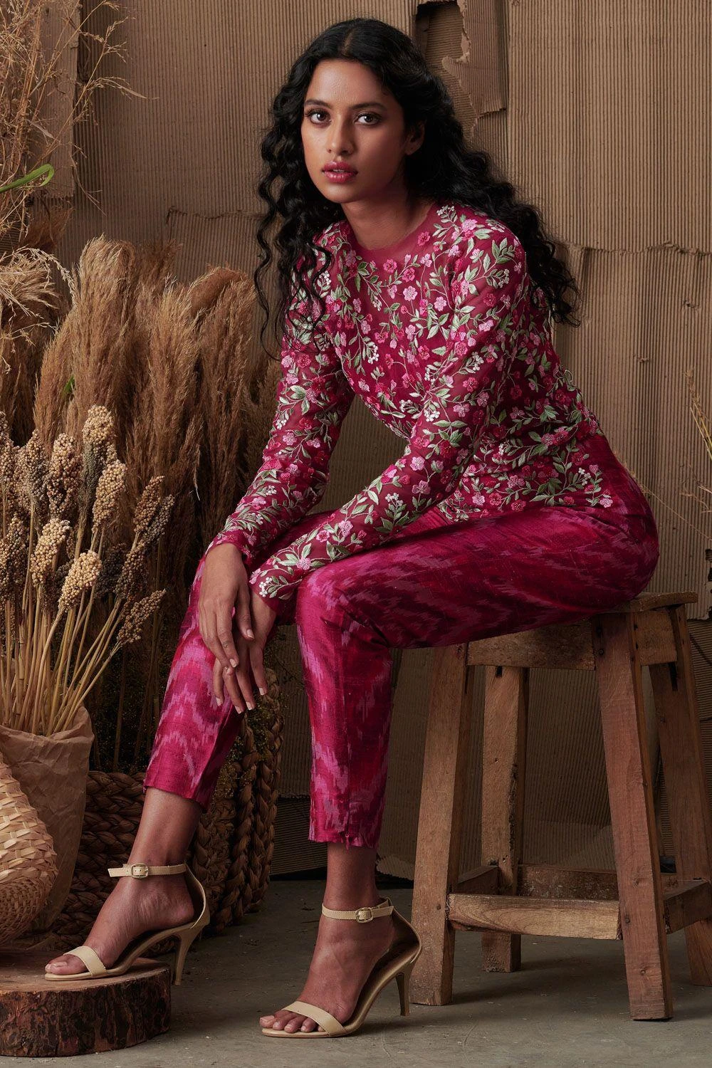 Our dream silhouette has just turned more dreamy. This effortless jumpsuit embraces beautiful toned embroidery on the bodice. The bottom part has been kept minimal, woven in silk ikat. A debonair mix of colors, embroidery, and textile.
