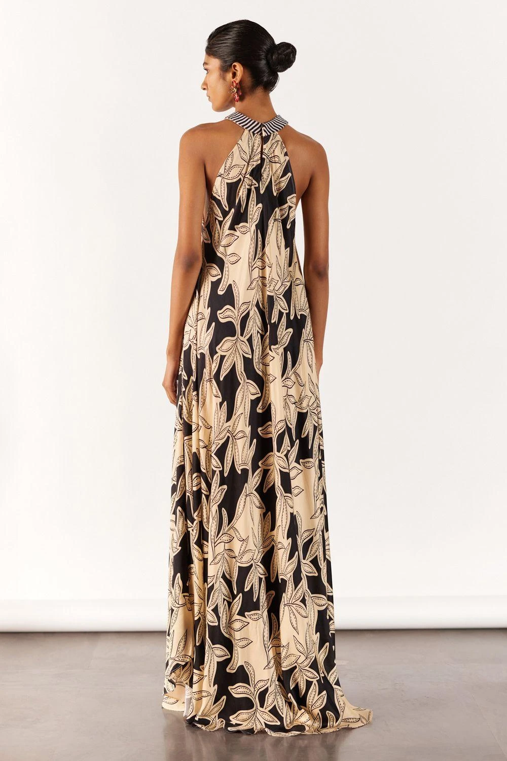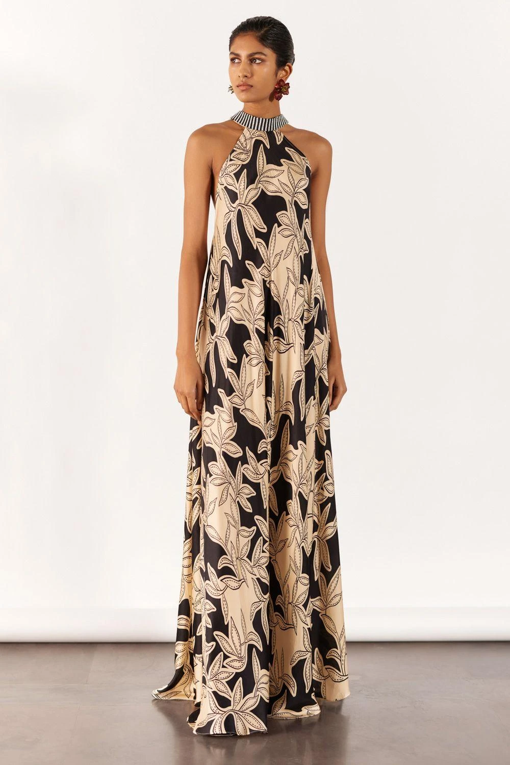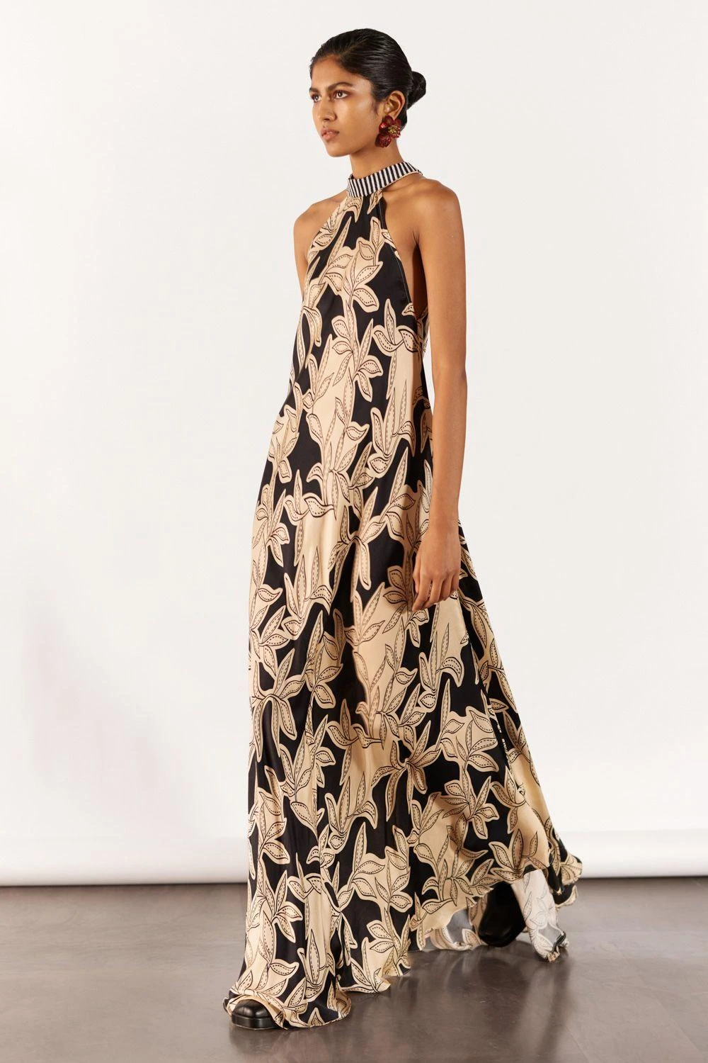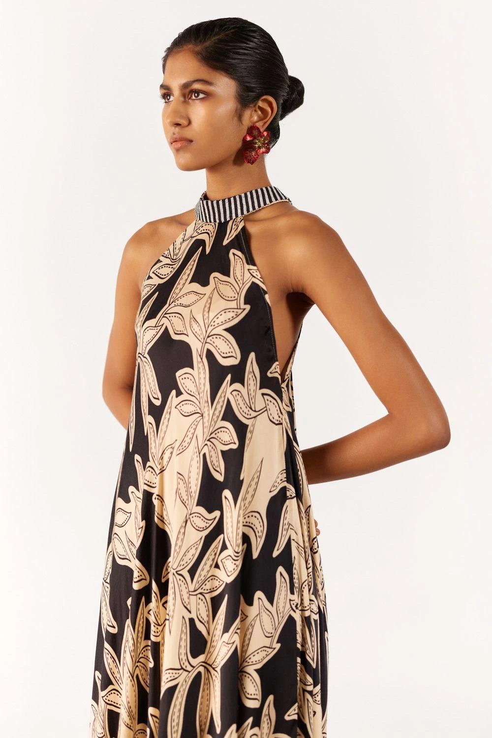 Embrace allure in the vegan silk Hazel Halter Dress. A seasonal stunner in hand-drawn hazel print with a chic hand-beaded striped collar. Versatile and elegant, designed for effortless styling with heels.